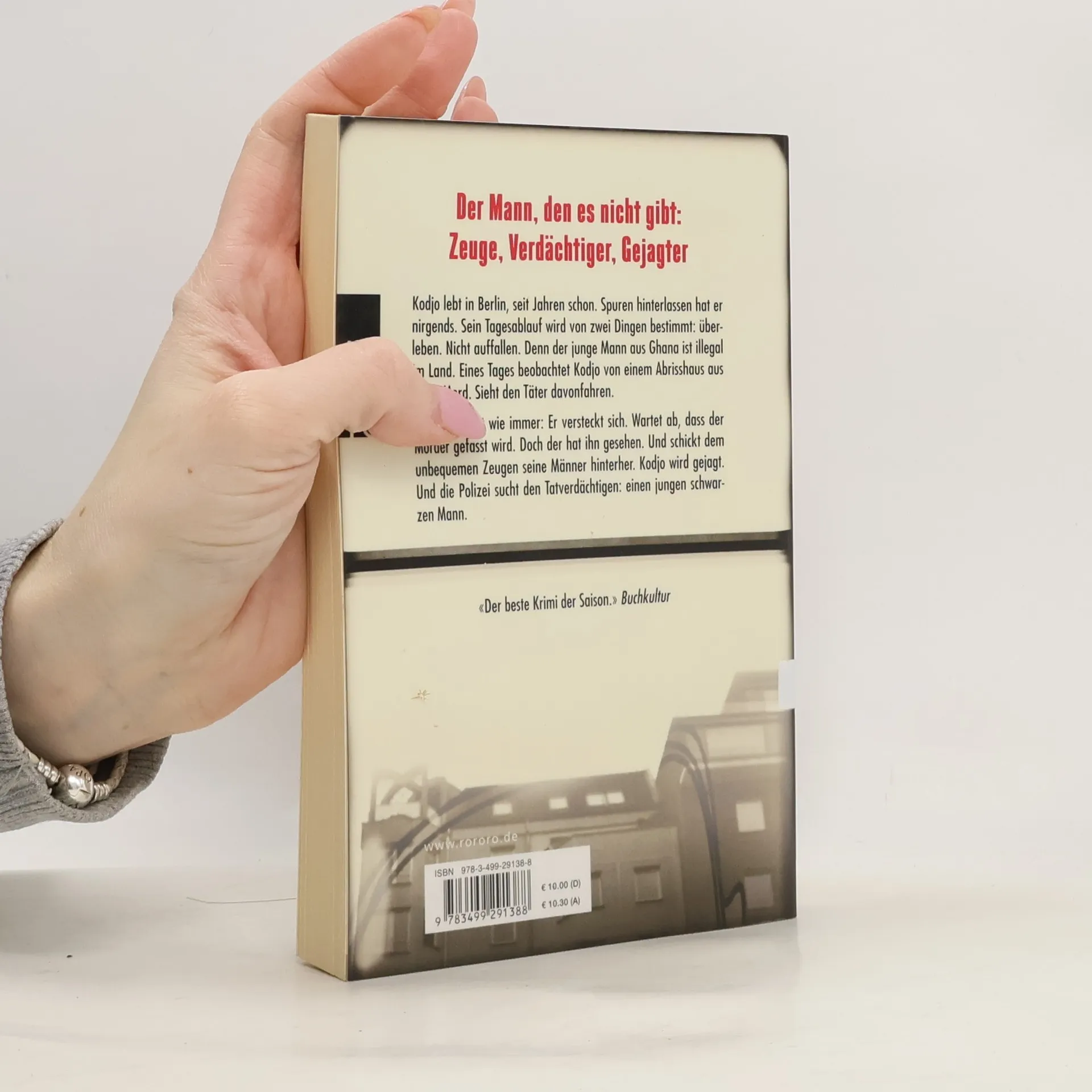 Der Mann, den es nicht gibt: Zeuge, Verdächtiger, Gejagter Kodjo lebt in Berlin, seit Jahren schon. Spuren hinterlassen hat er nirgends. Sein Tagesablauf wird von zwei Dingen bestimmt: Überleben. Nicht auffallen. Denn der junge Mann aus Ghana ist illegal im Land. Eines Tages beobachtet Kodjo von einem Abrisshaus aus einen Mord. Sieht den Täter davonfahren. Kodjo reagiert wie immer: Er versteckt sich. Wartet ab, dass der Mörder gefasst wird. Doch der hat ihn gesehen. Und schickt dem unbequemen Zeugen seine Männer hinterher. Kodjo wird gejagt. Und die Polizei sucht den Tatverdächtigen: Einen jungen schwarzen Mann.