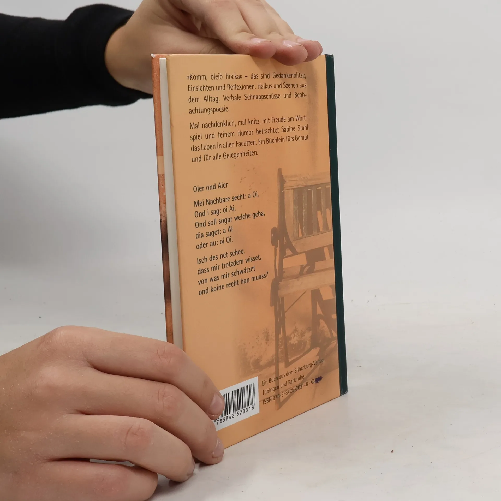 »Komm, bleib hocka«: Das sind schwäbische Gedankenblitze, Einsichten und Reflexionen. Dialektische Haikus und dialektale Szenen aus dem Alltag. Verbale Schnappschüsse, Beobachtungspoesie. Mal nachdenklich, mal knitz, mit Freude am Wortspiel und feinem Humor betrachtet Sabine Stahl das Leben in allen Facetten. Ein Büchlein fürs schwäbische Gemüt und für alle Gelegenheiten. Oier ond Aier Mei Nachbare secht: a Oi. Ond i sag: oi Ai. Ond soll sogar welche geba, dia saget: a Ai. oder au: oi Oi. Isch des net schee, dass mir trotzdem wisset, von was mir schwätzet ond koine recht han muass?