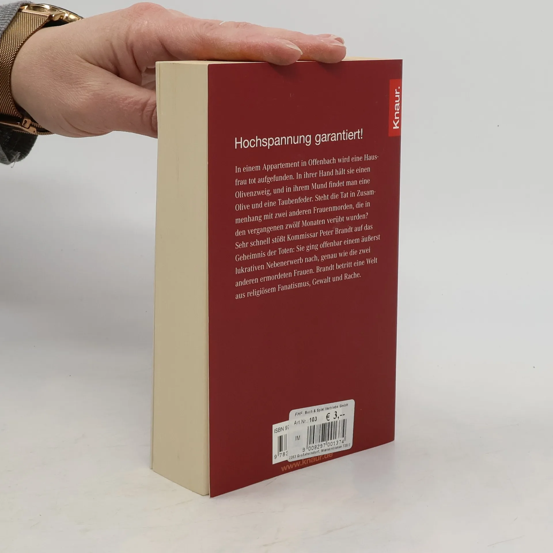 Kommissar Peter Brandt ist gerade aus einem Kurzurlaub mit seiner Freundin, der Staatsanwältin Elvira Klein, zurück, als er mit einem besonders seltsamen Mordfall konfrontiert wird. Am Mainufer in Offenbach wird eine Hausfrau tot aufgefunden. Das Merkwürdige daran: In ihrer Hand hält sie einen Olivenzweig, und in ihrem Mund findet man eine Olive und eine Taubenfeder. Sehr schnell stößt der Kommissar auf das Geheimnis der Toten: Sie ging offenbar einem äußerst lukrativen Nebenerwerb nach, genau wie zwei weitere Frauen, die in den letzten zwölf Monaten ermordet wurden. Peter Brandt betritt eine Welt aus religiösem Fanatismus, Gewalt und Rache.