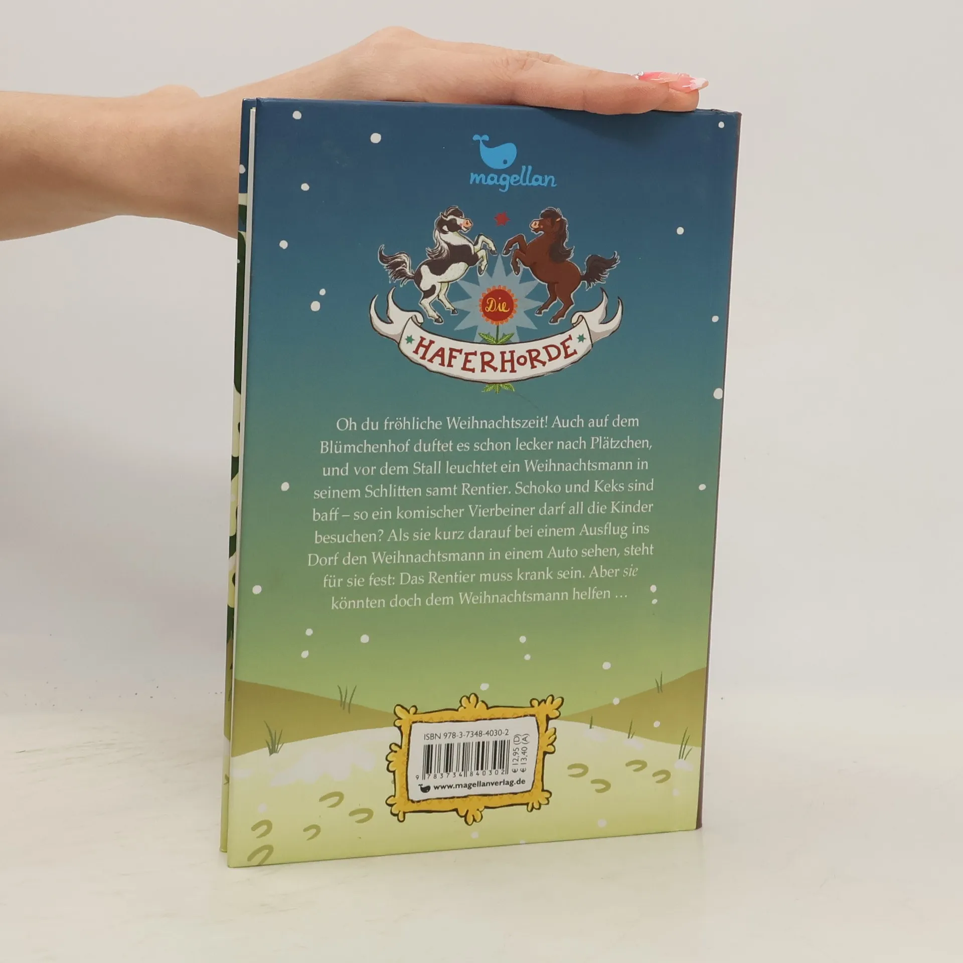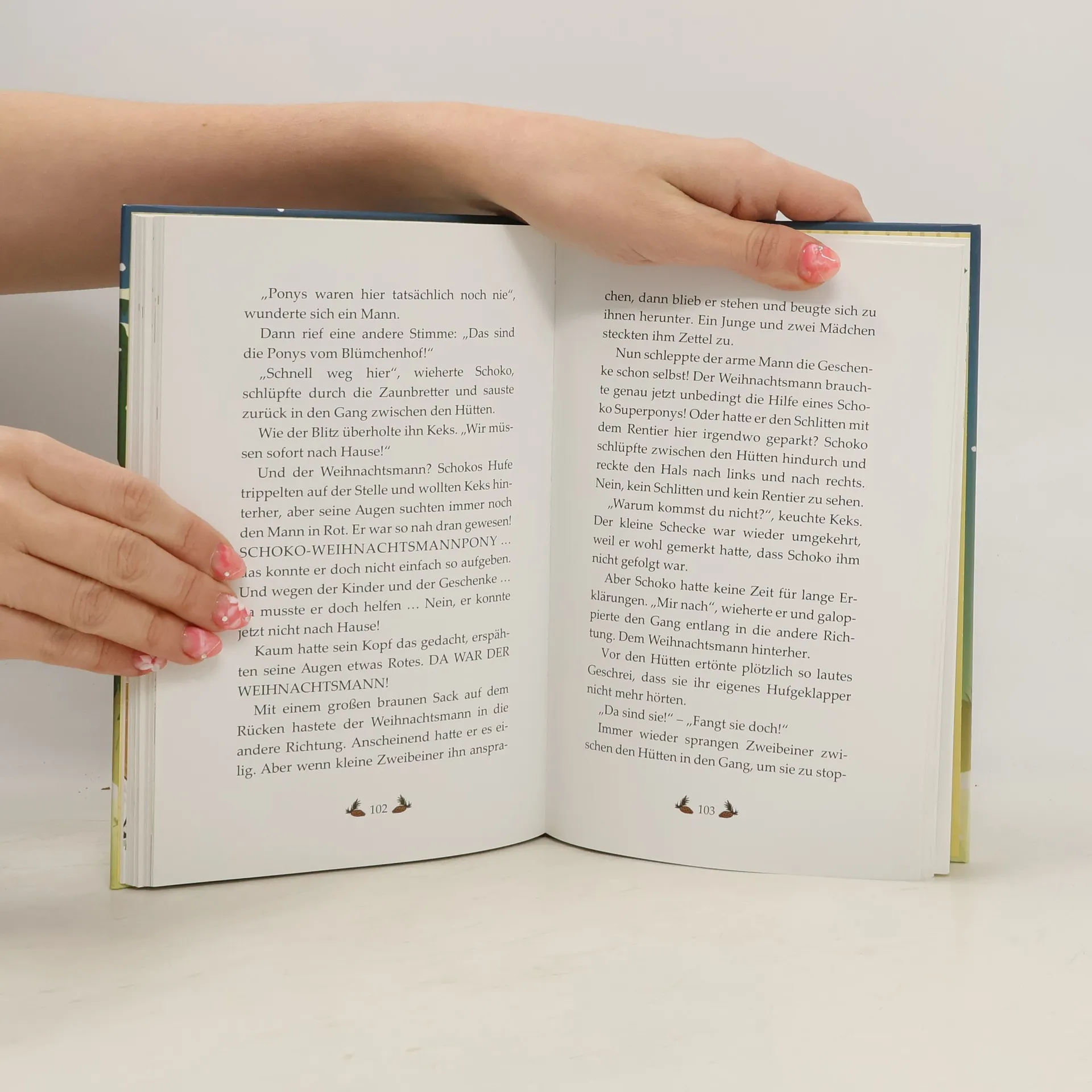 Weihnachten steht vor der Tür. Auch auf dem Blümchenhof wird eifrig gebacken und geschmückt, und im Hof hat Maria eine Riesendeko aufgebaut: der Weihnachtsmann in seinem Schlitten samt Rentier. Schoko und Keks sind baff – so ein komischer Vierbeiner darf dem Weihnachtsmann helfen? Als sie kurz darauf bei einem Ausflug ins Dorf den Weihnachtsmann in einem Auto sehen, ist für sie klar: Das Rentier muss krank sein. Oje, wer bringt denn dann die Geschenke zu den Kindern? Wie gut, dass Schoko und Keks echte Weihnachtsponys sind. SIE könnten doch den Schlitten ziehen! Aber dafür müssen sie den Weihnachtsmann erstmal finden …