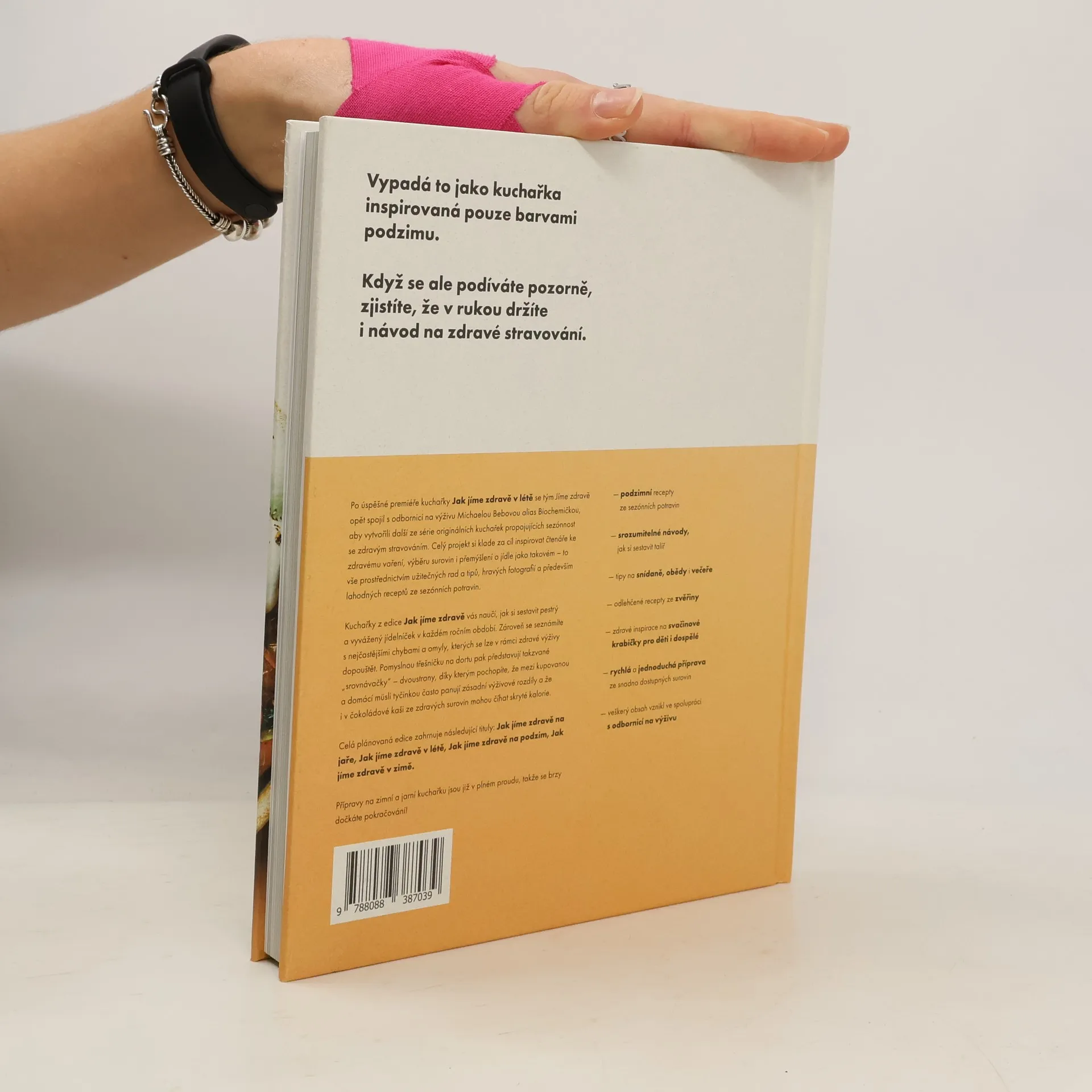 Kuchařka, nebo průvodce zdravým stravováním? Obojí! Kromě 94 sezónních receptů totiž v knize najdete celou řadu srozumitelných návodů a tipů, jak jíst zdravě. Zbrusu nový koncept je plný inspirace, překvapivého obsahu a nádherných fotografií, které vás hravou formou postupně vedou k tomu, abyste se naučili přemýšlet o skladbě jídla na talíři, výběru surovin nebo velikosti porcí. Pomocí knihy si snadno sestavíte vyvážený jídelníček, můžete jí ale i jen tak listovat a objevovat přitom nové chutě a zdravé kombinace. Ukážeme vám, že naše recepty nejsou žádná věda – většinu jídel připravíte do 30 minut, a to ze surovin, které seženete v běžném obchodě. Kuchařka plná podzimně laděných receptů přímo navazuje na Jak jíme zdravě v létě a skvěle tak rozšíří vaši sbírku – ať už hledáte nové recepty, nebo chcete proniknout do principů zdravého stravování. Na knize s námi spolupracovala odbornice na výživu RNDr. Michaela Bebová alias Biochemička.
