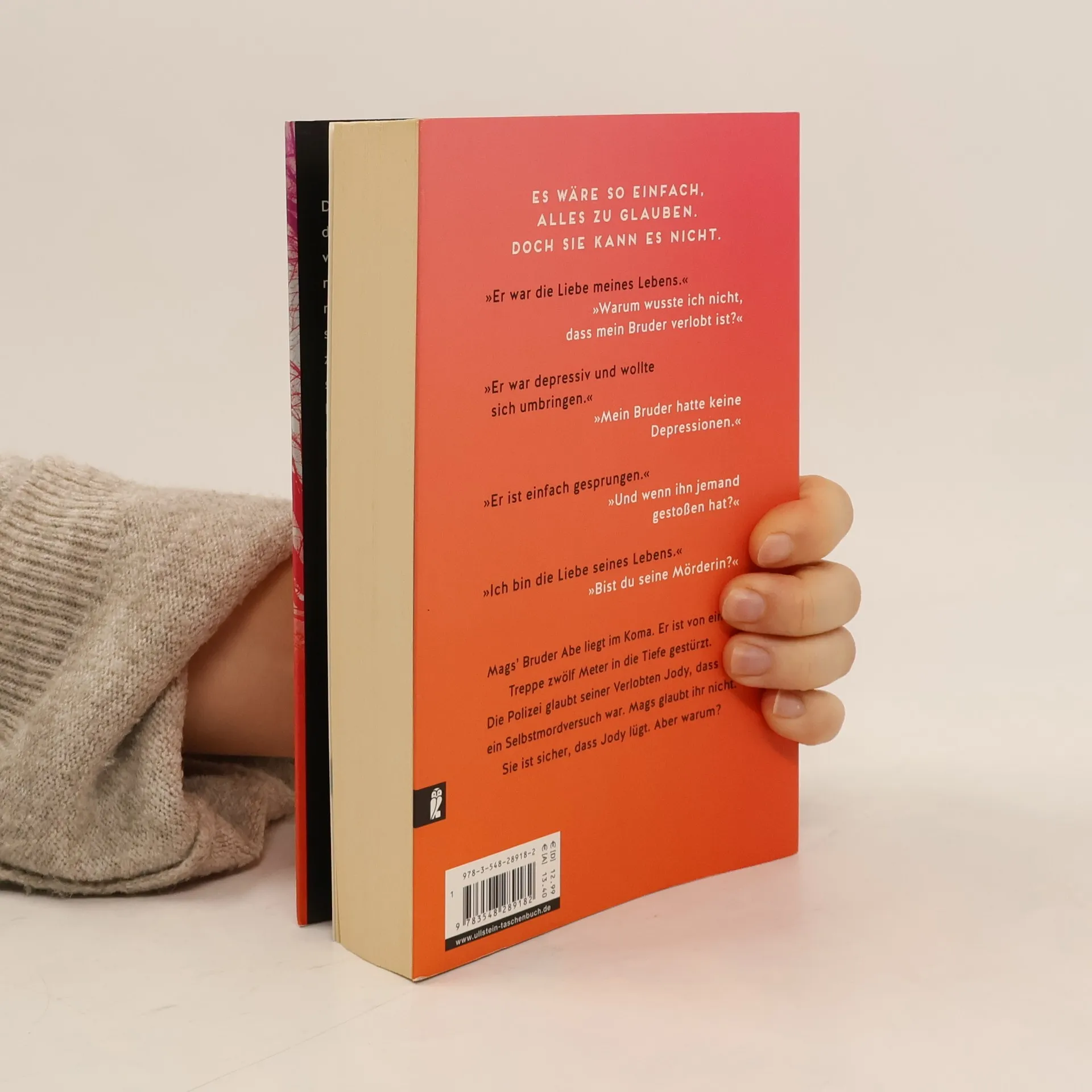 Zwei Frauen umkreisen einander in einem Netz aus Lügen. Wer ist Täter, wer ist Opfer? »Er war die Liebe meines Lebens.« »Warum wusste ich nicht, dass mein Bruder verlobt ist?« »Er war depressiv und wollte sich umbringen.« »Mein Bruder hatte keine Depressionen.« »Er ist einfach gesprungen.« »Und wenn ihn jemand gestoßen hat?« »Ich bin die Liebe seines Lebens.« »Bist du seine Mörderin?« Mags' Bruder Abe liegt im Koma. Er ist von einer Treppe zwölf Meter in die Tiefe gestürzt. Die Polizei glaubt seiner Verlobten Jody, dass es ein Selbstmordversuch war. Mags glaubt ihr nicht. Sie ist sicher, dass Jody lügt. Aber warum? Psychologisch raffinierte Spannung für die Fans von „Girl on the Train“ und „Die Witwe“.