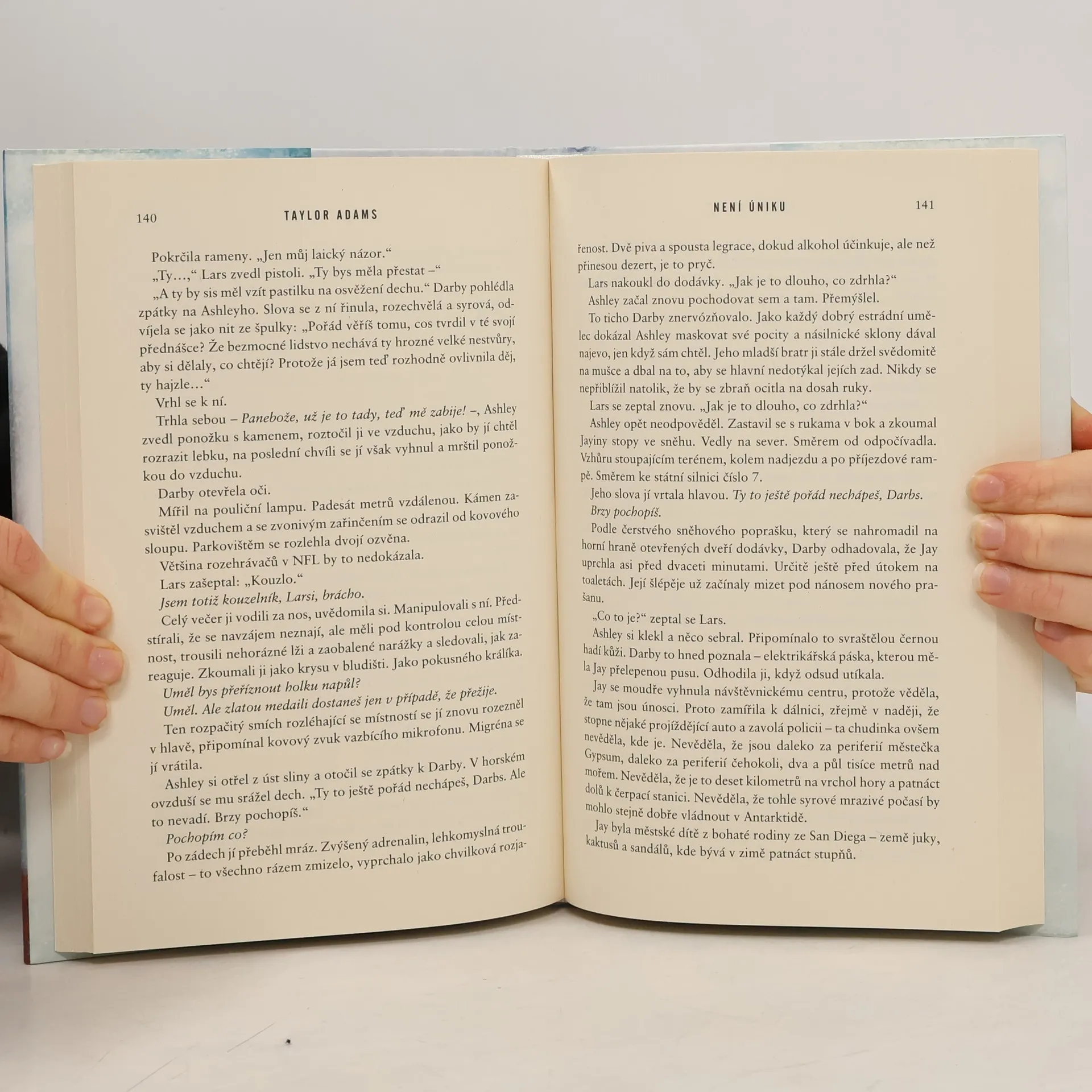 Studentka Darby Thorneová cestuje za svou nemocnou matkou. Kvůli sněhové bouři uvízne na dálnici uprostřed ničeho a je nucena strávit noc na odpočívadle se čtyřmi úplně cizími lidmi. Při hledání mobilního signálu si všimne ruky malé holčičky, která je zamčená v jednom ze zaparkovaných vozů. Bez spojení a bez jakékoli možnosti se odtamtud dostat musí Darby přijít na to, kdo z jejích neznámých společníků je dívčiným únoscem… Není úniku amerického spisovatele Taylora Adamse byl přeložen už do 24 jazyků a je jedním z nejnapínavějších thrillerů, jaké jste kdy měli možnost si přečíst. Šokující zvraty, výborně propracované postavy a nečekané zápletky vám nedovolí se od něj odtrhnout, dokud nezjistíte, jak to dopadne!
