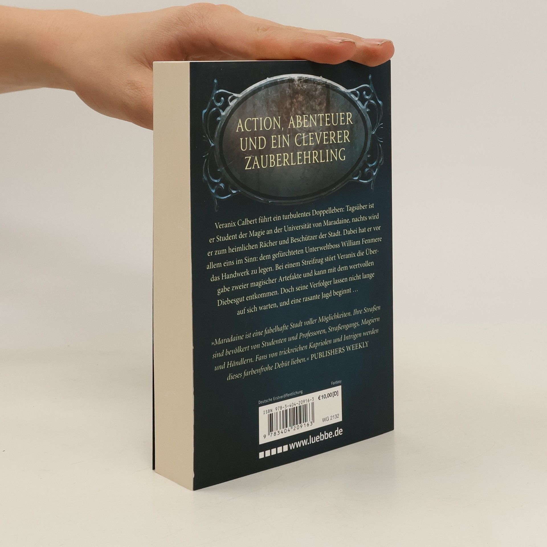 Veranix Calbert führt ein aufregendes Doppelleben: Tagsüber ist er ein Student der Magie an der Universität von Maradaine, nachts klettert er über die Dächer der Stadt als heimlicher Rächer. Eines Nachts stört Veranix die Übergabe einer geheimnisvollen Lieferung und entkommt mit dem Diebesgut. Doch nicht nur der Unterweltboss Fenmere will seine kostbare Ware zurückhaben. Bald machen auch diverse Straßengangs, mächtige Magier und gedungene Meuchelmörder Jagd auf Veranix ... Band 1 der fantastischen Reihe „Die Chroniken von Maradaine“ „Maradaine ist eine fabelhafte Stadt voller Möglichkeiten. Ihre Straßen sind bevölkert von Studenten und Professoren, Straßengangs, Magiern und Händlern. Fans von trickreichen Kapriolen und Intrigen werden dieses farbenfrohe Debüt lieben.“ Publishers Weekly