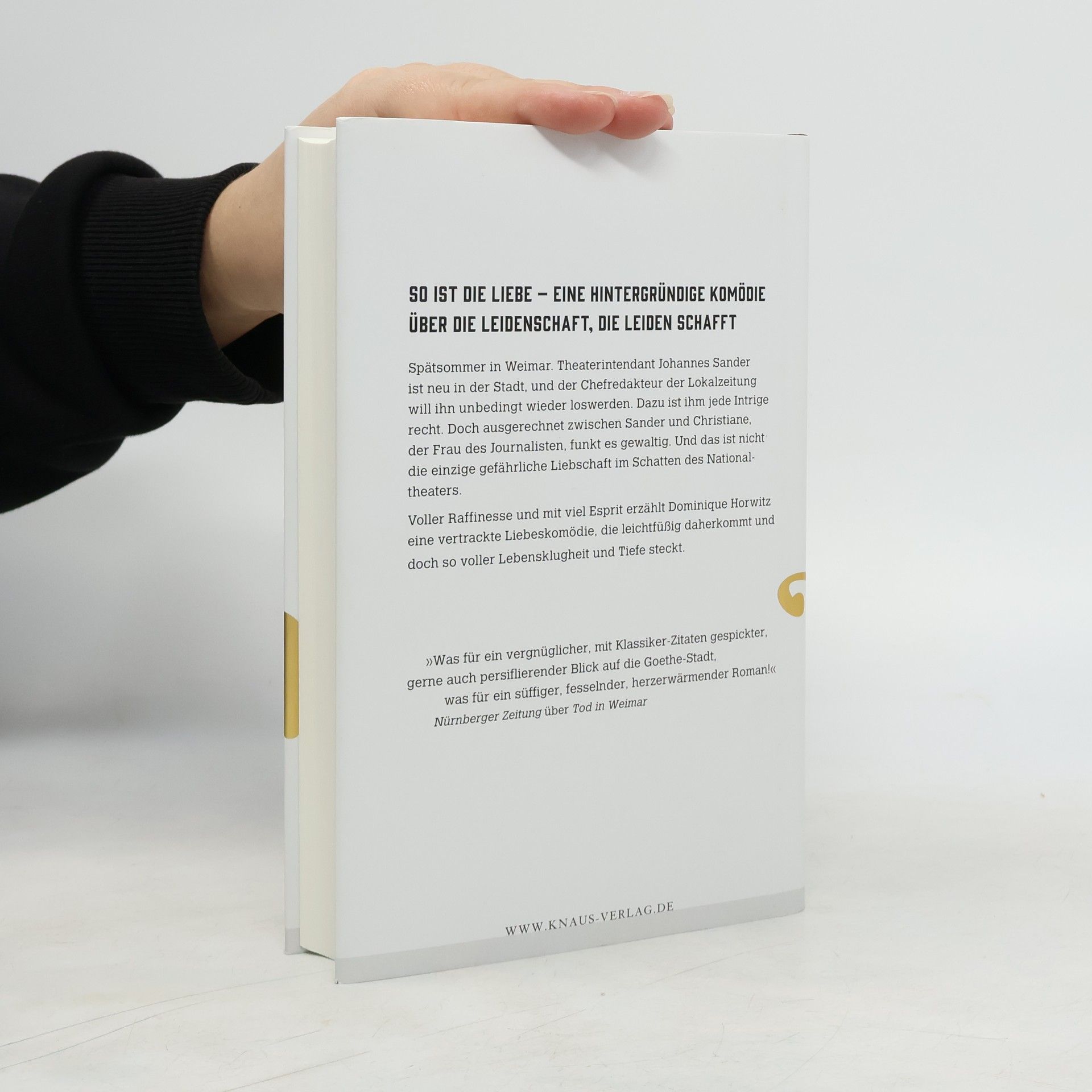 Über die ach so verschiedenen Spielarten der Liebe - raffiniert und lebensklug erzählt Spätsommer in Weimar. Theaterintendant Johannes Sander ist neu in der Stadt, aber die Kulturschickeria, voran der Chefredakteur der Lokalzeitung, will ihn wieder loswerden. Dazu ist jede Intrige recht. Doch ausgerechnet zwischen Sander und Christiane, der Frau des Journalisten, funkt es gewaltig: Das ist nicht die einzige gefährliche Liebschaft im Schatten des Nationaltheaters. In der jungen Ehe von Sanders Freund Roman Kaminski kriselt es, und dessen Adoptivtochter verliebt sich das allererste Mal. Lebensklug und mit viel Esprit erzählt Dominique Horwitz von den ach so verschiedenen Spielarten der Liebe.