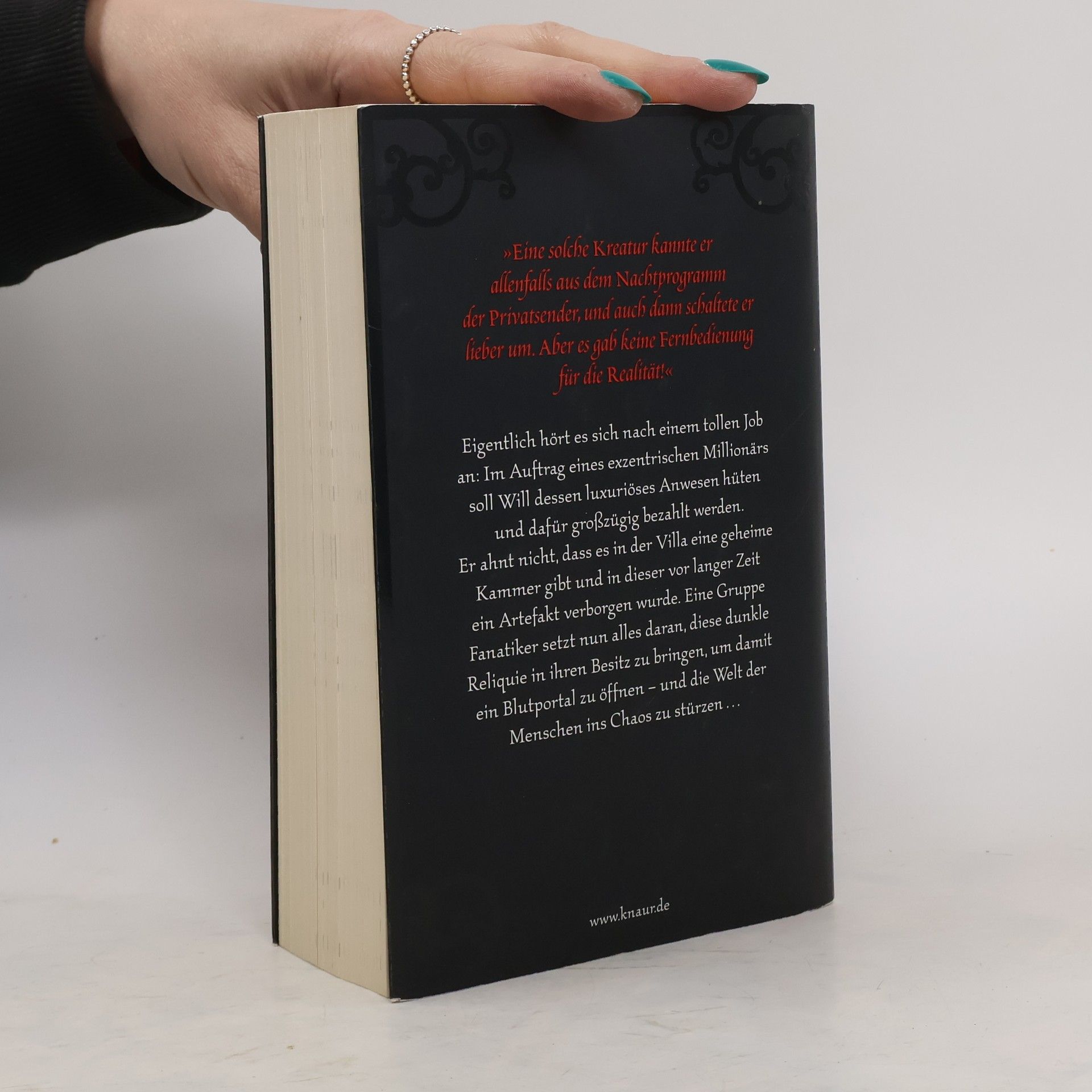 »Eine solche Kreatur kannte sie nur aus den Horrorfilmen der Privatsender, und auch dann schaltete sie lieber um. Doch für die Realität gab es keine Fernbedienung.« Saskia arbeitet als Köchin, ist eine leidenschaftliche Fechterin und führt ein ganz normales Leben. Das ändert sich, als sie bei einem Turnier gegen den geheimnisvollen Levantin antritt. Mit seinem Degen fügt er ihr einige tiefe Schnitte zu, die sich schon nach kurzer Zeit von selbst schließen. Saskia ahnt nicht, dass ihr Gegner ein Dämon ist, der seit Jahrhunderten nach ihr sucht – denn tief in ihr schlummert eine Gabe, die nun von -Levantin geweckt wurde. Er will, dass Saskia für ihn die Blutportale öffnet, durch die er endlich in seine Heimat zurückkehren kann. Doch niemand hat Saskia auf ihr dunkles Talent vorbereitet. Und so stößt sie unbeabsichtigt Türen auf, die nie geöffnet werden sollten …