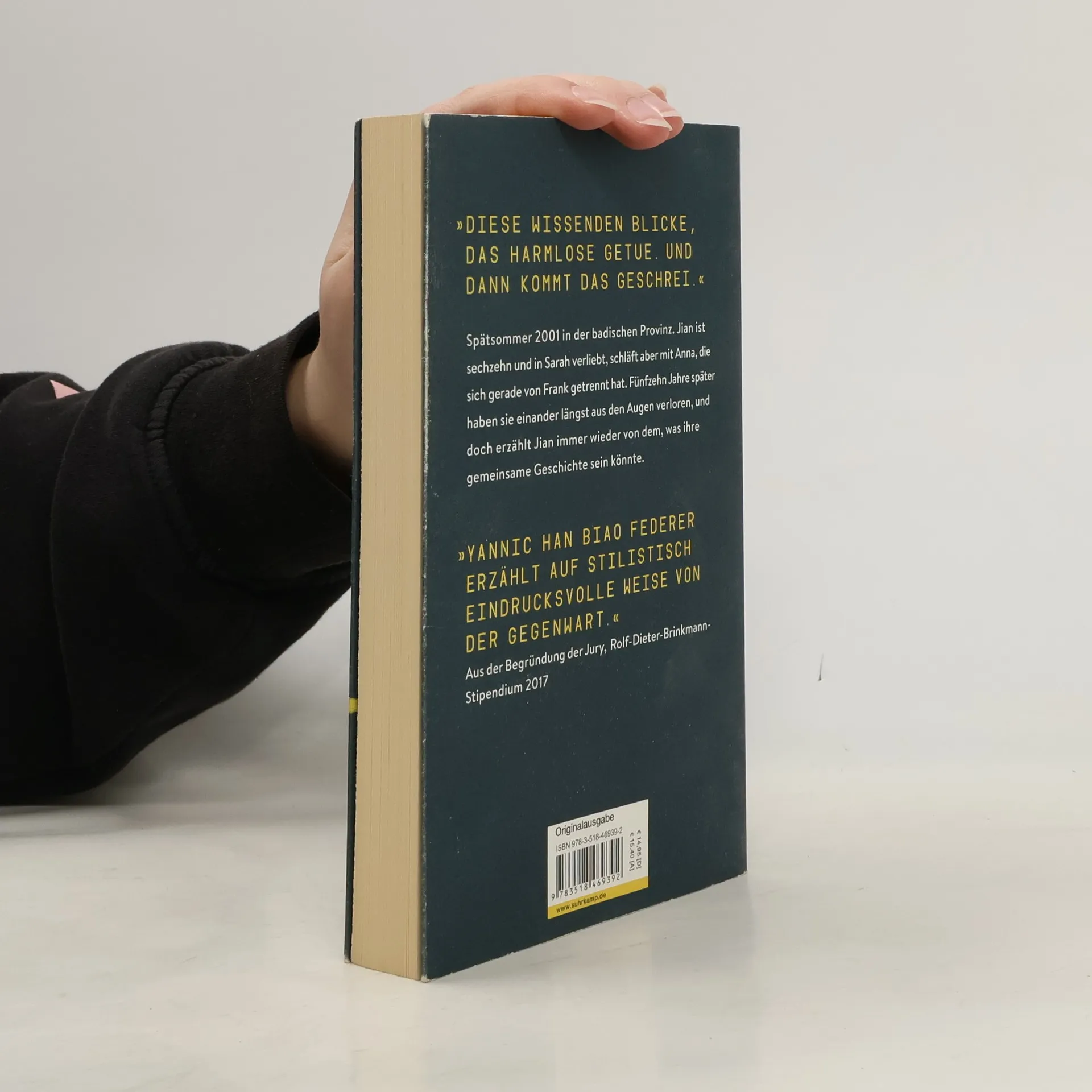 Spätsommer 2001 in der badischen Provinz. Im Fernsehen Bilder des einstürzenden World Trade Center. Jian ist sechzehn und in Sarah verliebt, schläft dann aber mit Anna, die sich gerade von Frank getrennt hat. Danach will Sarah nichts mehr von Jian wissen, Jian nichts mehr von Anna, und Frank ist mit sich selbst beschäftigt. Fünfzehn Jahre später steckt Anna in einer Dreiecksbeziehung, Frank verkriecht sich im Wald, und Jian erkennt Sarah auf Paparazzifotos wieder. Sie haben einander längst aus den Augen verloren, und doch erzählt Jian immer wieder von dem, was ihre gemeinsame Geschichte sein könnte. Yannic Han Biao Federers Debütroman begleitet vier junge Menschen bei ihrer Suche nach Zugehörigkeit, nach Orientierung in einer immer disparater und brüchiger werdenden Welt. Er zeigt das Nebeneinander von Geschichte und Erleben und erzählt hellwach und klug von der Zeit, in der wir leben.
