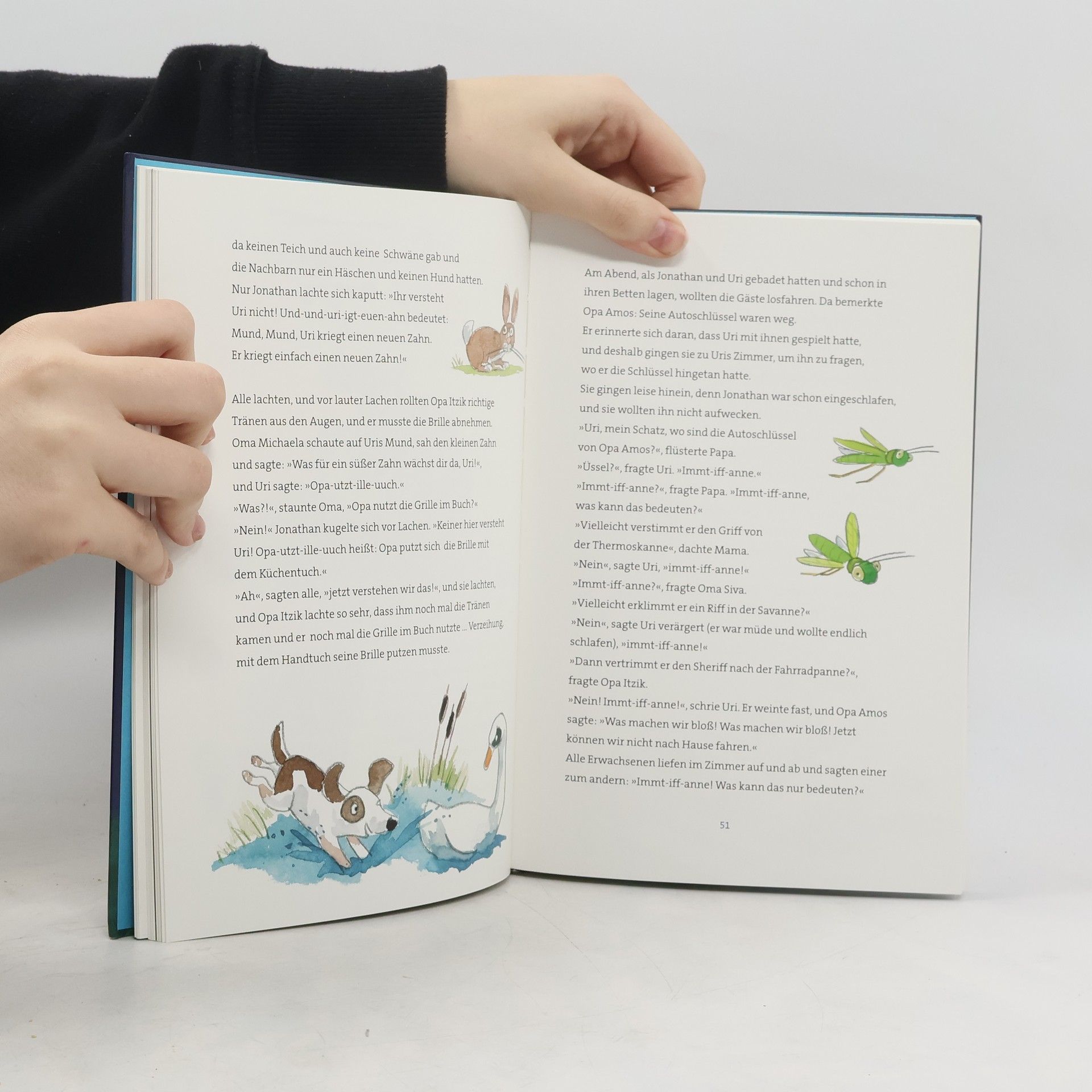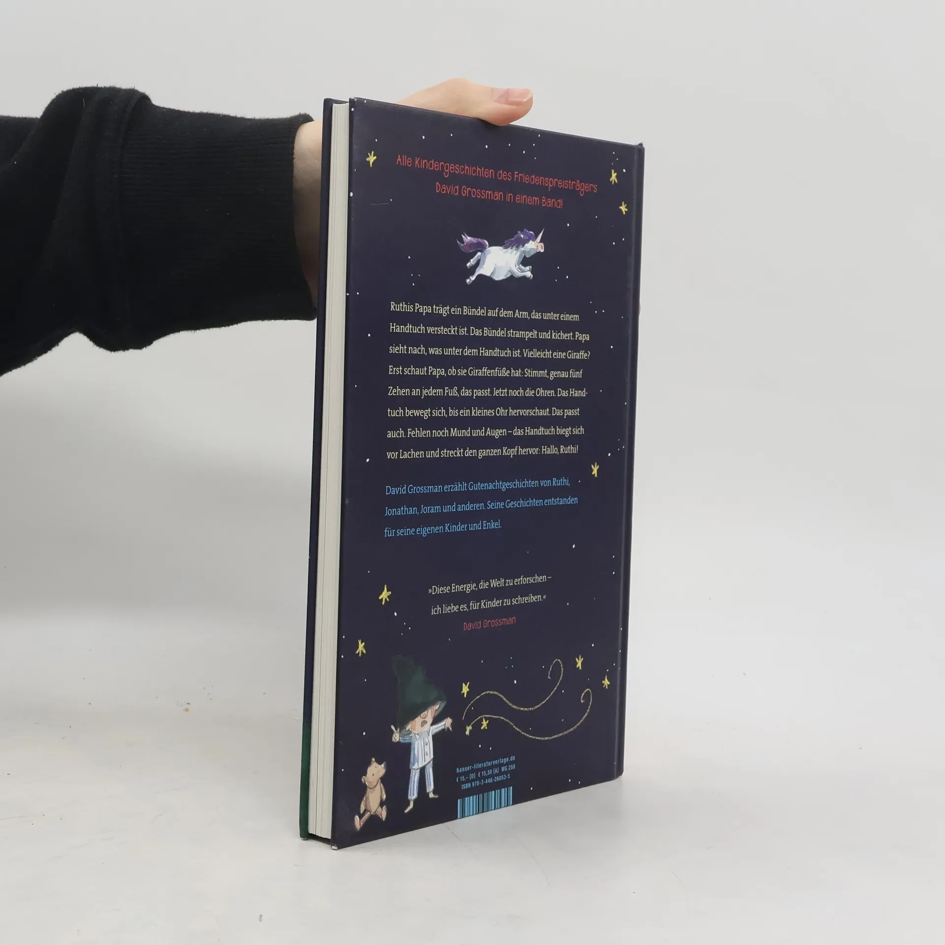 Alle Geschichten von David Grossman für die Allerkleinsten in einem Band. Ruthis Papa trägt ein Bündel auf dem Arm, das unter einem Handtuch versteckt ist. Das Bündel strampelt und kichert. Papa sieht nach, was unter dem Handtuch ist. Vielleicht eine Giraffe? Erst schaut Papa, ob sie Giraffenfüße hat: Stimmt, genau fünf Zehen an jedem Fuß, das passt. Jetzt noch die Ohren. Das Handtuch bewegt sich, bis ein kleines Ohr hervorschaut. Das passt auch. Fehlen noch Mund und Augen – das Handtuch biegt sich vor Lachen und streckt den ganzen Kopf hervor: Hallo, Ruthi! Diese und andere Gutenachtgeschichten von David Grossman entstanden für seine eigenen Kinder und Enkel.