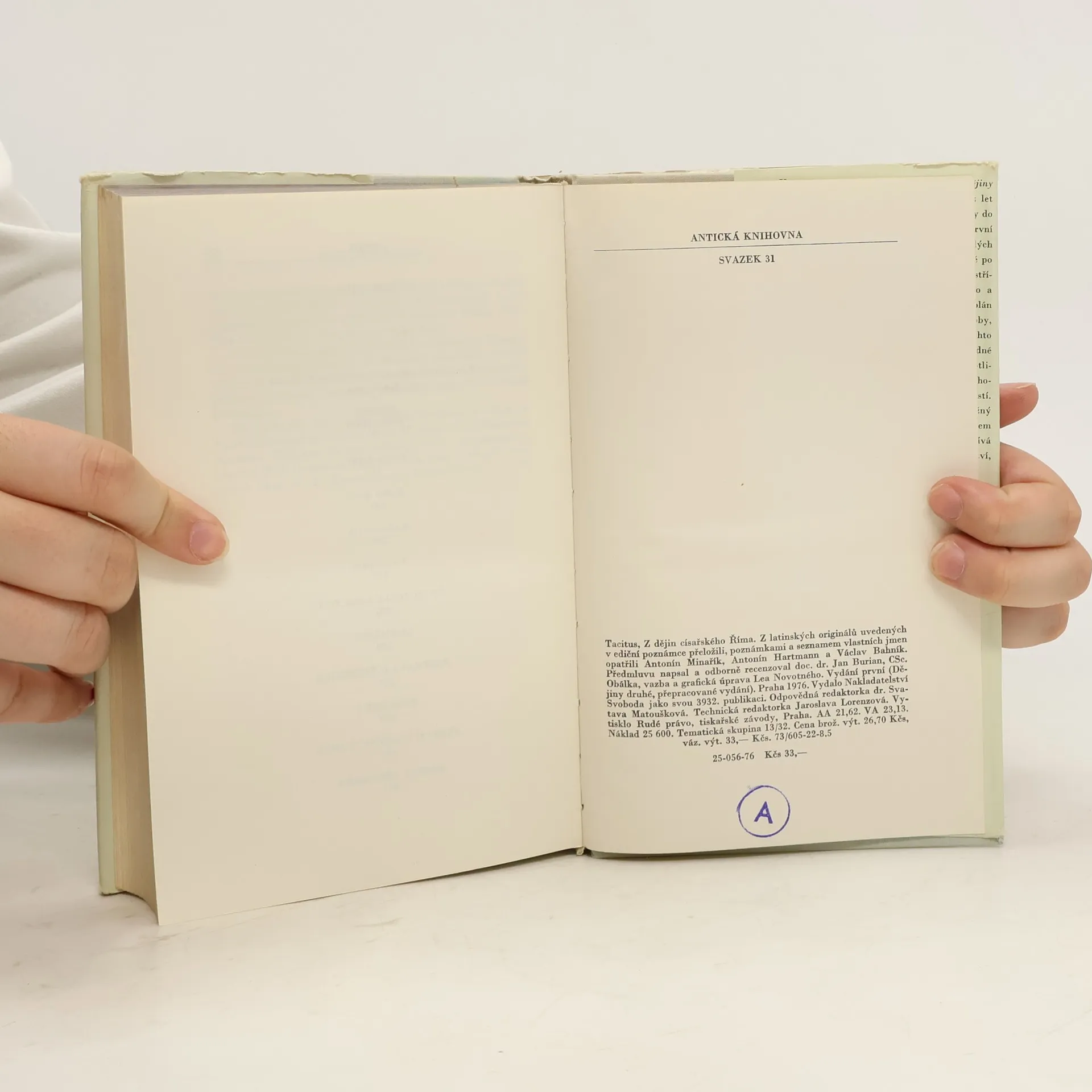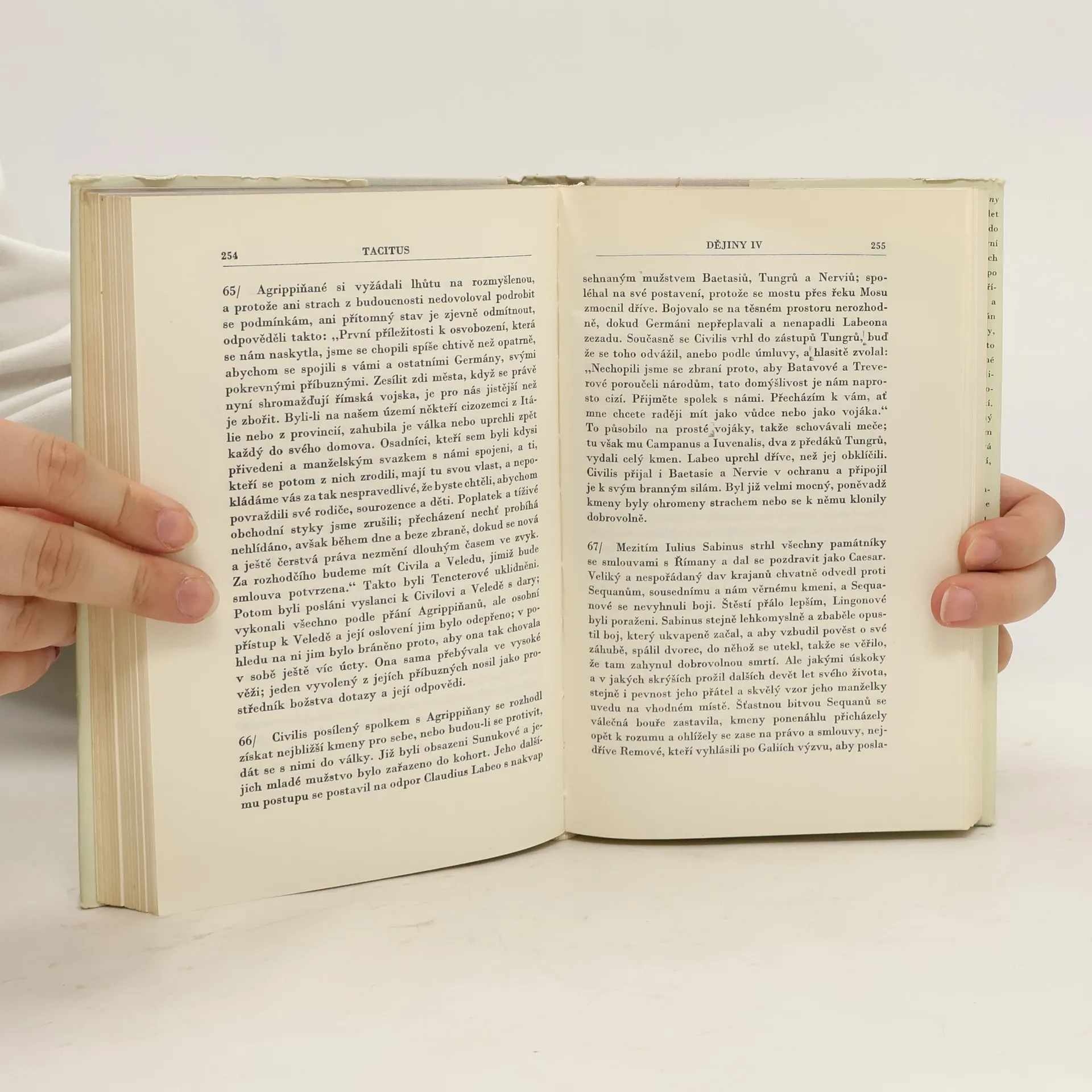 Svazek obsahuje tři drobné práce a Tacitův první velký historický spis, nazvaný Dějiny. Hlavní část svazku vyplňují dochované knihy Dějin, v nichž Tacitus zachytil události v Římě a ve významných částech impéria v době po Neronově smrti až do prohlášení Vespasiana císařem. Kromě Dějin obsahuje svazek drobnějšíTacitovy spisy, jako je chvalořeč na Tacitova tchána Iutia Agricolu, informativní spis o germánských kmenech v evropském vnitrozemí a Rozprava o řečnících, která představuje zajímavou sondu do kulturního života Říma za utužujícíhose principátu. 25-056-76