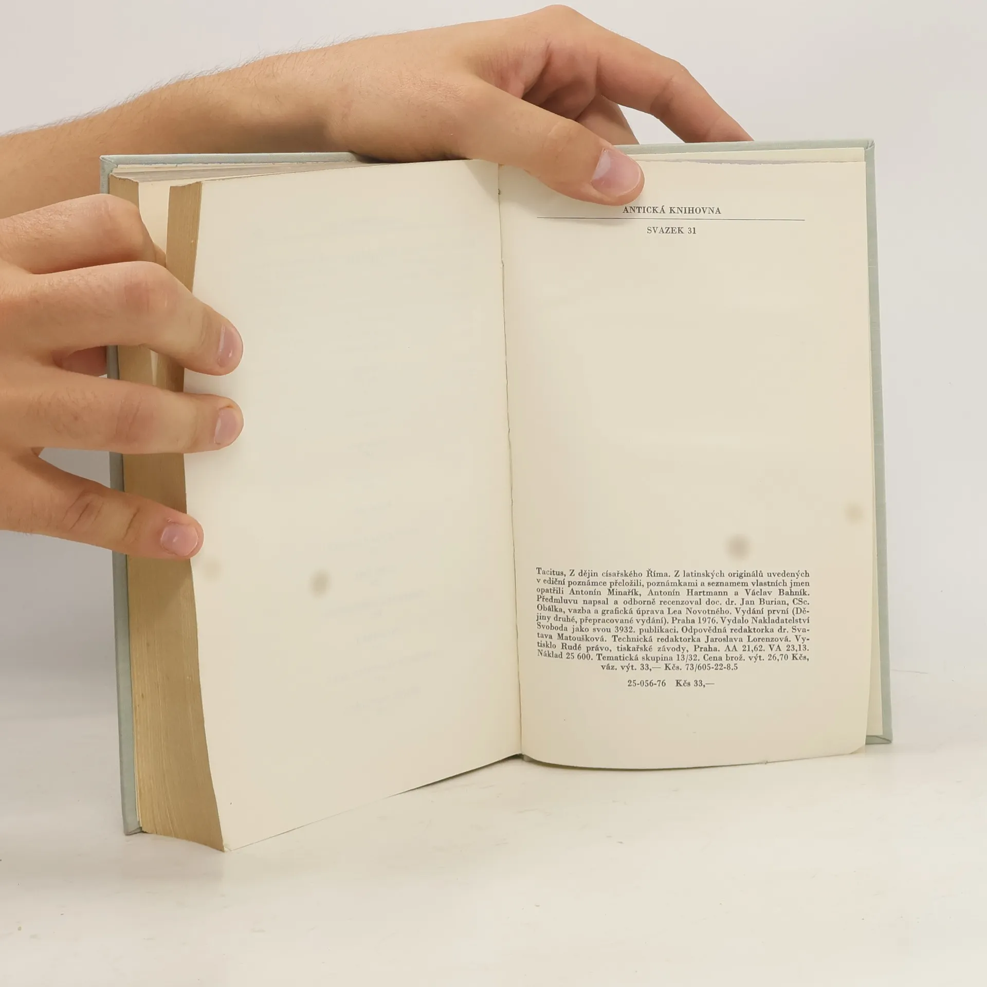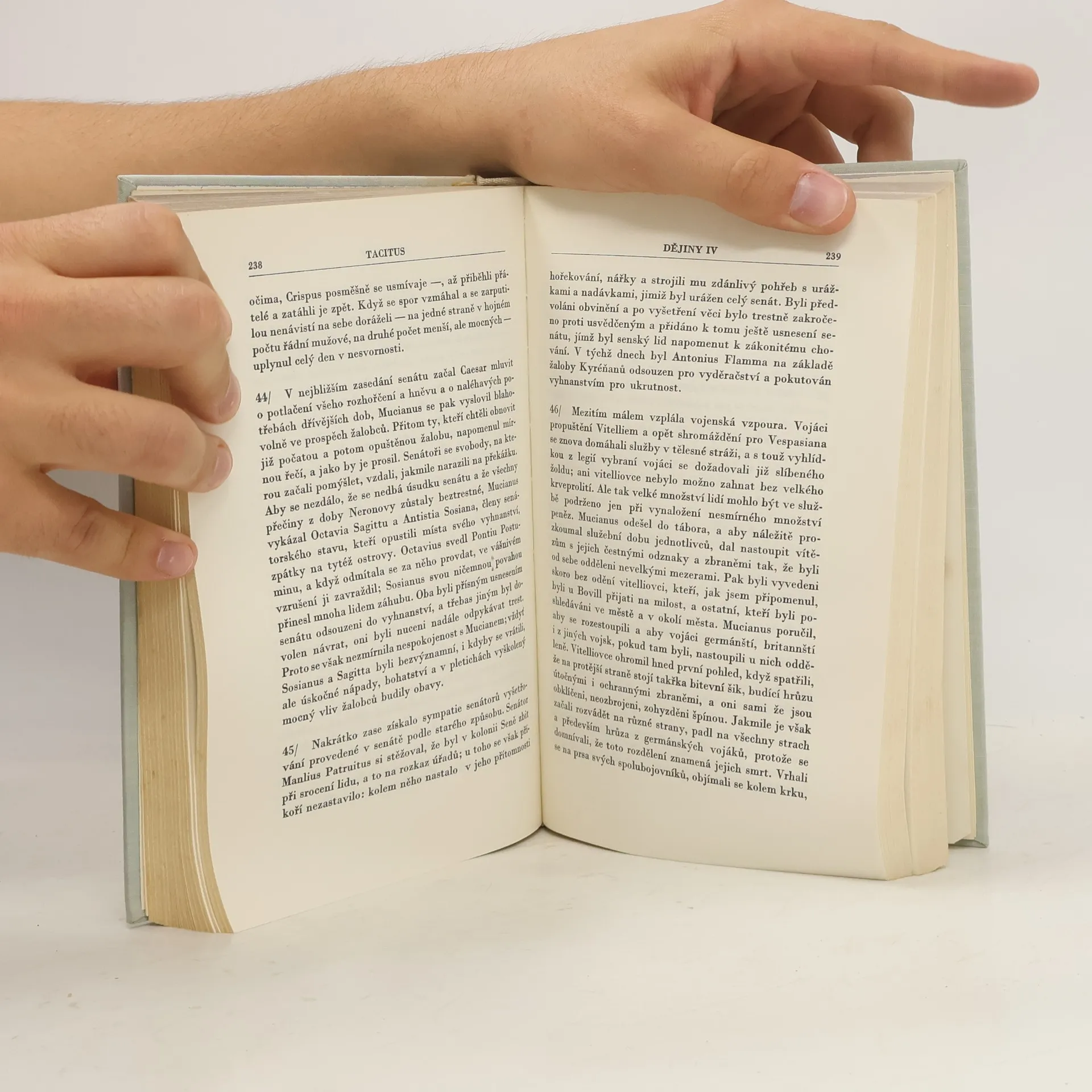 Svazek obsahuje tři drobné práce a Tacitův první velký historický spis, nazvaný Dějiny. Hlavní část svazku vyplňují dochované knihy Dějin, v nichž Tacitus zachytil události v Římě a ve významných částech impéria v době po Neronově smrti až do prohlášení Vespasiana císařem. Kromě Dějin obsahuje svazek drobnějšíTacitovy spisy, jako je chvalořeč na Tacitova tchána Iutia Agricolu, informativní spis o germánských kmenech v evropském vnitrozemí a Rozprava o řečnících, která představuje zajímavou sondu do kulturního života Říma za utužujícíhose principátu. 25-056-76