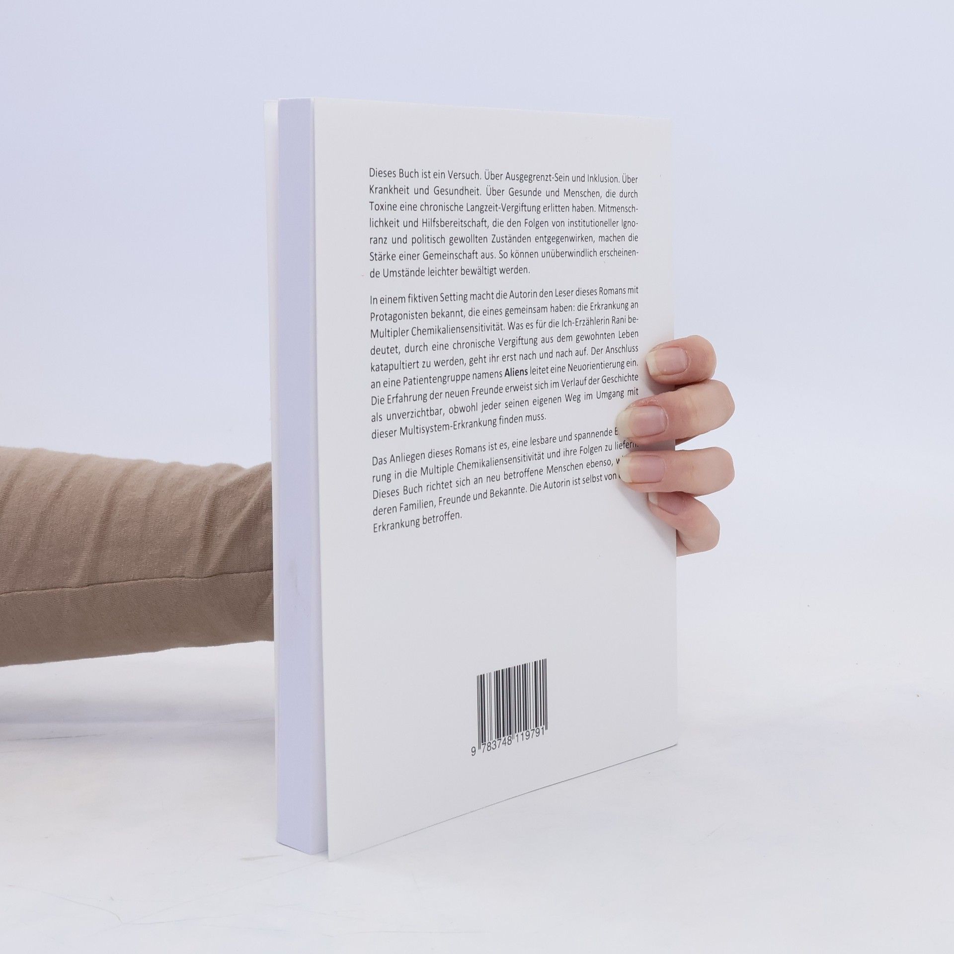 Dieses Buch ist ein Versuch. Über Ausgegrenzt-Sein und Inklusion. Über Krankheit und Gesundheit. Über Gesunde und Menschen, die durch Toxine eine chronische Vergiftung erlitten haben. Mitmenschlichkeit und Hilfsbereitschaft, die den Folgen von institutioneller Ignoranz und politisch gewollten Zuständen entgegenwirken, machen die Stärke einer Gemeinschaft aus, durch die unüberwindlich erscheinende Umstände leichter bewältigt werden können. In einem fiktiven Setting macht die Autorin den Leser dieses Romans mit Personen bekannt, die eines eint: die Erkrankung an Multipler Chemikaliensensitivität. Was es für die junge Protagonistin Rani bedeutet, durch eine chronische Vergiftung plötzlich aus dem gewohnten Leben katapultiert zu werden, geht ihr erst nach und nach auf. Der Anschluss an eine Patientengruppe namens „Aliens“ leitet eine Neuorientierung ein. Die Erfahrung ihrer neuen Freunde erweist sich im Verlauf der Geschichte als unverzichtbar, obwohl jeder seinen eigenen Weg im Umgang mit dieser Multisystem-Erkrankung finden muss. Das Anliegen dieses Romans ist es, eine lesbare und spannende Einführung in die Multiple Chemikalienunverträglichkeit und ihre Folgen zu liefern. Das Buch richtet sich an neu betroffene Menschen ebenso, wie an deren Familien, Freunde und Bekannte. Die Autorin ist selbst von dieser Erkrankung betroffen.
