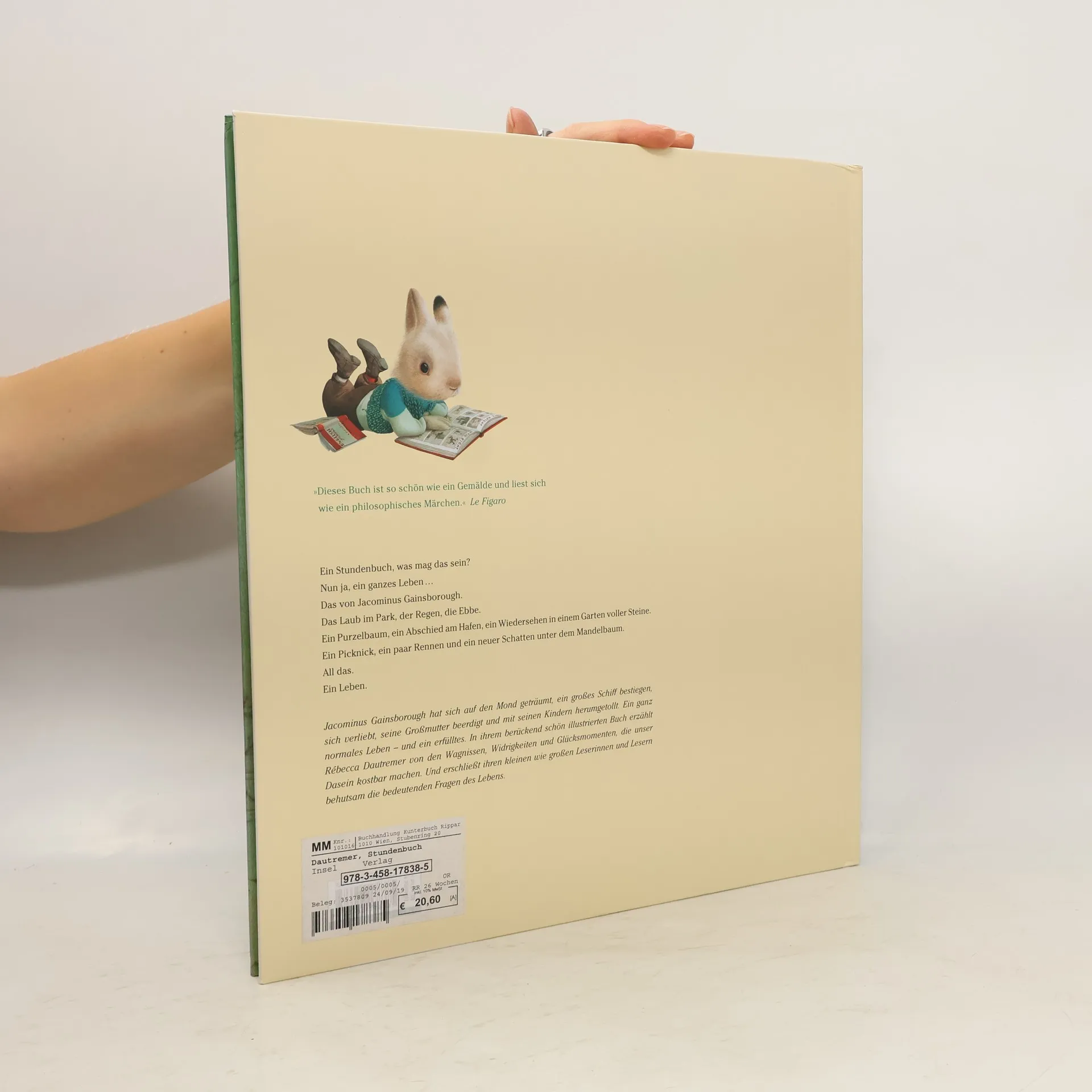 Jacominus Gainsborough hat sich auf den Mond geträumt, ein großes Schiff bestiegen, sich verliebt, seine Großmutter beerdigt und mit seinen Enkelkindern herumgetollt. Ein ganz normales Leben – und ein erfülltes. In ihrem berückend schön illustrierten Buch erzählt Rébecca Dautremer von den Wagnissen, Widrigkeiten und Glücksmomenten, die unser Dasein kostbar machen. Und erschließt ihren kleinen wie großen Leserinnen und Lesern behutsam die bedeutenden Fragen des Lebens. Ein Stundenbuch, was mag das sein? Nun ja, ein ganzes Leben … Das von Jacominus Gainsborough. Das Laub im Park, der Regen, die Ebbe. Ein Purzelbaum, ein Abschied am Hafen, ein Wiedersehen in einem Garten voller Steine. Ein Picknick, ein paar Rennen und ein neuer Schatten unter dem Mandelbaum. All das. Ein Leben.