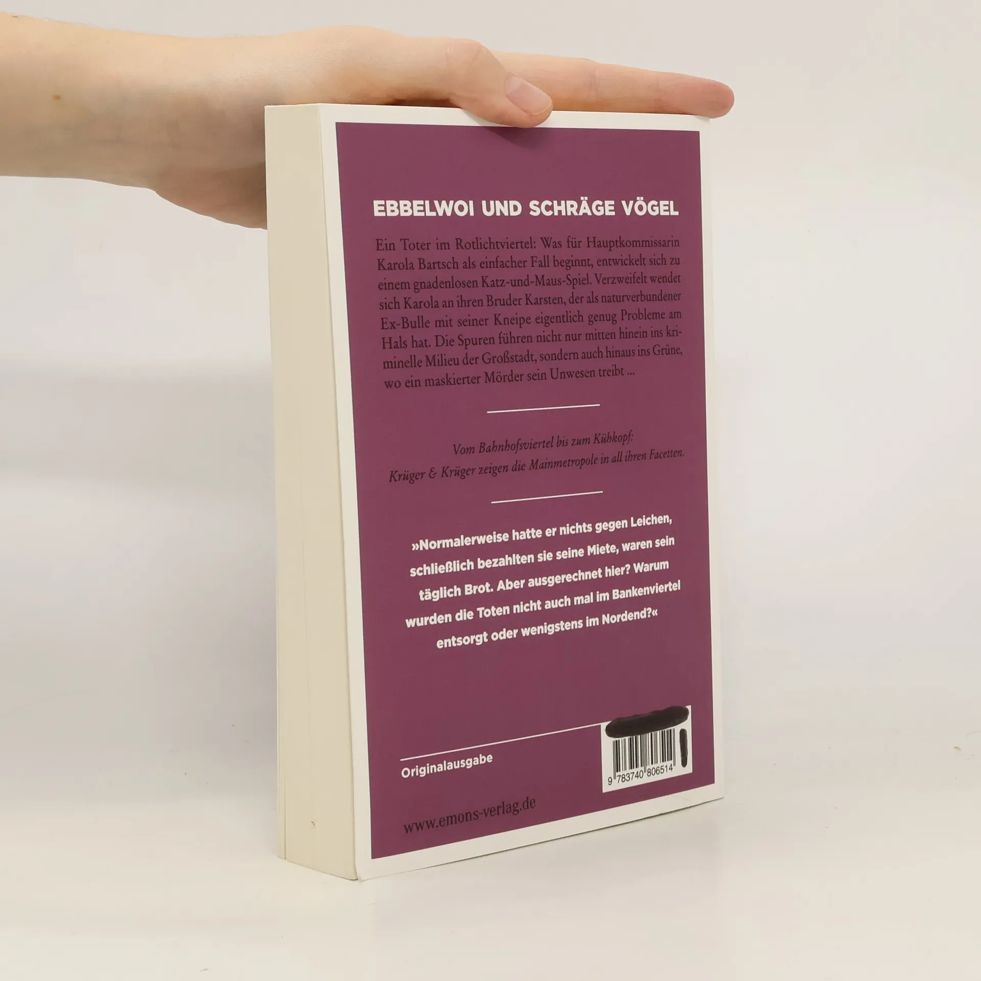 Vom Bahnhofsviertel bis zum Kühkopf: Krüger & Krüger zeigen die Mainmetropole in all ihren Facetten. Ein Toter im Rotlichtviertel: Was für Hauptkommissarin Karola Bartsch als einfacher Fall beginnt, entwickelt sich zu einem gnadenlosen Katz-und-Maus-Spiel. Verzweifelt wendet sich Karola an ihren Bruder Karsten, der als naturverbundener Ex-Bulle mit seiner Kneipe eigentlich genug Probleme am Hals hat. Die Spuren führen nicht nur mitten hinein ins kriminelle Milieu der Großstadt, sondern auch hinaus ins Grüne, wo ein maskierter Mörder sein Unwesen treibt ...