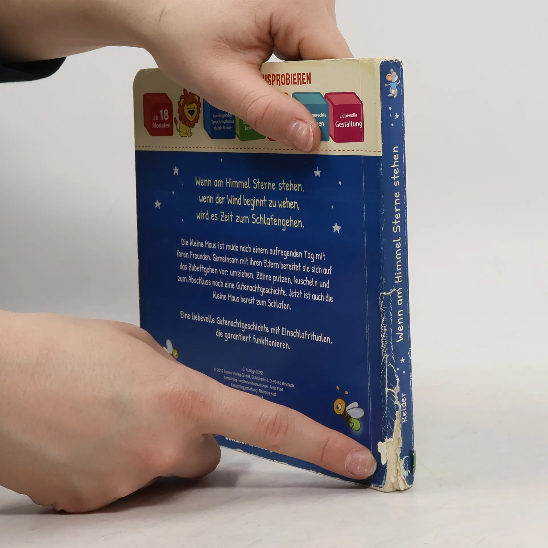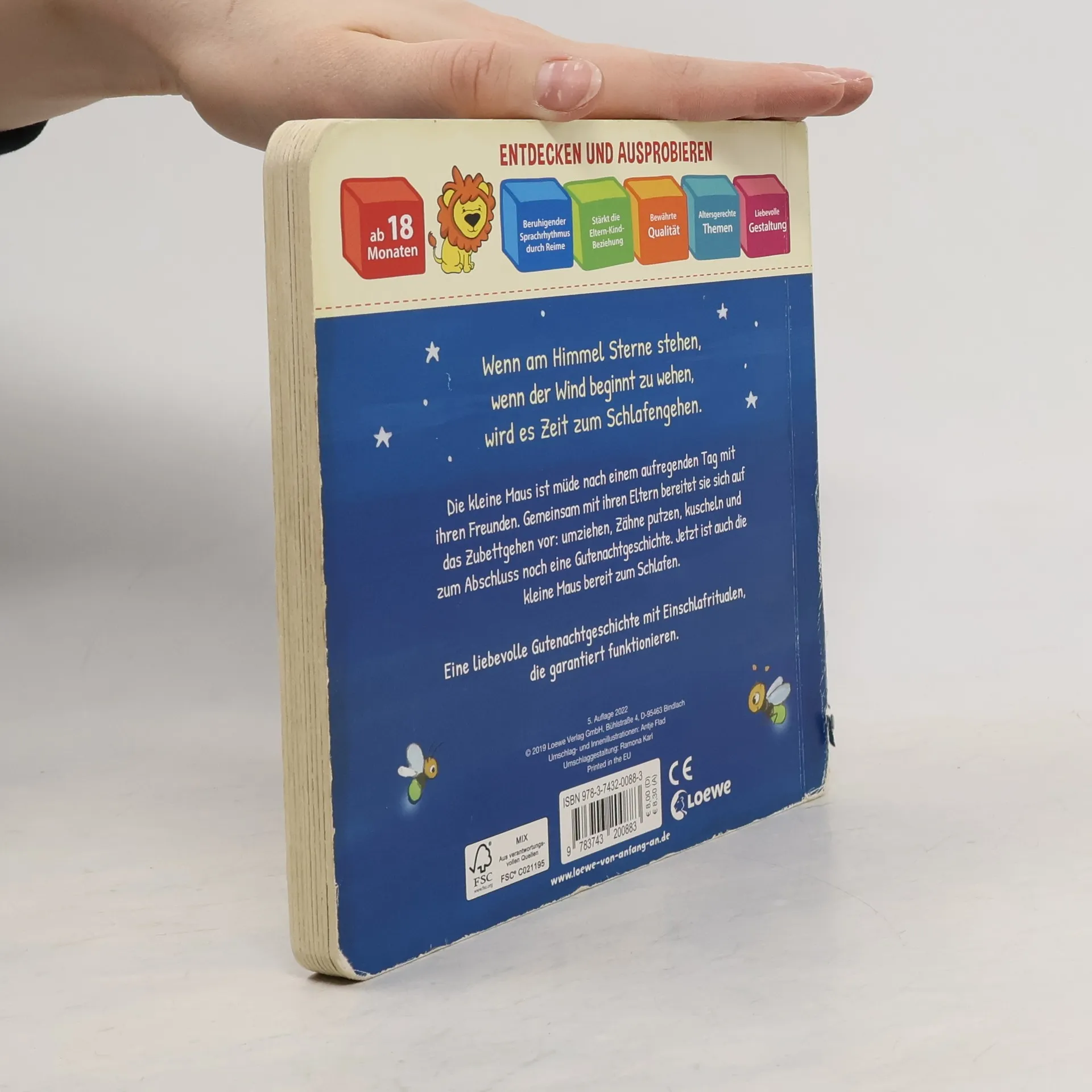 Wenn am Himmel Sterne stehen, wenn der Wind beginnt zu wehen, wird es Zeit zum Schlafengehen. Die kleine Maus ist müde nach einem aufregenden Tag mit ihren Freunden. Gemeinsam mit ihren Eltern bereitet sie sich auf das Zubettgehen vor: umziehen, Zähne putzen, kuscheln und zum Abschluss noch eine Gutenachtgeschichte. Jetzt ist auch die kleine Maus bereit zum Schlafen. Eine liebevolle Gutenachtgeschichte mit Einschlafritualen, die garantiert funktionieren. Ins Bett gehen wollen Kinder nicht immer, aber mit einem Einschlafritual, wie einer Gute-Nacht Geschichte und einem Gute-Nacht Kuss von Mama und Papa gelingt es leichter. Deshalb gibt dieses liebevolle Pappbilderbuch Eltern Anregungen für Rituale mit Einschlafgarantie , die sie mit ihren Kindern nachmachen können. Die erfolgreiche Pappbilderbuchreihe mit Ritualen für Eltern und Kinder geht weiter: „Bald ist alles wieder gut“ - Januar 2022