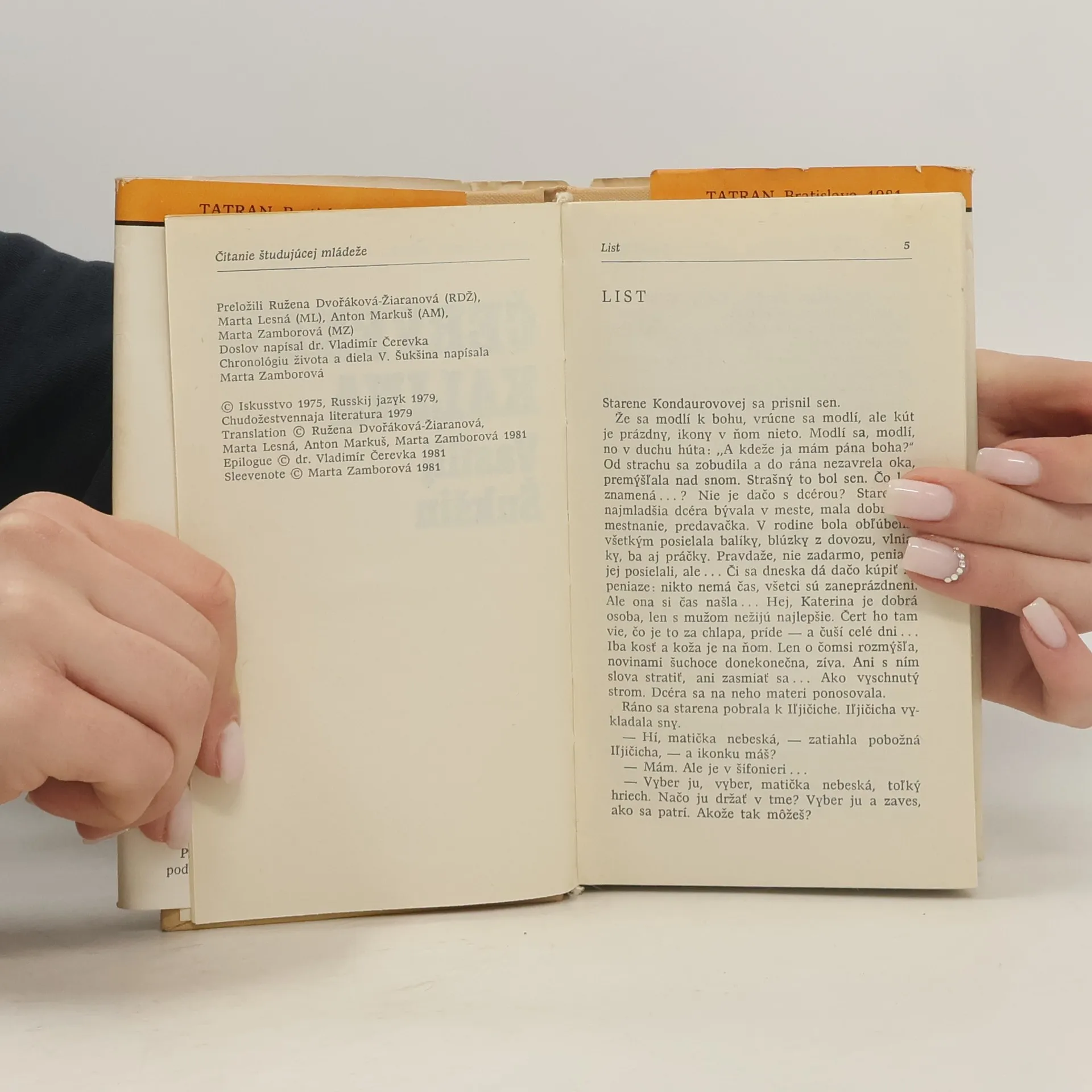 Slovenský výber krátkych próz a filmových poviedok. Přeloženo z ruských originálů Kinopovesti (Iskusstvo, 1975), Rasskazy (Russkij jazyk, 1979) a Rasskazy (Chudožestvennaja literatura, 1979). Chronologický prehľad života a diela V. Šukšina zpracovala Marta Zamborová. Doslov napísal Vladimír Čerevka. 61-262-81