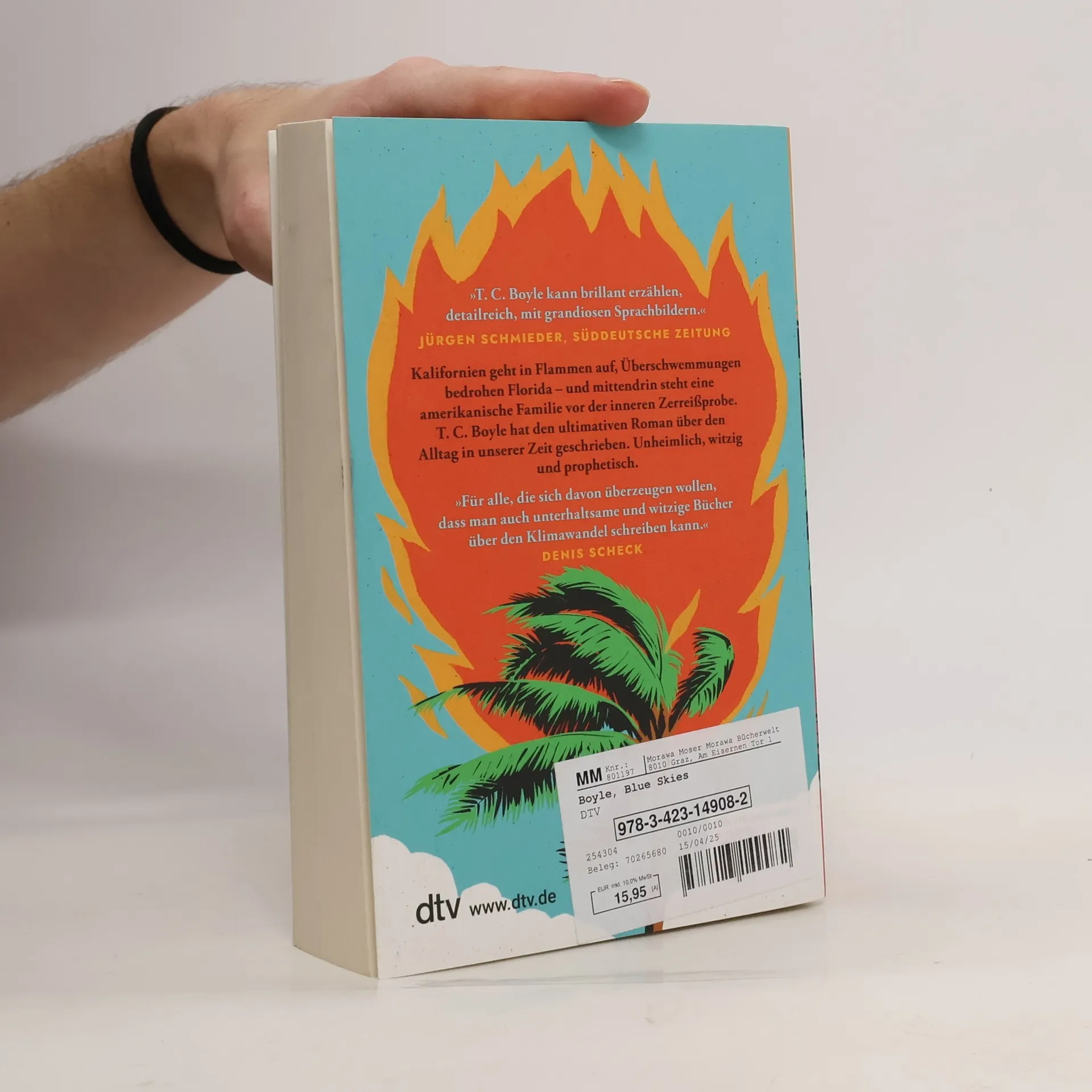 In "Blue Skies" von T. C. Boyle wird ein Familiendrama in einer von Umweltkrisen geprägten Welt erzählt. Während Kalifornien brennt und Florida überflutet wird, entfalten sich hitzige Diskussionen über den Umgang mit der Natur. Der Verlust eines exotischen Haustiers verstärkt die Spannungen in der Familie. Unheimlich und humorvoll zugleich.