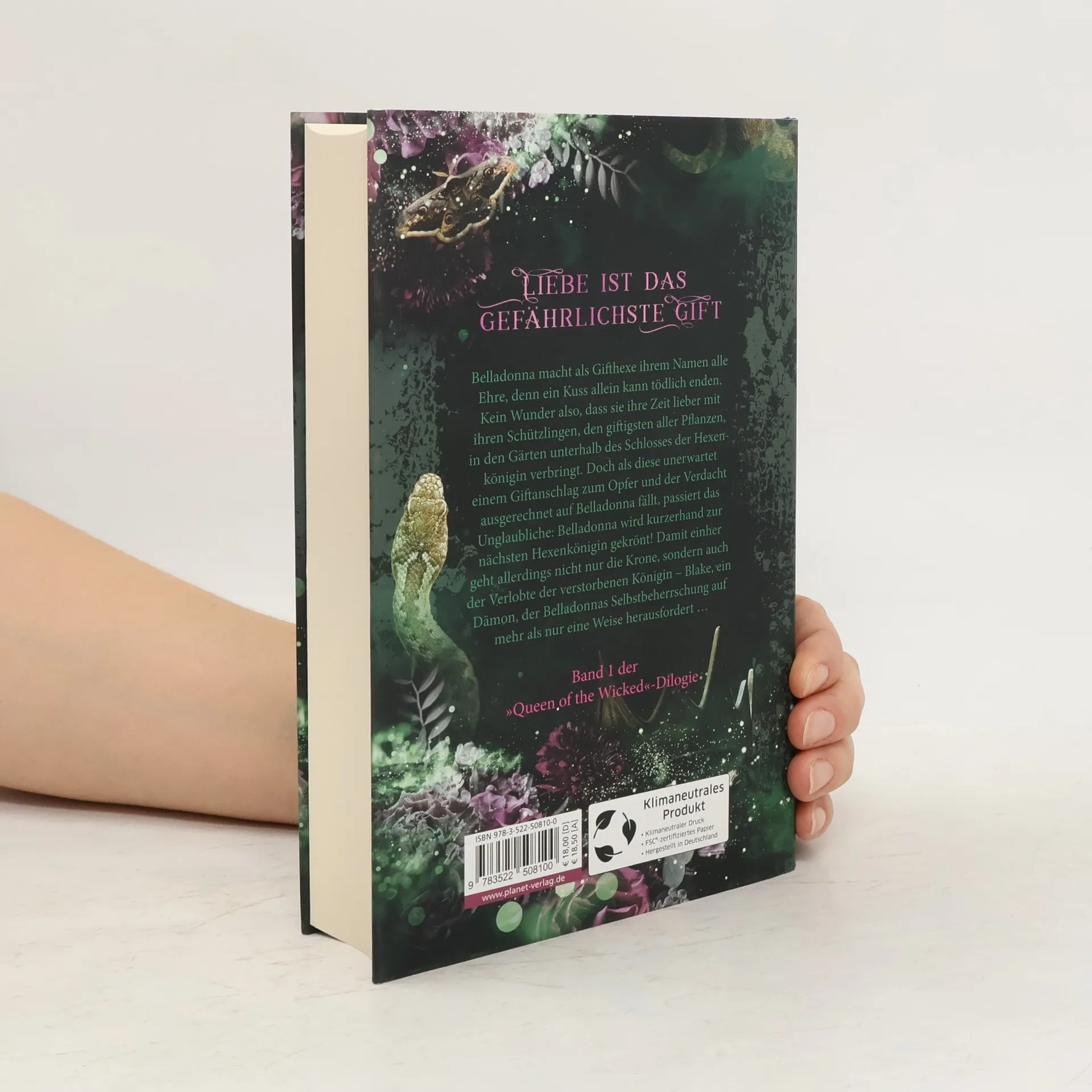 Belladonna, eine Gifthexe, macht ihrem Namen alle Ehre – ein Kuss von ihr kann tödlich enden. Stattdessen verbringt sie ihre Zeit mit ihren Schützlingen, den giftigsten Pflanzen, in den Gärten unter dem Schloss der Hexenkönigin. Als die Königin jedoch einem Giftanschlag zum Opfer fällt und der Verdacht auf Belladonna fällt, geschieht das Unerwartete: Sie wird zur neuen Hexenkönigin gekrönt. Mit der Krone kommt auch der Verlobte der verstorbenen Königin – Blake, ein Dämon, der Belladonnas Selbstbeherrschung auf die Probe stellt. Die Geschichte vereint fantastische Wesen, gefährliche Pflanzen und prickelnde Momente, die die Herzen von Fantasy-Liebhabern höher schlagen lassen. SPIEGEL-Bestsellerautorin Stella Tack beschreibt die Erzählung über Belladonna und Blake als eine „Wundertüte“ und empfiehlt sie jedem Fantasy-Fan. Die hochwertige Schmuckausgabe enthält einen Schutzumschlag, ein Lesebändchen und einen Softtoucheffekt sowie einen Sneak Peek zum zweiten Band, der im März 2023 erscheint. Dies ist der erste Teil einer dämonischen Romantasy-Dilogie, die die Leser in eine faszinierende Welt entführt.