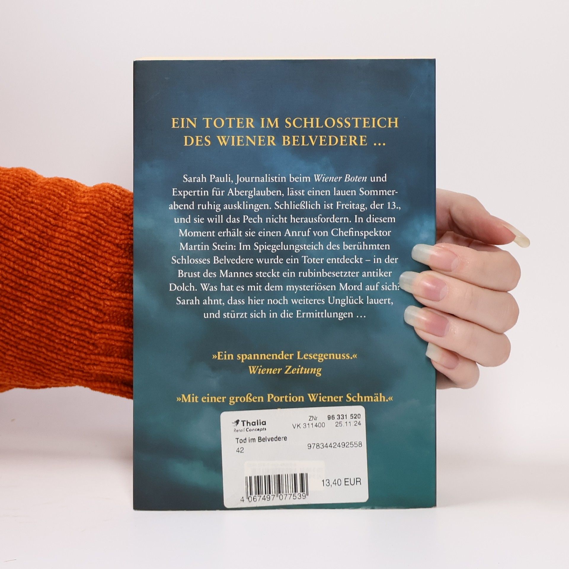 Ein Toter im Schlossteich des Wiener Belvedere – der dreizehnte Fall für die Journalistin Sarah Pauli. Sarah Pauli, Journalistin beim Wiener Boten und Expertin für Aberglauben, lässt einen lauen Sommerabend ruhig ausklingen. Schließlich ist Freitag, der 13., und sie will das Pech nicht herausfordern. In diesem Moment erhält sie einen Anruf von Chefinspektor Martin Stein: Im Spiegelungsteich des berühmten Schlosses Belvedere wurde ein Toter entdeckt – in der Brust des Mannes steckt ein rubinbesetzter antiker Dolch. Was hat es mit dem mysteriösen Mord auf sich? Sarah ahnt, dass hier noch weiteres Unglück lauert, und stürzt sich in die Ermittlungen …