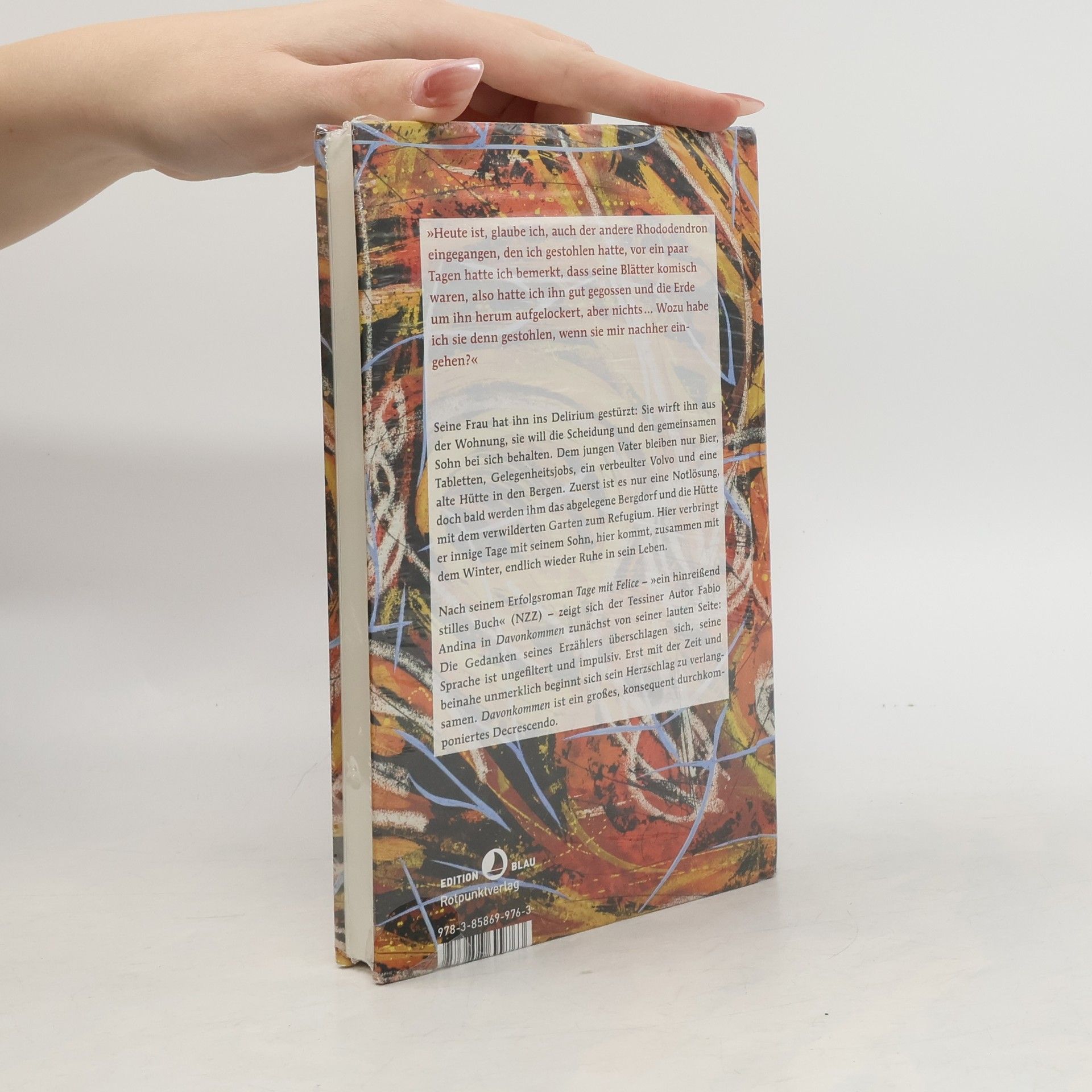 Der Brief des Anwalts ist unmissverständlich: Seine Frau will die Trennung, er muss die gemeinsame Wohnung verlassen, der Sohn bleibt bei der Mutter, das Auto kann er behalten. Weil er arbeitslos ist, hat er keine andere Wahl, als in ein altes Ferienhaus in einem Bergdorf zu ziehen, eine Stunde von der Stadt entfernt. Getrieben von der Angst, auch noch seinen Sohn zu verlieren, rast er den Berg hinauf und hinunter, nimmt jeden Gelegenheitsjob an, den er bekommen kann, pendelt zwischen seinem Psychiater und seiner Anwältin, pumpt sich voll mit Bier und Tabletten. Die Tage ohne Arbeit verschwimmen im Delirium, bis er anfängt, seine Umgebung wahrzunehmen, den Garten in Ordnung zu bringen, im Kamin Feuer zu machen. Er beginnt wieder zu malen, wie früher, wie Alfonso Ossorio, sagt man ihm, einer, der gemalt habe wie Jackson Pollock, nur ein bisschen anders. Vor allem aber wird das Ferienhaus zum Refugium, das er jedes zweite Wochenende mit seinem Sohn teilt. Hier ist Raum für Spiele und Vertrautheit. Hier kommt, zusammen mit dem Winter, langsam wieder Ruhe in sein Leben. „Davonkommen“ ist ein einziges großes Decrescendo. Der Roman kann, muss aber nicht, als Vorgeschichte zu „Tage mit Felice“ gelesen werden.