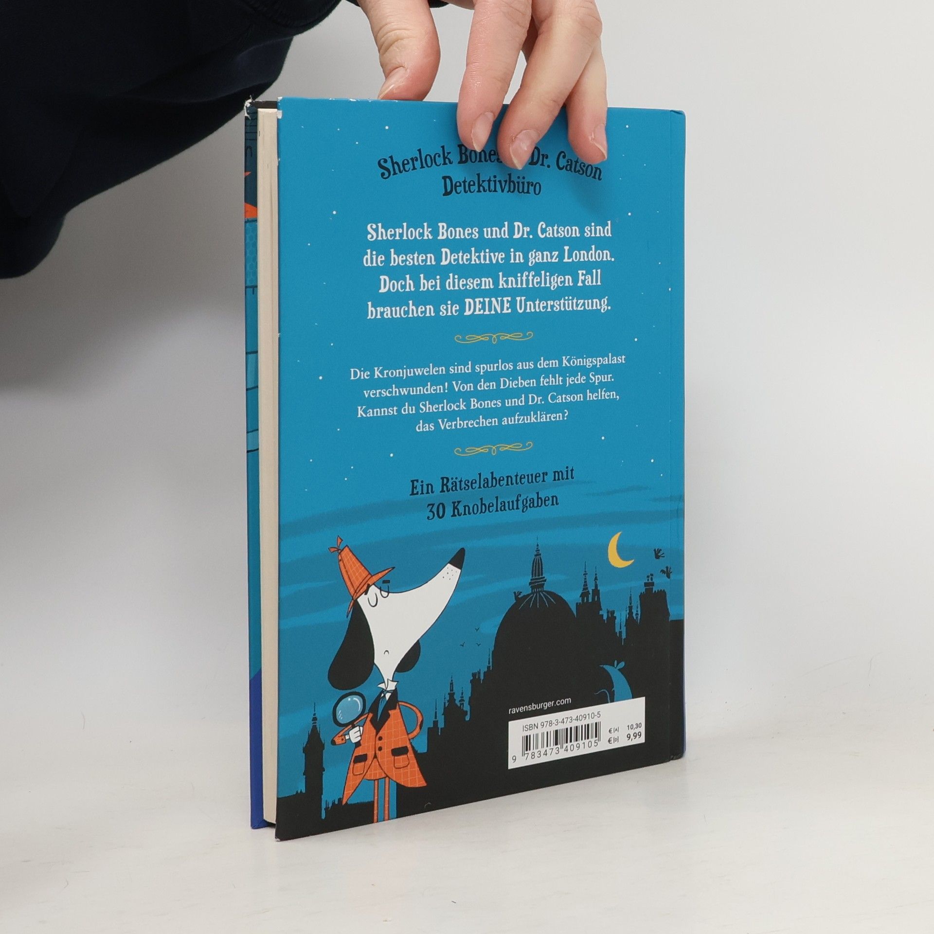 Hier wirst du zum Detektiv! Sherlock Bones und seine treue Helferin Dr. Catson sind Londons beste Detektive. Doch bei diesem kniffeligen Fall brauchen sie DEINE Unterstützung. Denn die Kronjuwelen sind spurlos aus dem Palast verschwunden! Ein lustiges Rätselabenteuer mit 30 Knobelaufgaben zum Mitraten. Die gesamte Reihe rund um Sherlock Bones und Dr. Catson: Band 1: „Die Suche nach den Kronjuwelen“ Band 2: „Die verfluchte Maske“ Band 3: „Der verschwundene Zauberer“ Weitere Rätselkrimis zum Knobeln und Kniffeln: „Schnapp den Dieb“ von Steffen Gumpert „Die Abenteuer der ‚schwarzen hand‘“ von Hans Jürgen Press