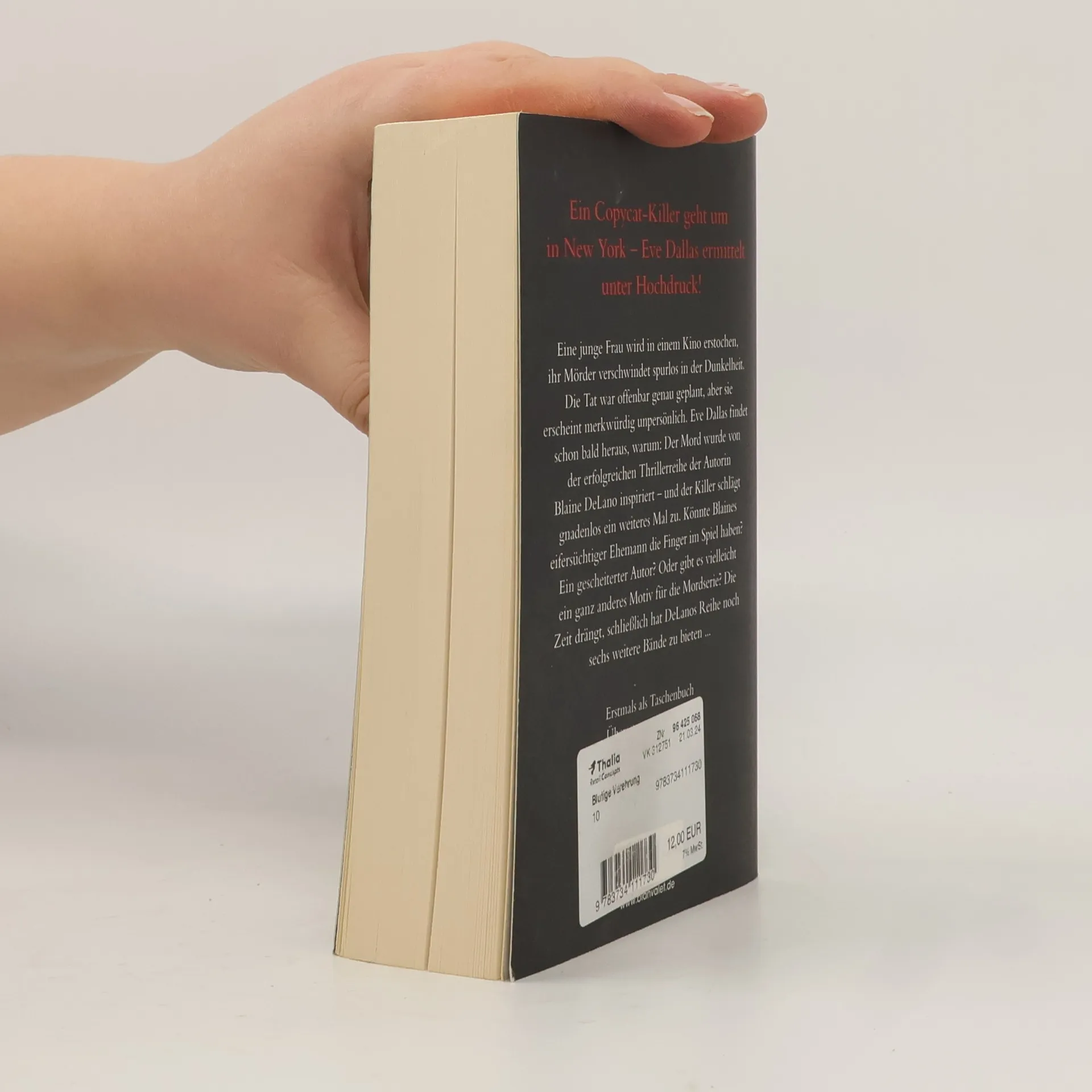 Ein Copycat-Killer geht um in New York – der neue Fall für Eve Dallas! Eine junge Frau wird in einem Kino erstochen, ihr Mörder verschwindet spurlos in der Dunkelheit. Die Tat war offenbar genau geplant, aber sie erscheint merkwürdig unpersönlich. Eve Dallas findet schon bald heraus, warum: Der Mord wurde von der erfolgreichen Thrillerreihe der Autorin Blaine DeLano inspiriert – und der Killer schlägt gnadenlos ein weiteres Mal zu. Könnte Blaines eifersüchtiger Ehemann die Finger im Spiel haben? Ein gescheiterter Autor? Oder gibt es vielleicht ein ganz anderes Motiv für die Mordserie? Die Zeit drängt, schließlich hat DeLanos Reihe noch sechs weitere Bände zu bieten … Lust auf mehr spannende Romane von J. D. Robb? Dann lesen Sie auch »Sein teuflisches Herz«, »Im Licht des Todes« oder »Das Böse im Herzen«!