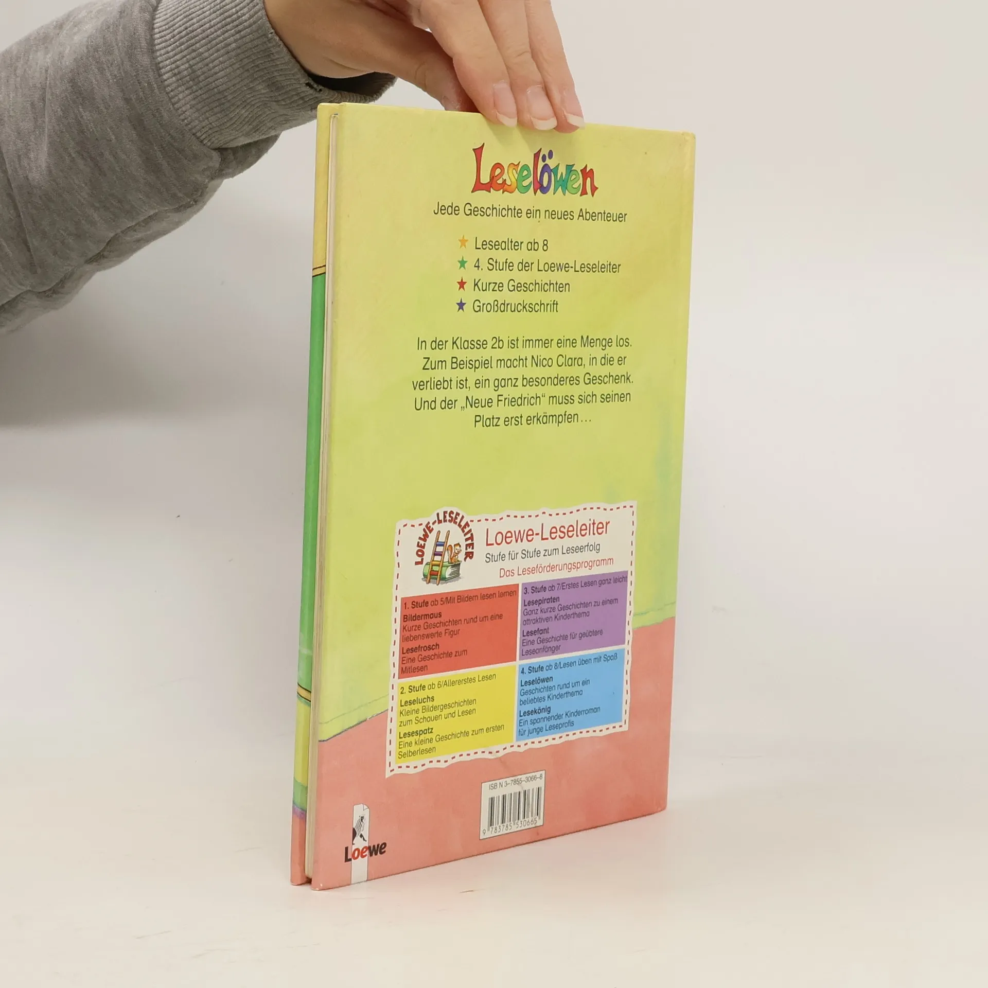 Lesealter ab 8 4. Stufe der Loewe-Leseleiter Kurze Geschichten Großdruckschrift In der Klasse 2b ist immer eine Menge los. Zum Beispiel macht Nico Clara, in die er verliebt ist, ein ganz besonderes Geschenk. Und der „Neue Friedrich“ muss sich seinen Platz erst erkämpfen.