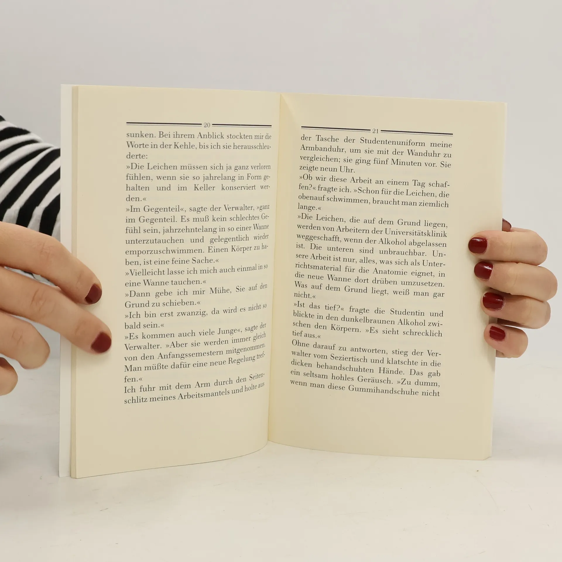 In seinen Romanen, Erzählungen, Essays geht es immer um Ekel, Grausamkeit und vor allem und immer wieder um die moralische Labilität der Mitglieder der Nachkriegsgesellschaft. In der vorliegenden Erzählung fällt einem Romanistikstudenten und seiner Kollegin von der Anglistik eine besonders makabre Arbeit zu. In der Prosektur einer Universitätsklinik müssen sie Leichen aus einem Alkohol-Bassin in ein anderes umladen. Nicht nur der Job ist widerwärtig, sondern auch der Auftraggeber, ein Medizinprofessor. Nach Beendigung der Arbeit erfahren die Werkstudenten, daß ihre Mühe vergeblich war. Die Leichen sollten gar nicht mehr zur Forschung oder Ausbildung verwendet, sondern im Krematorium verbrannt werden. Es bleibt ungewiß, ob ihnen ihr Arbeitslohn überhaupt ausbezahlt wird.