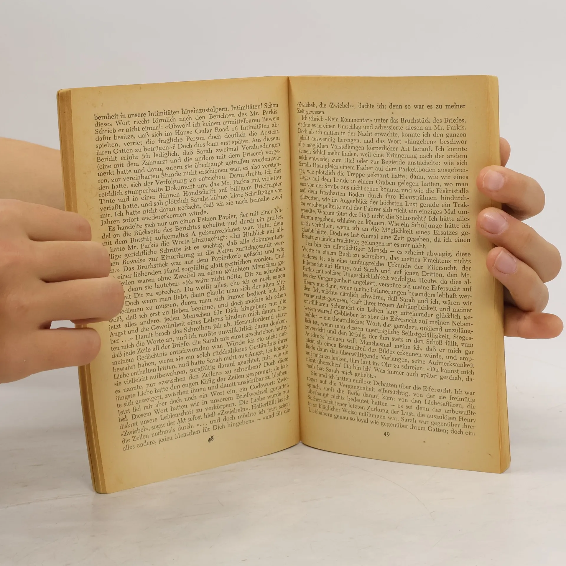 London 1946. Bei einem Spaziergang trifft der Romanschriftsteller Maurice Bendrix seinen alten Bekannten Henry Miles, mit dessen Frau Sarah er ein Verhältnis hatte. Zu Bendrix' Überraschung erweist sich der sonst so einsilbige und ungelenke Beamte Miles als überaus gesprächig und schüttet ihm sein Herz aus: Miles verdächtigt Sarah, eine Affäre zu haben. Brisanterweise erwartet der ratlose Ehemann ausgerechnet von Bendrix, ihm bei seinen Nachforschungen zu helfen. Und plötzlich ist der Liebhaber eifersüchtiger als der Gatte. Er beauftragt einen Detektiv, denn er selbst ist es, der unbedingt herausbekommen will, ob und wen Sarah liebt, aber vor allem, warum sie ihn damals verließ, nach jener gefährlichen Liebesnacht im Bombenhagel des Krieges.