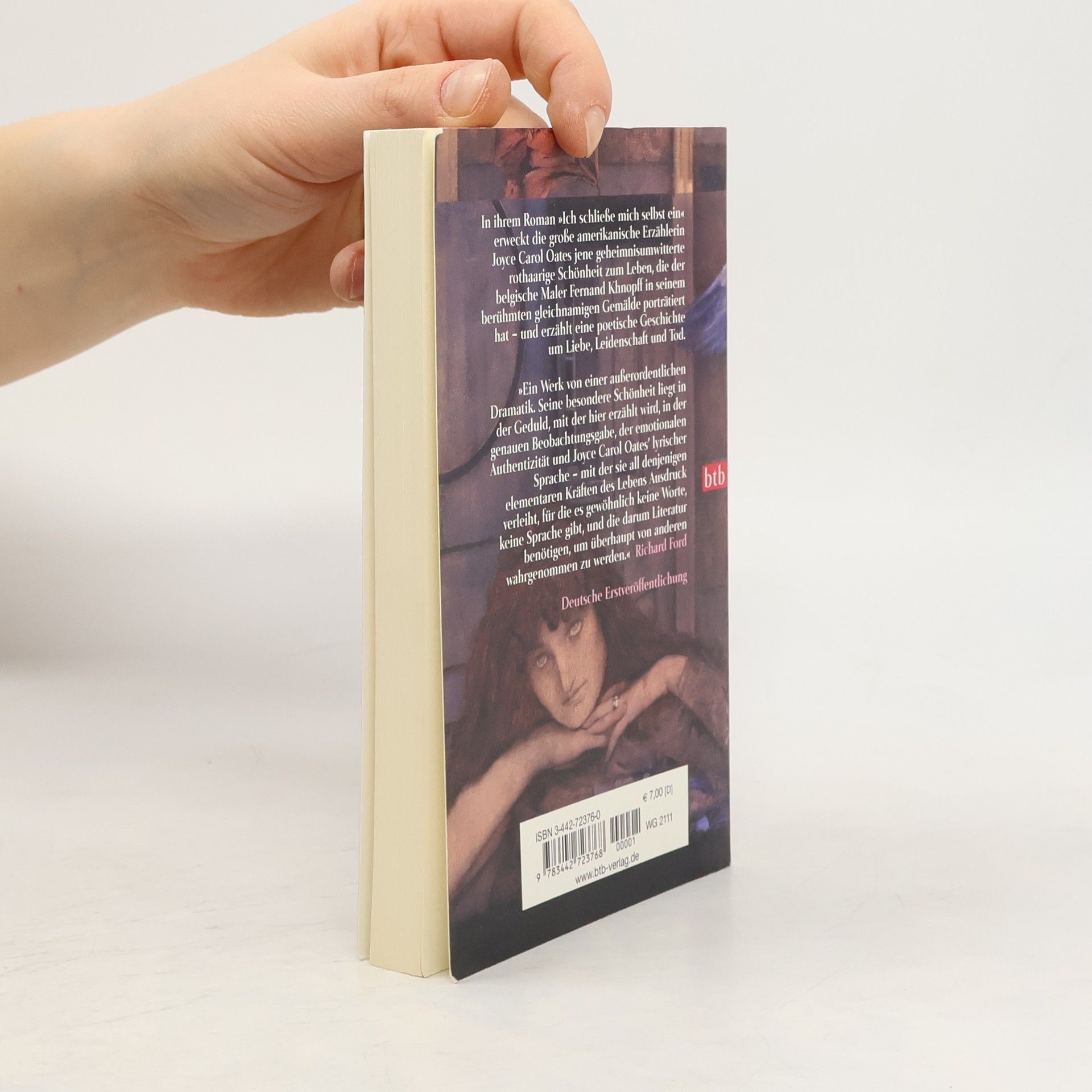 In ihrem Roman "Ich schließe mich selbst ein" erweckt Joyce Carol Oates jene geheimnis-umwitterte Frau zum Leben, die der belgische Maler Fernand Khnopff in seinem gleichnamigen Gemälde porträtiert hat. Oates verleiht ihr die Identität von Edith Margaret Freilicht, geboren 1890, der ihre im Kindbett verstorbene Mutter den Kosenamen Calla gab. Die junge Frau erscheint den Menschen in ihrem Heimatdorf exzentrisch und eigensinnig; selbst ihrem Ehemann und ihren Kindern bleibt die rothaarige Schönheit rätselhaft. Niemanden lässt sie wirklich an sich heran - bis der farbige Wassersucher Tyrell Thompson ins Dorf kommt. Aus der Sicht von Callas Enkelin erfährt der Leser von einer alles verzehrenden Leidenschaft, die gegen alle Konventionen verstößt. Joyce Carol Oates verleiht jenen elementaren Kräften des Lebens Ausdruck, "für die es gewöhnlich keine Worte, keine Sprache gibt, und die darum Literatur benötigen, um überhaupt wahrgenommen zu werden." Richard Ford§