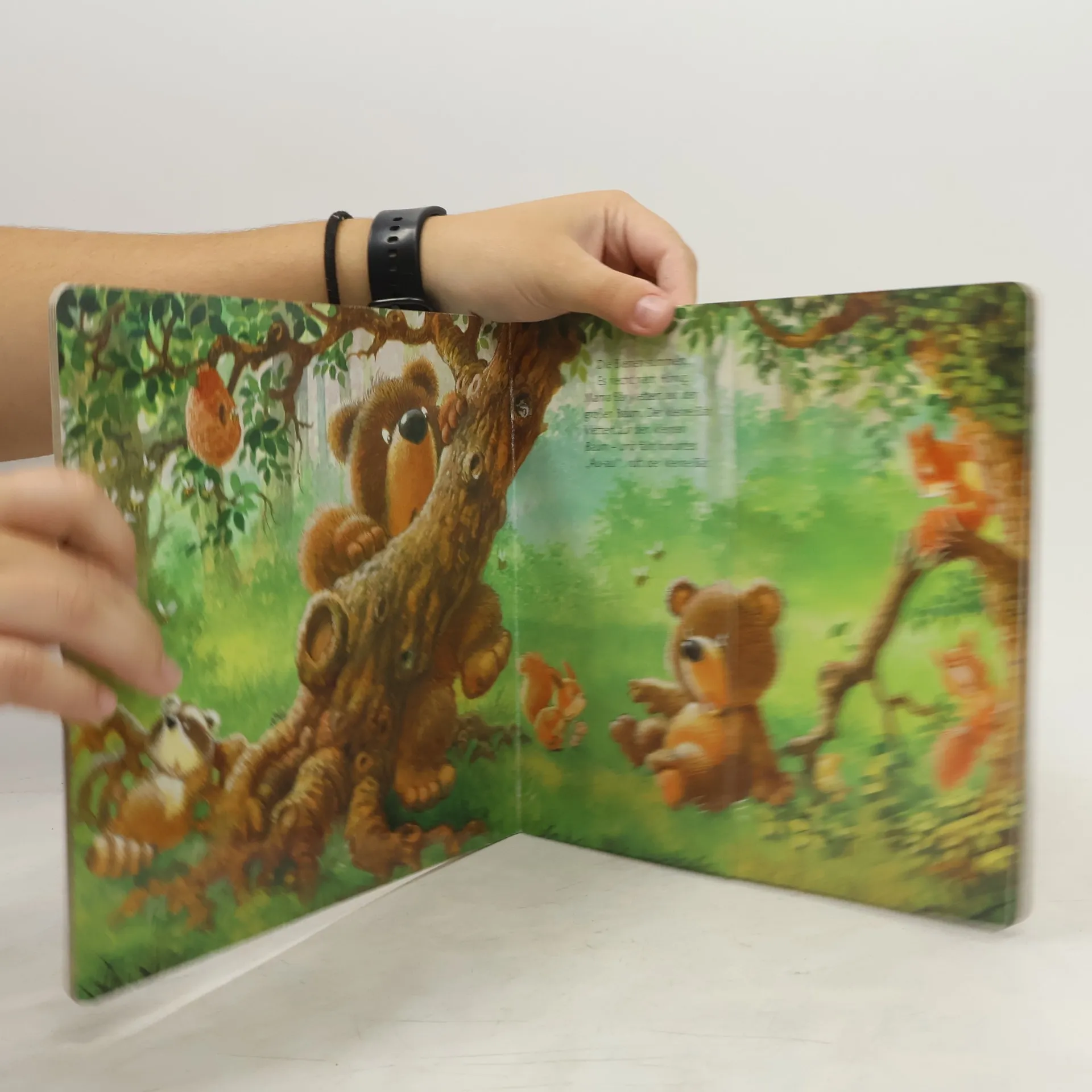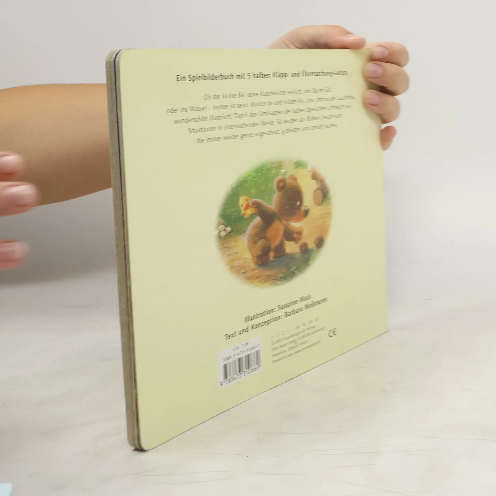 Der kleine Bär ist mit Mama Bär im Wald. Auf dem langen Spaziergang passieren ihm immer wieder Missgeschicke: Er verliert seine Kuschelente, fällt von einem Baum, zerstört seine Burg aus Zweigen und verliert seine Mama aus den Augen. Aber sie ist gleich zur Stelle, um ihn zu trösten. Die halben Klappseiten zeigen immer den Übergang von Wut und Traurigkeit zu Trost und Freude. So spiegelt dieses Buch die ganze Gefühlswelt kleiner Kinder wider.