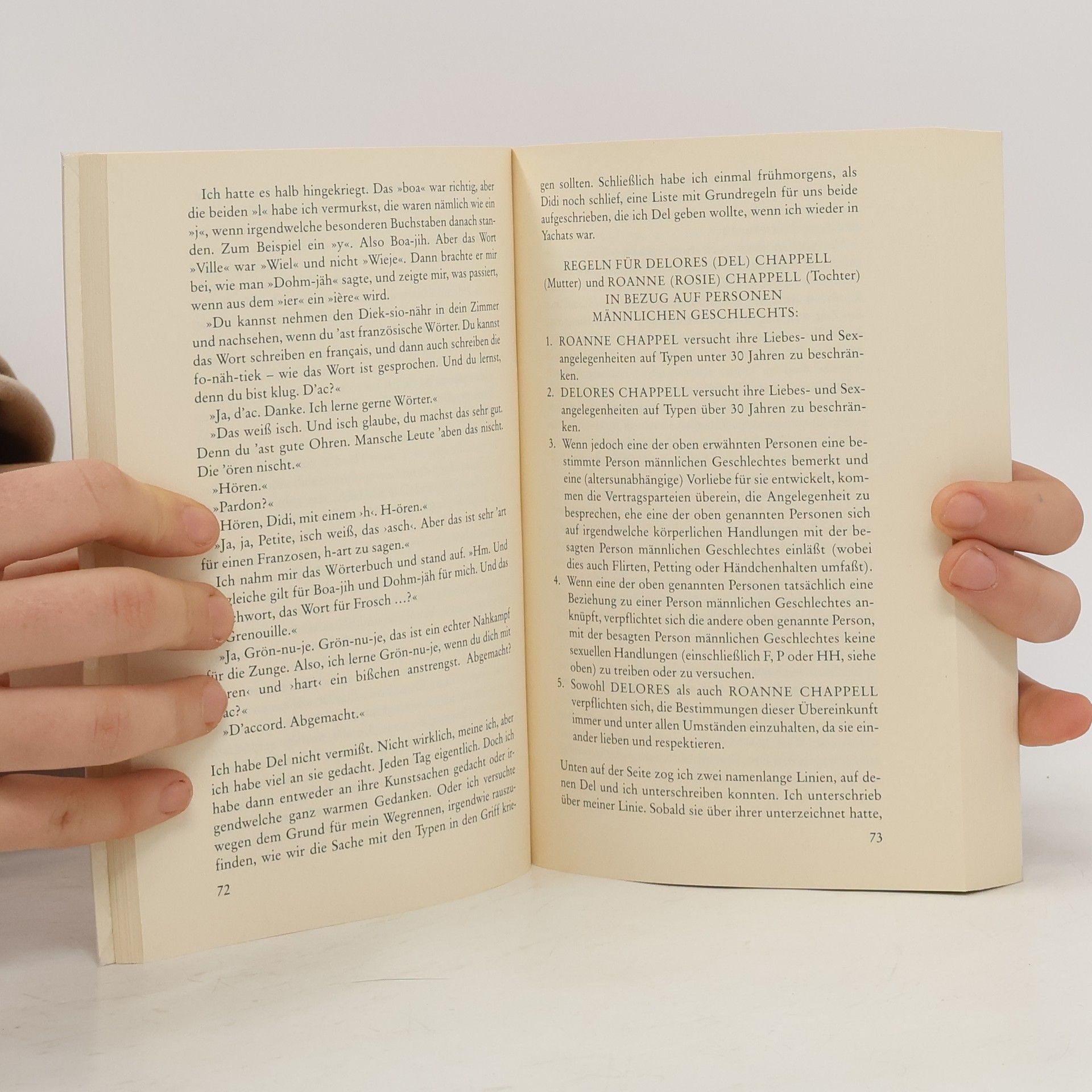 Roanne ist vierzehn, doch wer ihre ausgeprägten Formen sieht, hält sie für älter. Sie weiß viel über Kunst, denn ihre Mutter Dell malt, bildhauert und ist für ihre Plattencover berühmt. Dell war nie verheiratet, aber selten allein in ihrem Leben. Unglücklicherweise hat es Marcus mit den schönen großen Händen auf Mutter und Tochter abgesehen. Als Roanne ihn mit Dell im Bett erwischt, verläßt sie fluchtartig die Szene. Ohnehin haben die Sommerferien gerade begonnen. Roannes erste Schritte ins eigene Leben führen sie, die selbst wunderbare Cartoons zeichnet, zu allerlei supernetten und superausgeflippten Leuten an der Westküste. Sie findet Freunde, die sie so akzeptieren, wie sie ist, und erlebt ihre erste große Liebe.