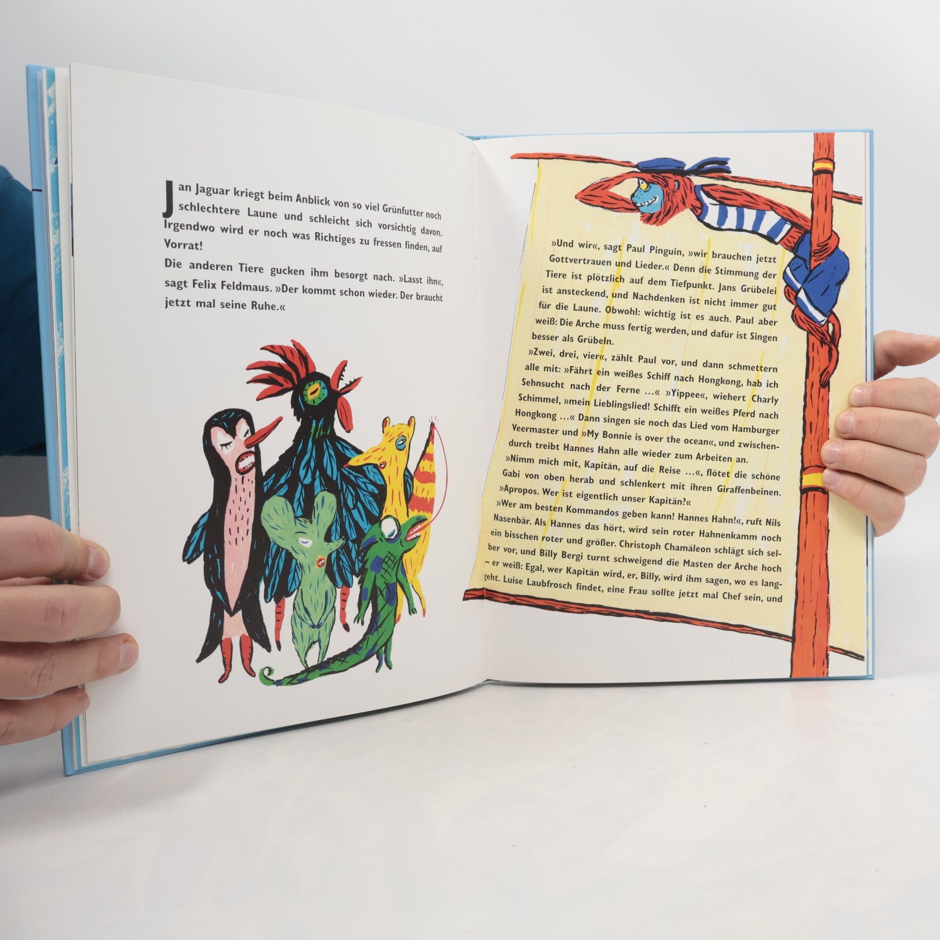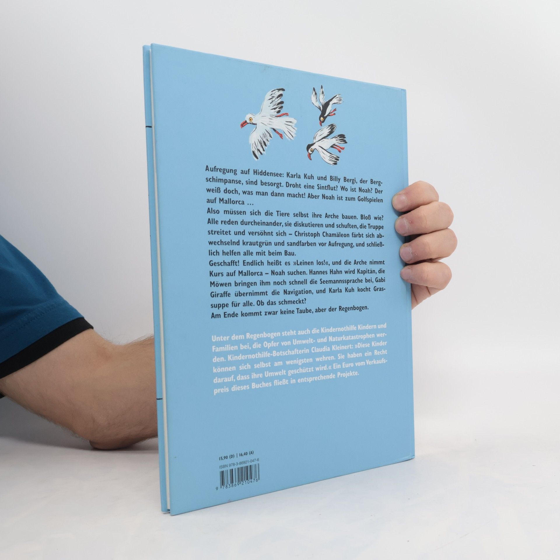 Aufregung auf Hiddensee: Karla Kuh und Billy Bergi, der Bergschimpanse, sind besorgt. Droht eine Sintflut? Wo ist Noah? Der weiß doch, was man dann macht! Aber Noah ist zum Golfspielen auf Mallorca … Also müssen sich die Tiere selbst ihre Arche bauen. Bloß wie? Alle reden durcheinander, sie diskutieren und schuften, die Truppe streitet und versöhnt sich – Christoph Chamäleon färbt sich abwechselnd krautgrün und sandfarben vor Aufregung, und schließlich helfen alle mit beim Bau. Geschafft! Endlich heißt es 'Leinen los!', und die Arche nimmt Kurs auf Mallorca – Noah suchen. Hannes Hahn wird Kapitän, die Möwen bringen ihm noch schnell die Seemannssprache bei, Gabi Giraffe übernimmt die Navigation, und Karla Kuh kocht Grassuppe für alle. Ob das schmeckt? Am Ende kommt zwar keine Taube, aber der Regenbogen. Unter dem Regenbogen steht auch die Kindernothilfe Kindern und Familien bei, die Opfer von Umwelt- und Naturkatastrophen werden. Kindernothilfe-Botschafterin Claudia Kleinert: 'Diese Kinder können sich selbst am wenigsten wehren. Sie haben ein Recht darauf, dass ihre Umwelt geschützt wird.' Ein Euro vom Verkaufspreis dieses Buches fließt in entsprechende Projekte.