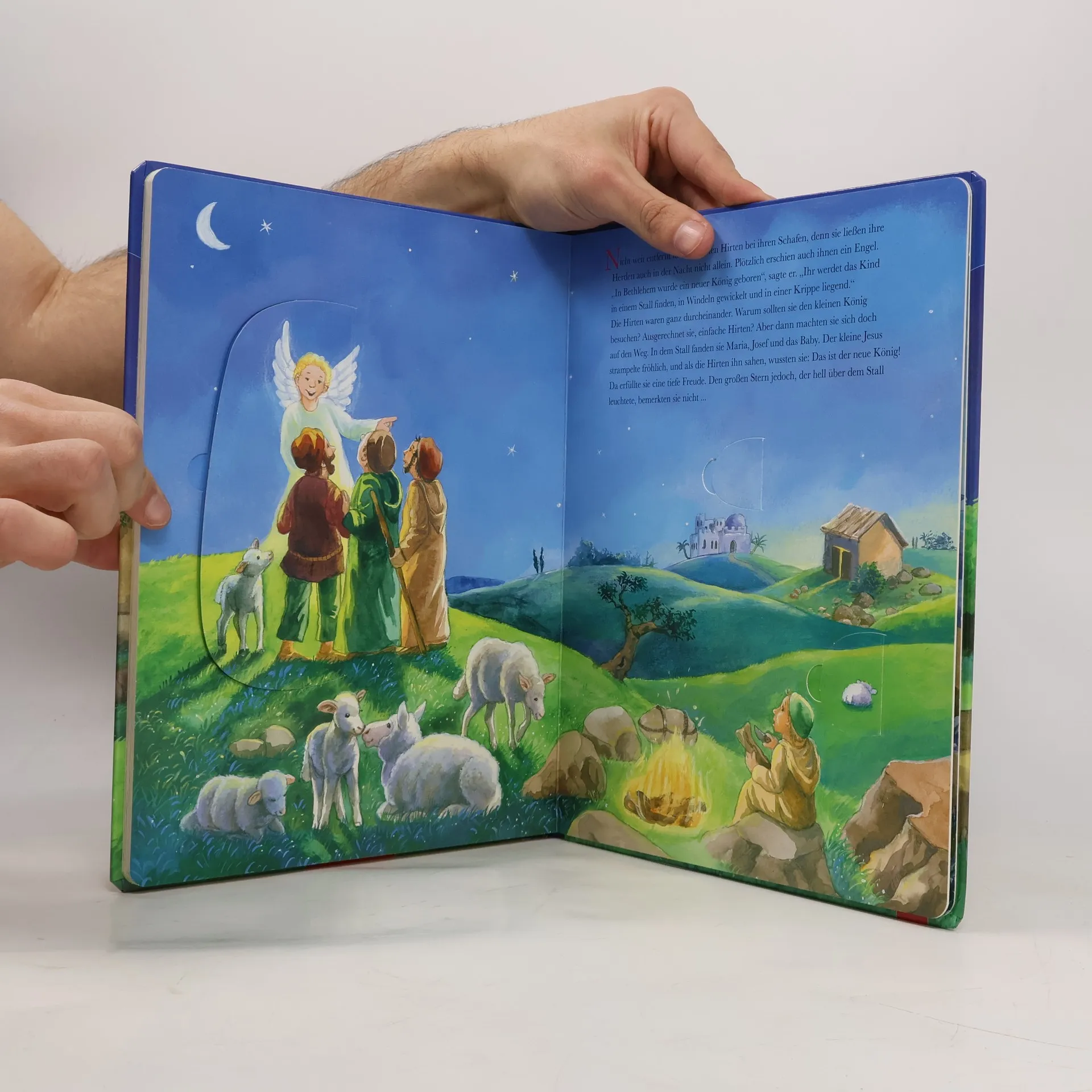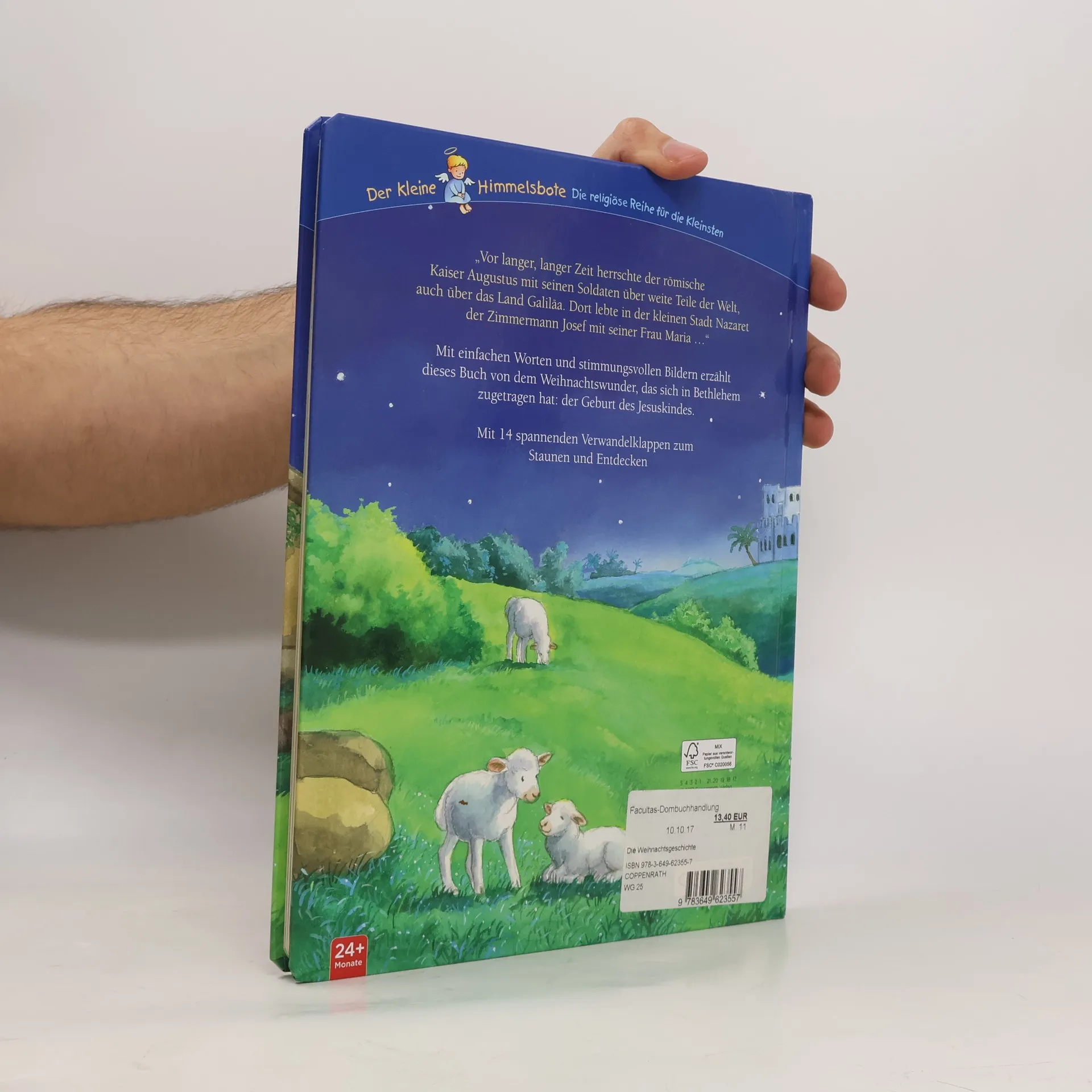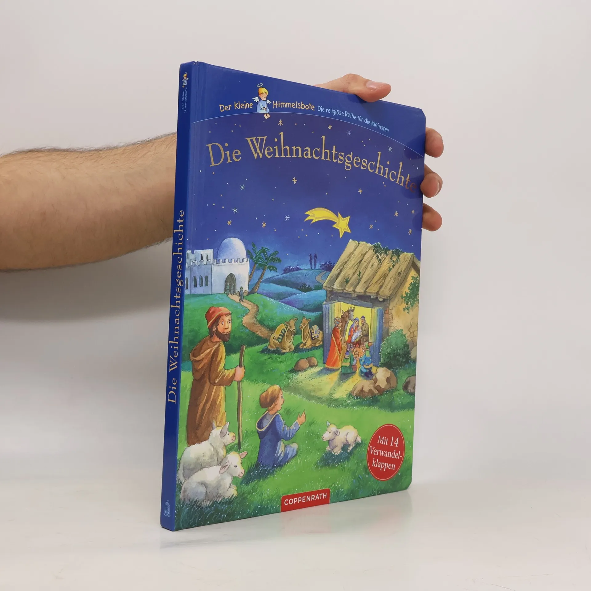 „Vor langer, langer Zeit herrschte der römische Kaiser Augustus mit seinen Soldaten über weite Teile der Welt, auch über das Land Galiläa. Dort lebte in der kleinen Stadt Nazaret der Zimmermann Josef mit seiner Frau Maria …“ Mit einfachen Worten und stimmungsvollen Bildern erzählt dieses Buch von dem Weihnachtswunder, das sich in Bethlehem zugetragen hat: der Geburt des Jesuskindes. Mit 14 spannenden Verwandelklappen zum Staunen und Entdecken