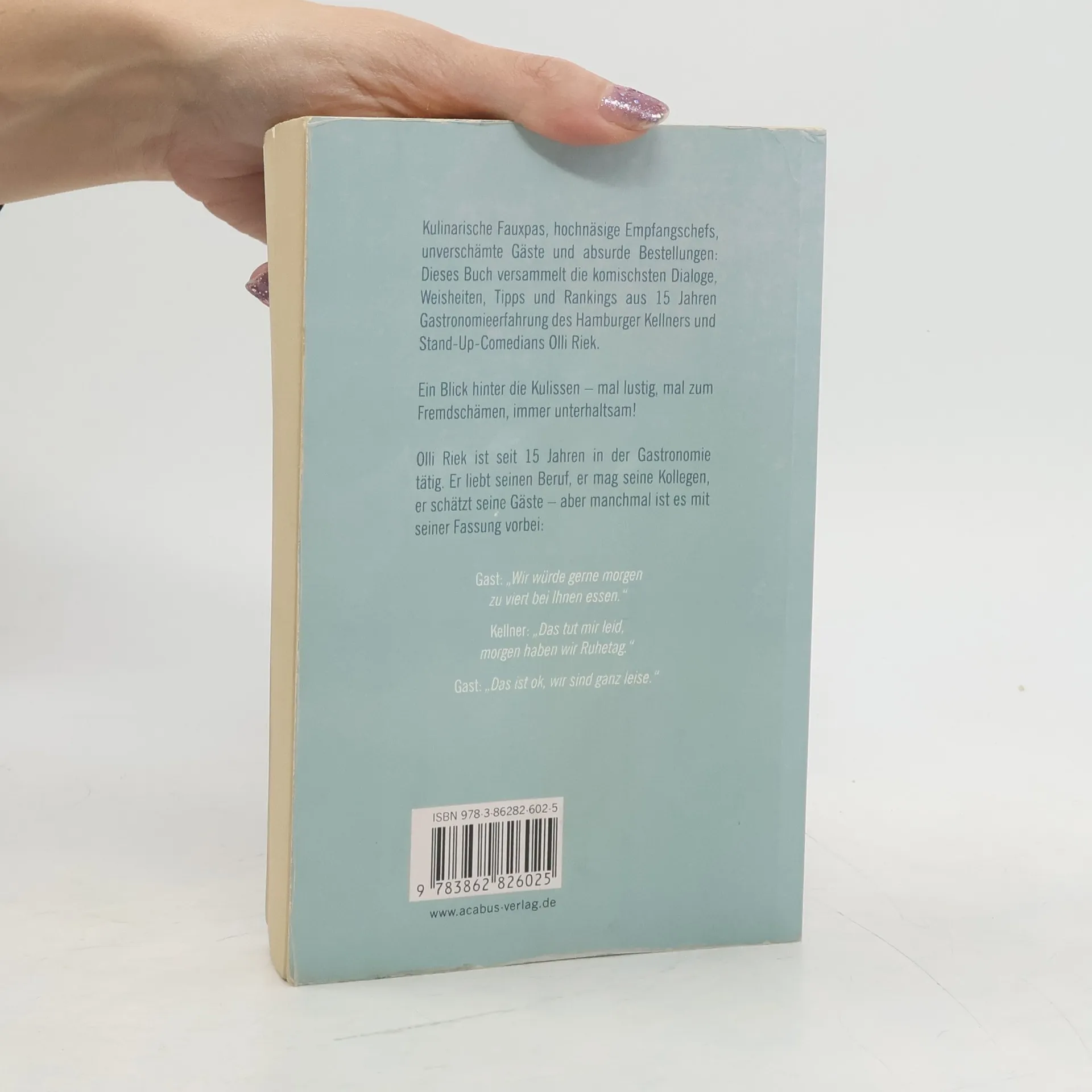 Kulinarische Fauxpas, hochnäsige Empfangschefs, unverschämte Gäste und absurde Bestellungen: Dieses Buch versammelt die komischsten Dialoge, Weisheiten, Tipps und Rankings aus 15 Jahren Gastronomieerfahrung des Hamburger Kellners und Stand-Up-Comedians Olli Riek. Ein Blick hinter die Kulissen – Mal lustig, mal zum Fremdschämen, immer unterhaltsam! Olli Riek ist seit 15 Jahren in der Gastronomie tätig. Er liebt seinen Beruf, er mag seine Kollegen, er schätzt seine Gäste – aber manchmal ist es mit seiner Fassung vorbei: Gast: „Wir würden gerne morgen zu viert bei Ihnen essen.“ Kellner: „Das tut mir leid, morgen haben wir Ruhetag.“ Gast: „Das ist ok, wir sind ganz leise.“
