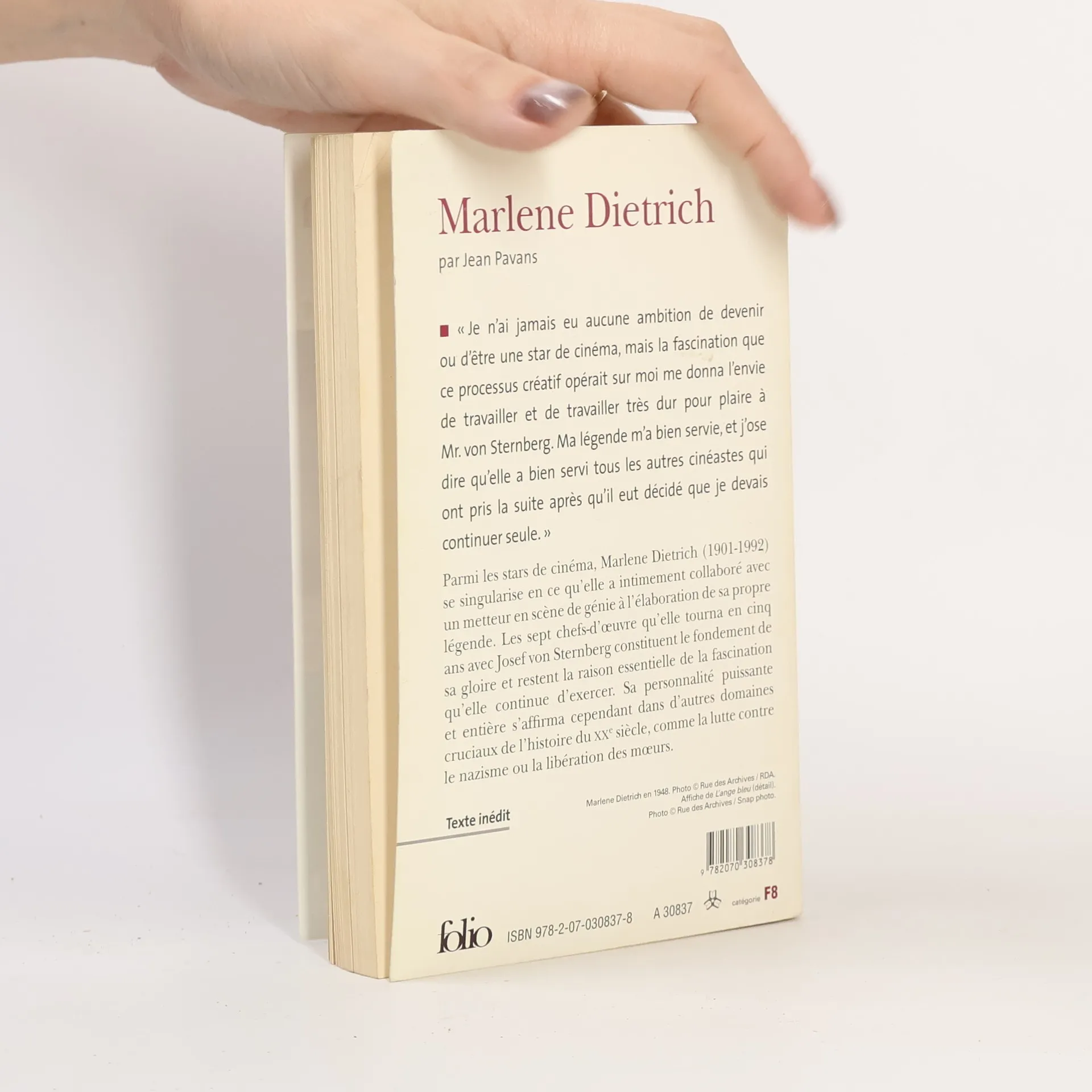 " Je n'ai jamais eu aucune ambition de devenir ou d'être une star de cinéma, mais la fascination que ce processus créatif opérait sur moi me donna l'envie de travailler et de travailler très dur pour plaire à Mr. von Sternberg. Ma légende m'a bien servie, et j'ose dire qu'elle a bien servi tous les autres cinéastes qui ont pris la suite après qu'il eut décidé que je devais continuer seule. " Parmi les stars de cinéma, Marlene Dietrich (1901-1992) se singularise en ce qu'elle a intimement collaboré avec un metteur en scène de génie à l'élaboration de sa propre légende. Les sept chefs-d'œuvre qu'elle tourna en cinq ans avec Josef von Sternberg constituent le fondement de sa gloire et restent la raison essentielle de la fascination qu'elle continue d'exercer. Sa personnalité puissante et entière s'affirma cependant dans d'autres domaines cruciaux de l'histoire du XXe siècle, comme la lutte contre le nazisme ou la libération des mœurs.