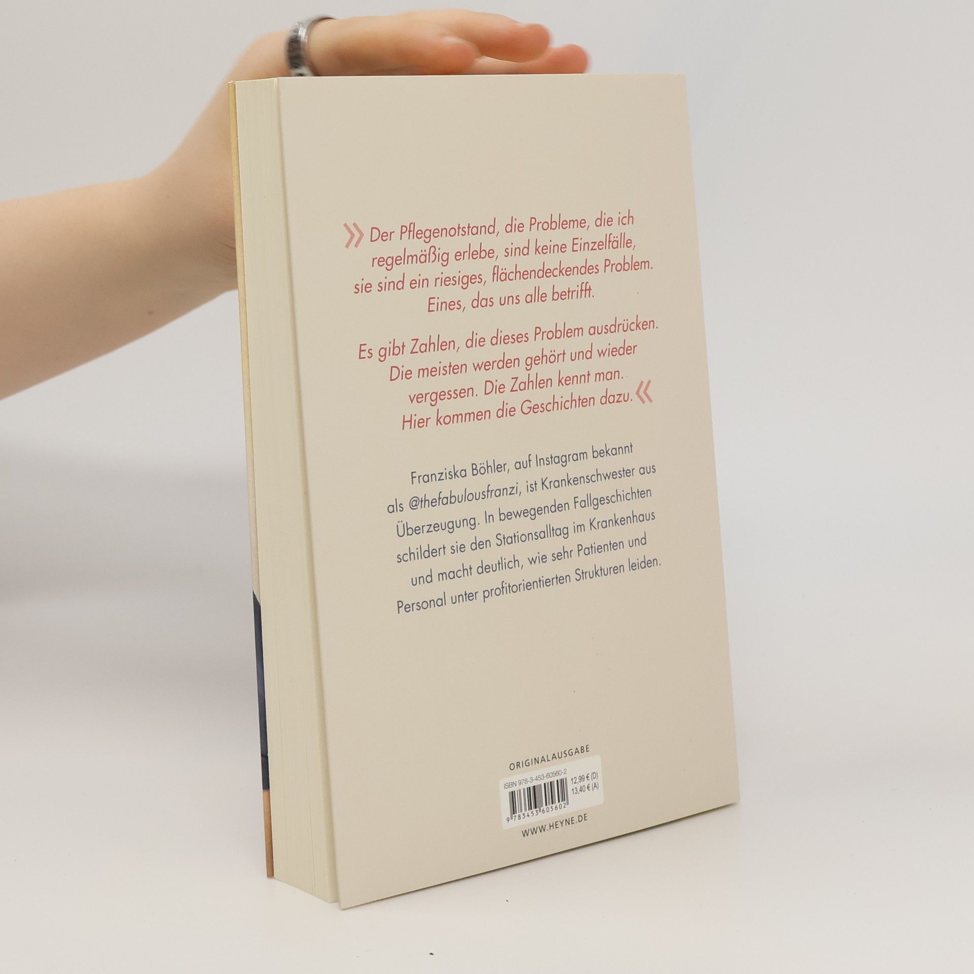 Franziska Böhler, Krankenschwester aus Überzeugung, schildert in bewegenden Fallgeschichten den Stationsalltag im Krankenhaus und macht deutlich, wie sehr Patienten und Personal unter profitorientierten Strukturen leiden.Sie hat sich für Nachtdienste und Wochenendschichten entschieden, für viel Arbeit und noch mehr Verantwortung, für einen Job, der sie fordert – ihr Herz und ihren Verstand. Nicht entschieden hat sie sich für Dienste in ständiger Unterbesetzung, für Bedingungen, die Pflege und Medizin gefährlich und unmenschlich machen. Und doch finden sich Pflegekräfte immer öfter in dieser Situation: Sie arbeiten in einem Gesundheitssystem, das längst selbst dringend Hilfe braucht.In ergreifenden Fallgeschichten aus ihrem Arbeitsalltag, aber auch von Patienten, Hebammen, Auszubildenden und Ärzten macht Franziska Böhler deutlich, wieviel Leid der Kostendruck und der Personalmangel in Krankenhäusern und Altenheimen verursachen. Die Zahlen zum Pflegenotstand hat vermutlich jeder schon mal gehört. Franziska Böhler schildert die Geschichten dahinter. Dabei vergisst sie auch die guten Momente nicht. Momente, die es wert sind, sich trotz allem genau für diesen Beruf immer wieder zu entscheiden. Ausgezeichnet mit dem LovelyBooks Leserpreis 2020 in Silver.