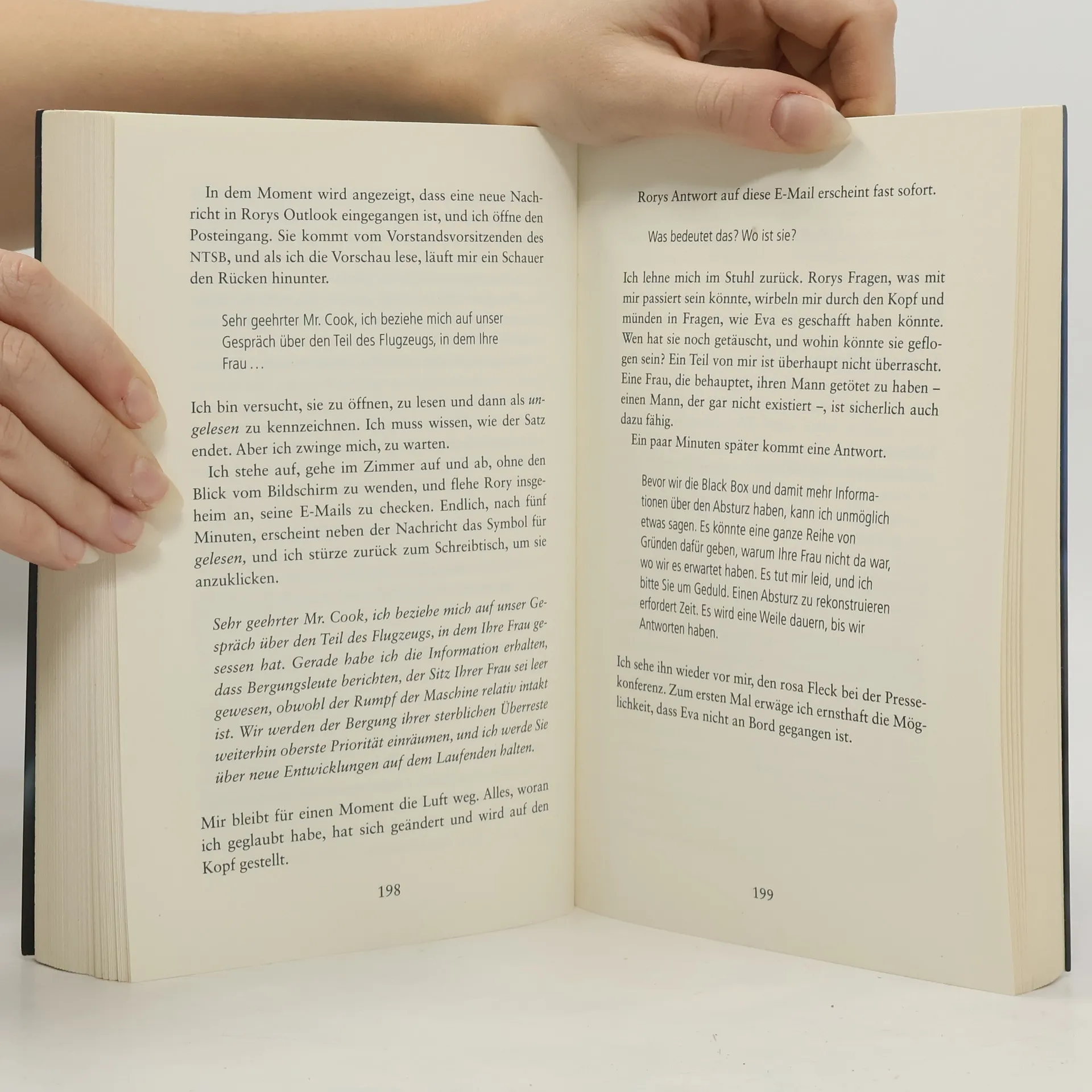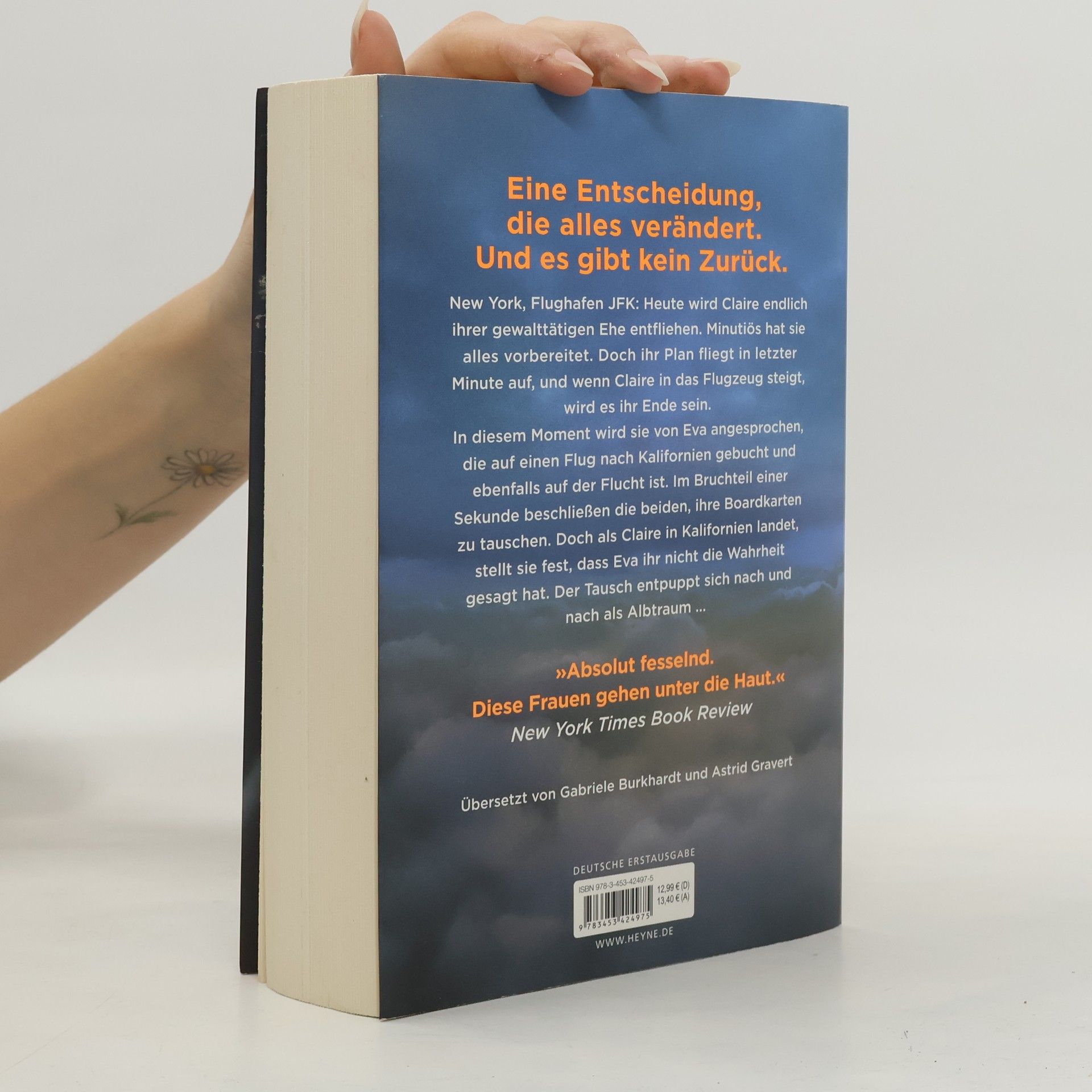 Zwei Frauen auf der Flucht. Eine Entscheidung, die alles verändert. Und kein Weg zurück. New York, Flughafen JFK: Claire soll nach Puerto Rico reisen, um ihren Mann, einen ehrgeizigen Politiker, beim Wahlkampf zu unterstützen. Doch in Wahrheit will sie nichts als fliehen – vor seinen gewalttätigen Übergriffen und der lückenlosen Kontrolle, die er über sie ausübt. Sie kommt mit Eva ins Gespräch, die bei ihrem schwerkranken Mann Sterbehilfe geleistet hat. Zu Hause in Kalifornien erwartet sie die Polizei. Innerhalb weniger Sekunden beschließen sie, die Bordkarten zu tauschen und sich gegenseitig ein neues Leben zu schenken.Erleichtert landet Claire in Kalifornien. In Evas Haus gibt es allerdings keine Hinweise auf einen Ehemann. Dann erfährt sie, dass das Flugzeug nach Puerto Rico abgestürzt ist. Und kurz darauf entdeckt sie die vermeintlich abgestürzte Eva in einer Fernsehreportage über das Unglück. Lebendig. Hat sie die Flucht in das Leben einer Anderen am Ende doch nur in eine Falle gelockt?