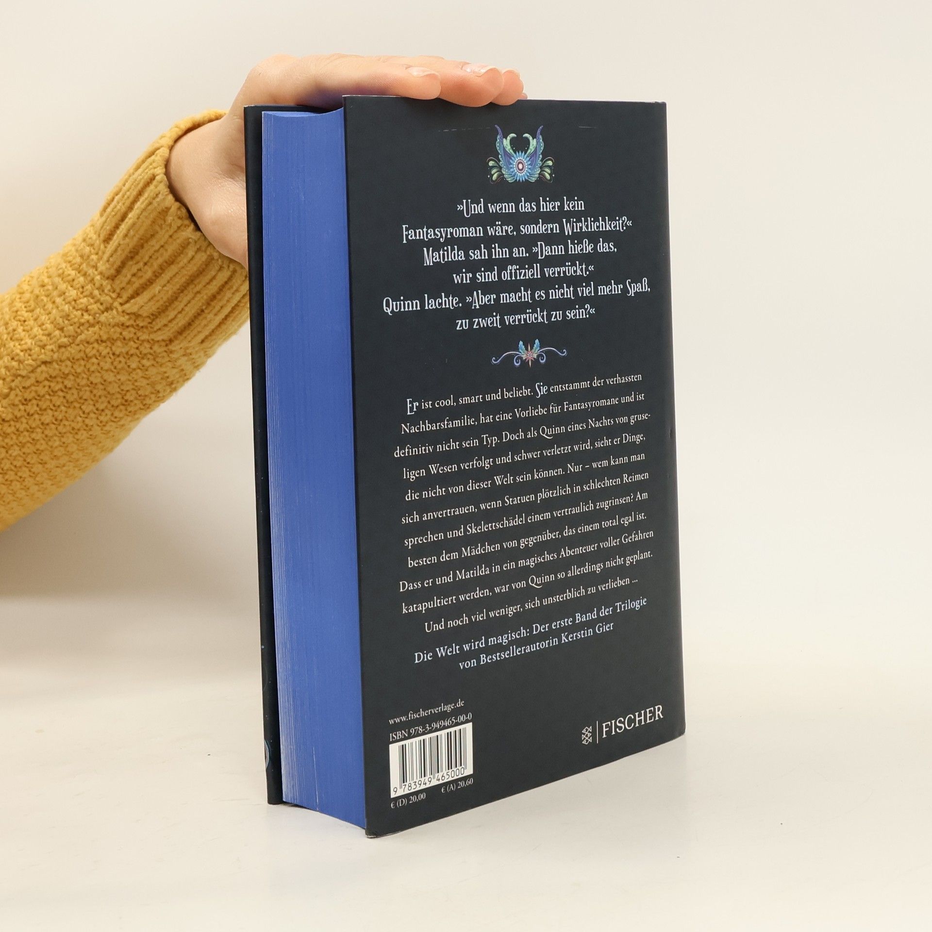Bestsellerautorin Kerstin Gier öffnet uns nach der »Edelstein«- und der »Silber«-Trilogie die Tür zu einer neuen phantastischen Welt und erzählt eine mitreißende Liebesgeschichte aus zwei Perspektiven: Quinn ist cool, smart und beliebt. Matilda entstammt der verhassten Nachbarsfamilie, hat eine Vorliebe für Fantasyromane und ist definitiv nicht sein Typ. Doch als Quinn eines Nachts von gruseligen Wesen verfolgt und schwer verletzt wird, sieht er Dinge, die nicht von dieser Welt sein können. Nur – wem kann man sich anvertrauen, wenn Statuen plötzlich in schlechten Reimen sprechen und Skelettschädel einem vertraulich zugrinsen? Am besten dem Mädchen von gegenüber, das einem total egal ist. Dass er und Matilda in ein magisches Abenteuer voller Gefahren katapultiert werden, war von Quinn so allerdings nicht geplant. Und noch viel weniger, sich unsterblich zu verlieben …