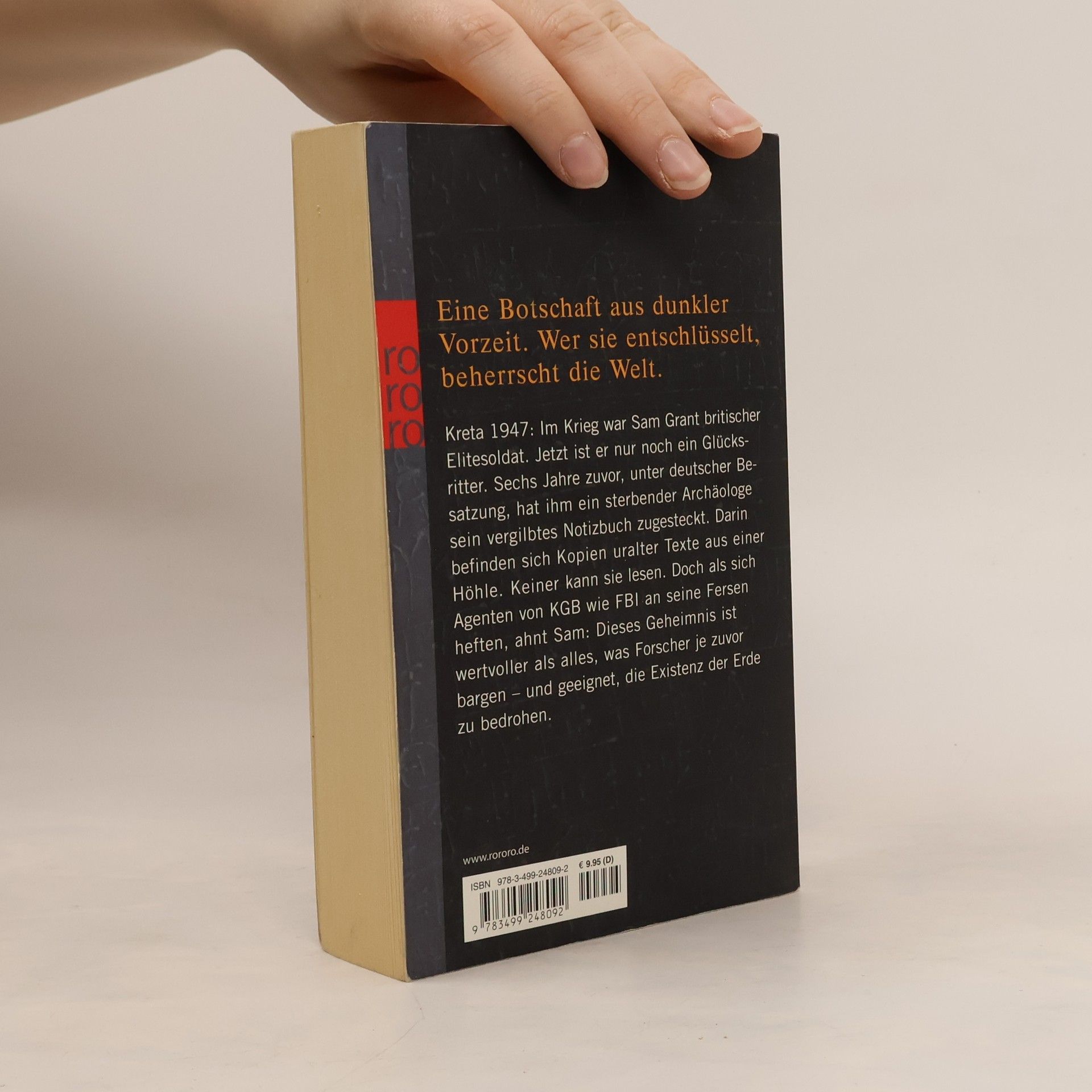 Eine Botschaft aus dunkler Vorzeit. Wer sie entschlüsselt, beherrscht die Welt.Kreta 1947: Im Krieg war Sam Grant britischer Elitesoldat. Jetzt ist er nur noch ein Glücksritter. Sechs Jahre zuvor, unter deutscher Besatzung, hat ihm ein sterbender Archäologe sein vergilbtes Notizbuch zugesteckt. Darin befinden sich Kopien uralter Texte aus einer Höhle. Keiner kann sie lesen. Doch als sich Agenten von KGB wie FBI an seine Fersen heften, ahnt Sam: Dieses Geheimnis ist wertvoller als alles, was Forscher je zuvor bargen – und geeignet, die Existenz der Erde zu bedrohen.