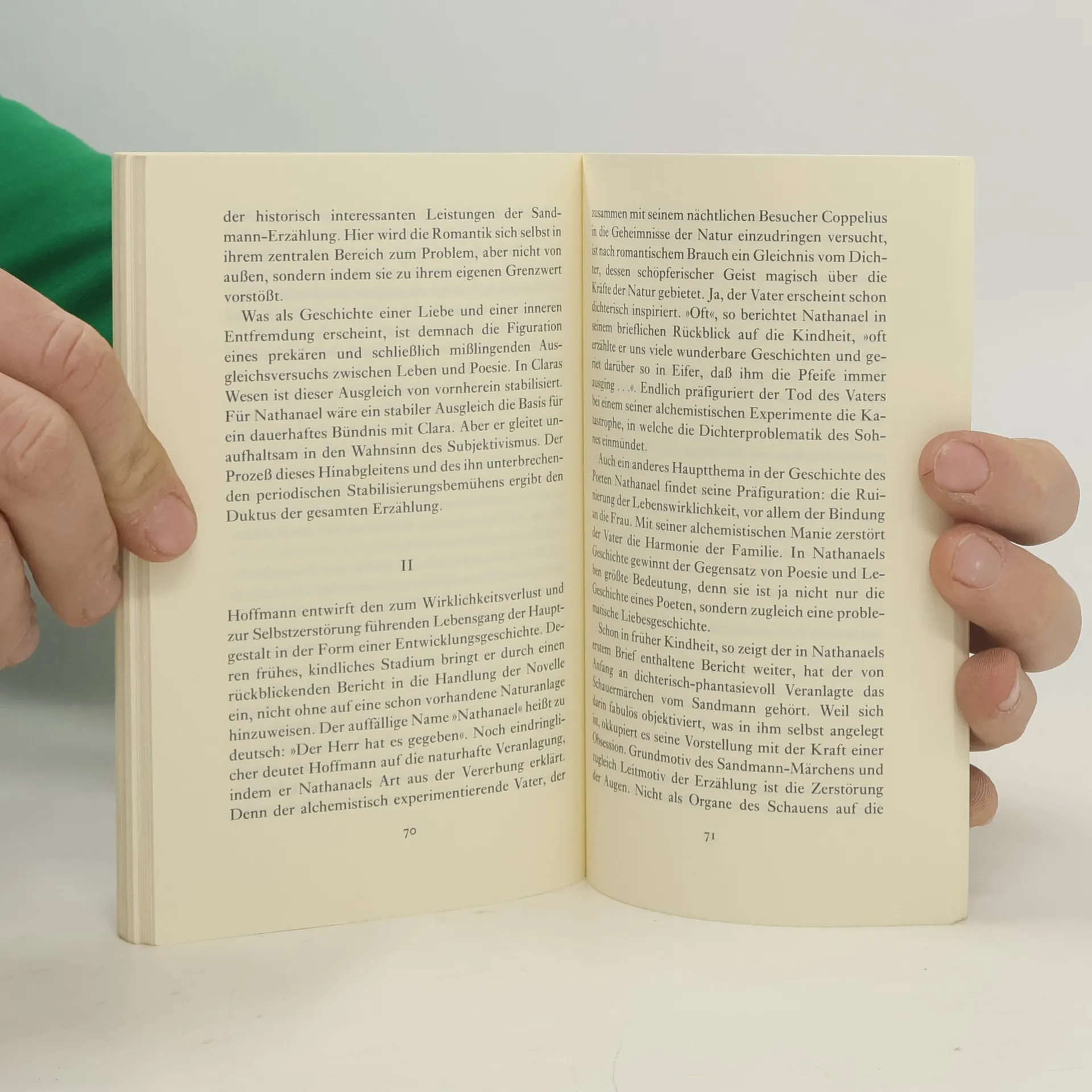Unter Hoffmanns Werken hat Der Sandmann das weitaus größte Interesse gefunden. Sein Grundproblem ist die Selbstverfallenheit des Menschen, der aus dem Gefängnis seines Ichs nicht mehr herausfindet, deshalb in seinen Lebensbeziehungen, vor allem in seiner Liebesbindung tragisch scheitert und am Ende sich selbst zerstören muß.