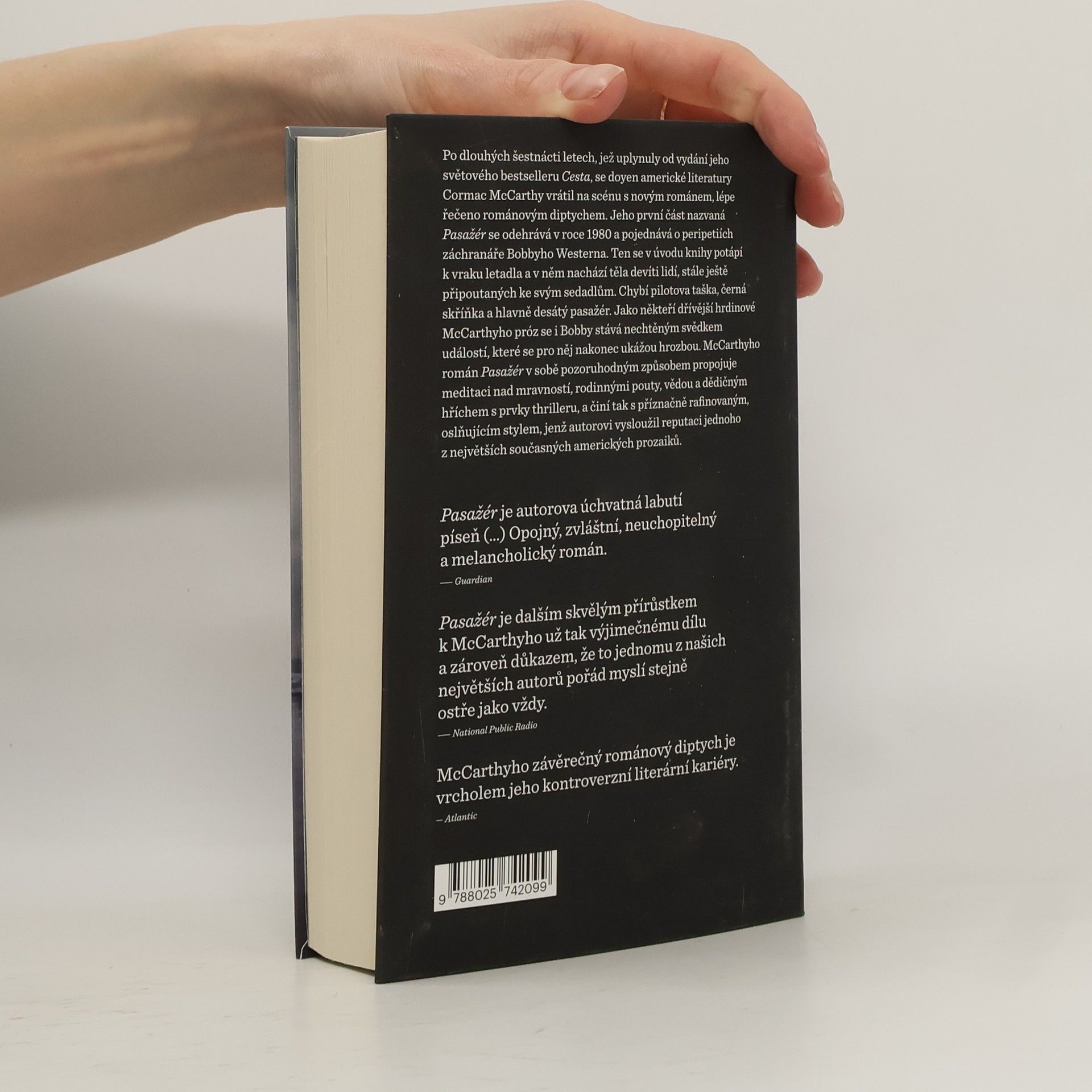 Po dlouhých šestnácti letech, jež uplynuly od vydání jeho světového bestselleru Cesta, se žijící klasik americké literatury Cormac McCarthy vrací na scénu s novým dílem. Jeho román Pasažér se odehrává v roce 1980 a sleduje osudy záchranáře Bobbyho Westerna, který se z člunu pobřežní hlídky vrhá k potopenému vraku letadla. V něm nachází těla devíti lidí, stále ještě připoutaných ke svým sedadlům. Chybí pilotova taška, černá skříňka a hlavně desátý pasažér. Jako někteří dřívější hrdinové McCarthyho románů se i Bobby Western stává nechtěným svědkem událostí, které se pro něj nakonec ukážou hrozbou. McCarthyho román Pasažér v sobě pozoruhodným způsobem propojuje meditaci nad mravností, vědou a dědičným hříchem s prvky thrilleru, a činí tak s příznačně rafinovaným, oslňujícím stylem, jenž autorovi vysloužil reputaci jednoho z největších současných amerických prozaiků.