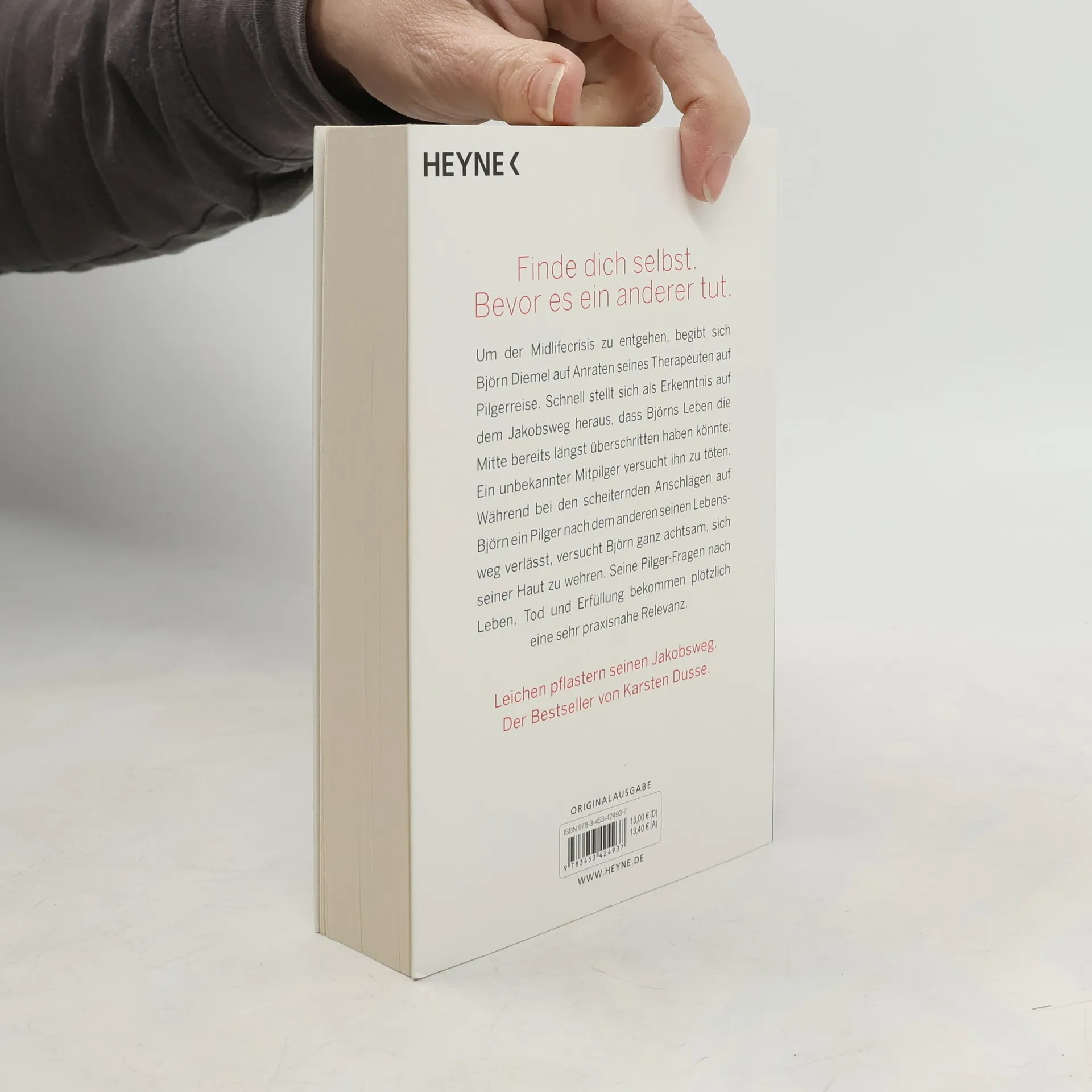 Finde dich selbst. Bevor es ein anderer tut. Um der Midlifecrisis zu entgehen, begibt sich Björn Diemel auf Anraten seines Therapeuten auf Pilgerreise. Schnell stellt sich als Erkenntnis auf dem Jakobsweg heraus, dass Björns Leben die Mitte bereits längst überschritten haben könnte: Ein unbekannter Mitpilger versucht, ihn zu töten. Während bei den scheiternden Anschlägen auf ihn ein Pilger nach dem anderen seinen Lebensweg verlässt, versucht Björn ganz achtsam, sich seiner Haut zu wehren. Seine Pilger-Fragen nach Leben, Tod und Erfüllung bekommen plötzlich eine sehr praxisnahe Relevanz.