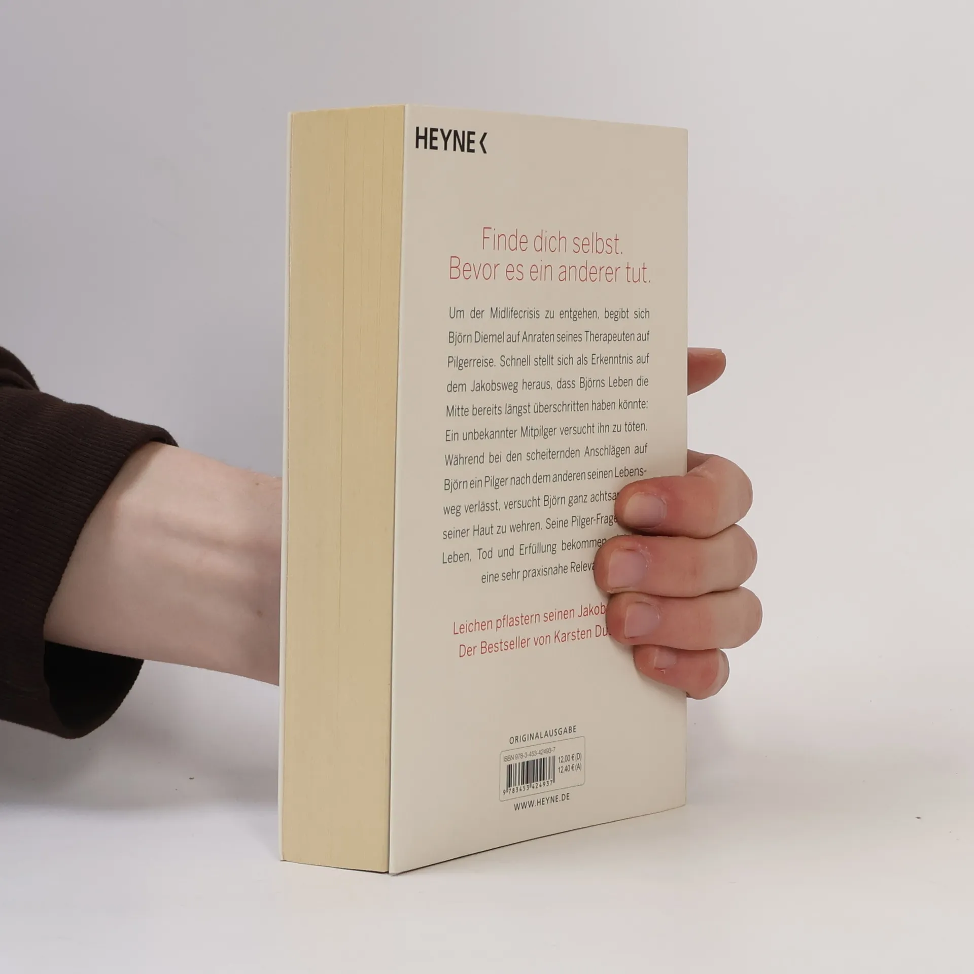 Finde dich selbst. Bevor es ein anderer tut. Um der Midlifecrisis zu entgehen, begibt sich Björn Diemel auf Anraten seines Therapeuten auf Pilgerreise. Schnell stellt sich als Erkenntnis auf dem Jakobsweg heraus, dass Björns Leben die Mitte bereits längst überschritten haben könnte: Ein unbekannter Mitpilger versucht, ihn zu töten. Während bei den scheiternden Anschlägen auf ihn ein Pilger nach dem anderen seinen Lebensweg verlässt, versucht Björn ganz achtsam, sich seiner Haut zu wehren. Seine Pilger-Fragen nach Leben, Tod und Erfüllung bekommen plötzlich eine sehr praxisnahe Relevanz.