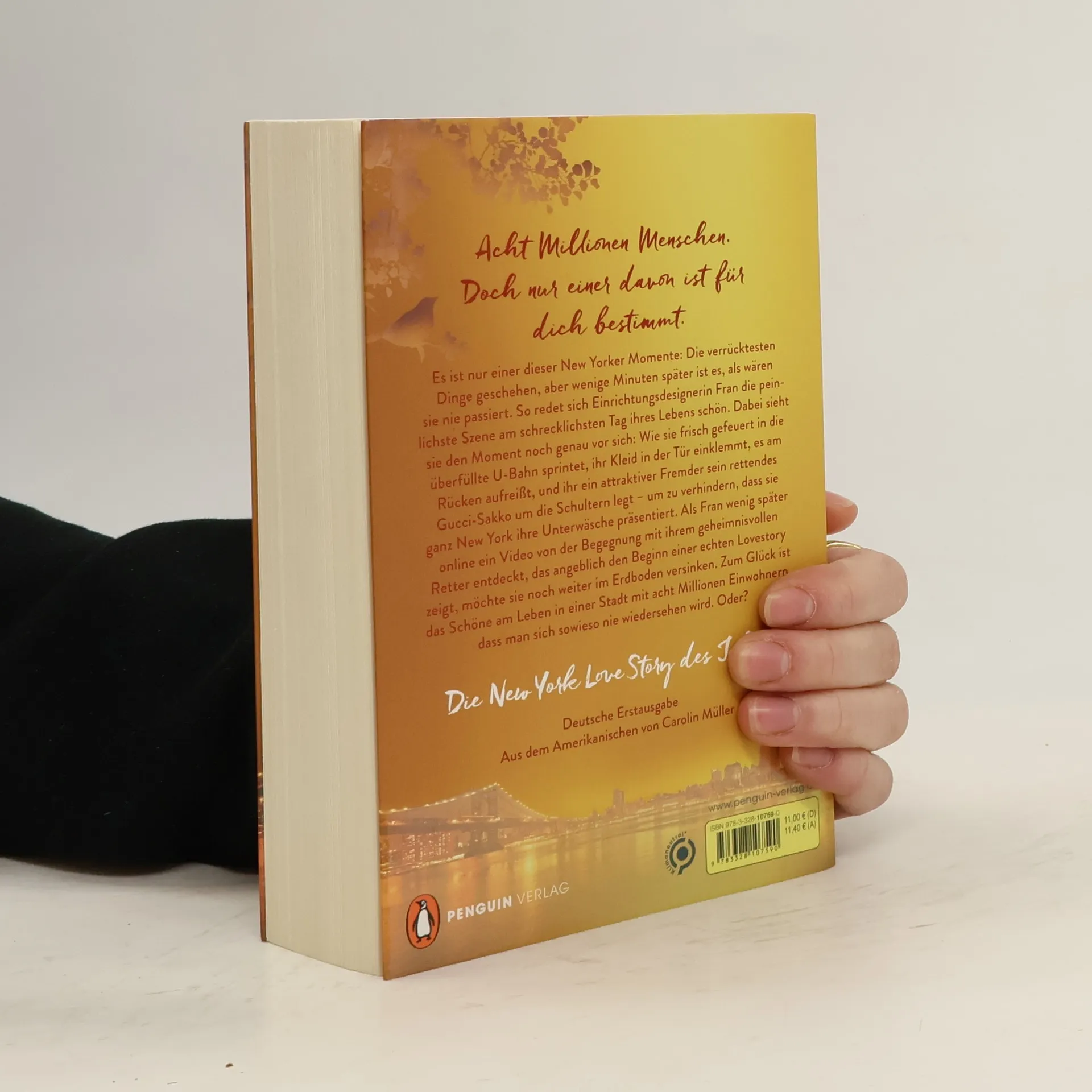 Acht Millionen Menschen. Doch nur einer davon ist für dich bestimmt. Es ist nur einer dieser New Yorker Momente: Die verrücktesten Dinge geschehen, aber wenige Minuten später ist es, als wären sie nie passiert. So redet sich Einrichtungsdesignerin Fran die peinlichste Szene am schrecklichsten Tag ihres Lebens schön. Dabei sieht sie den Moment noch genau vor sich: Wie sie frisch gefeuert und schwitzend in die überfüllte U-Bahn sprintet, ihr Kleid in der Tür einklemmt, es am Rücken aufreißt, und ihr ein attraktiver Fremder sein rettendes Gucci-Sakko um die Schultern legt – um zu verhindern, dass sie ganz New York ihre Unterwäsche präsentiert. Als Fran wenig später online ein Video von der Begegnung mit ihrem geheimnisvollen Retter entdeckt, das angeblich den Beginn einer echten Lovestory zeigt, möchte sie noch weiter im Erdboden versinken. Zum Glück ist das Schöne am Leben in einer Stadt mit acht Millionen Einwohnern, dass man sich sowieso nie wiedersehen wird. Oder? Spaziergänge im Central Park, Sonnenuntergänge auf der Brooklyn Bridge und romantische Stunden zu zweit: Die schönste New York Love Story des Jahres! Hochwertig veredelt – ein Buch, das funkelt wie die Lichter am Broadway