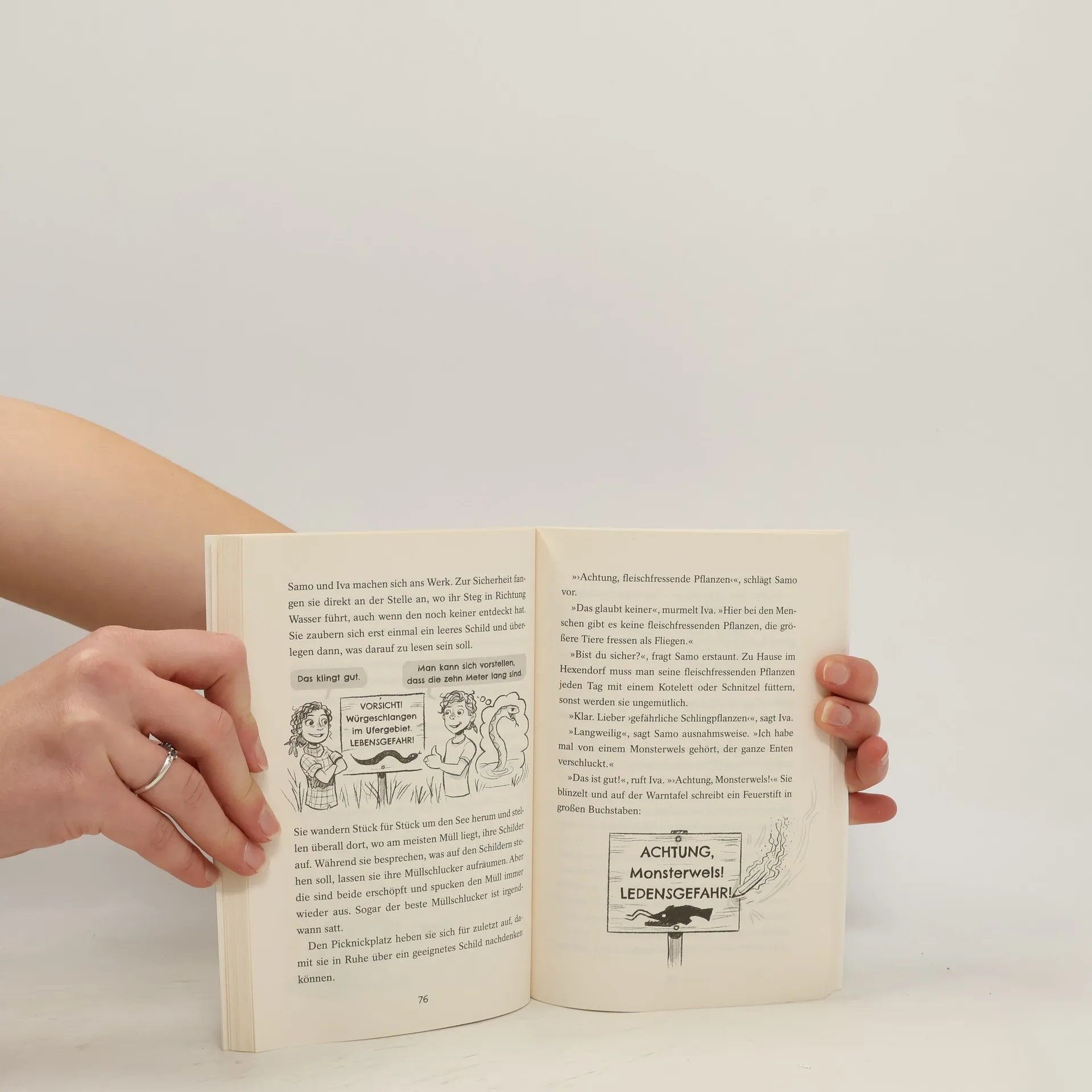 Das Seepraktikum Auf die Wasserhexen Iva und Samo wartet ein großes Abenteuer: An ihrem zehnten Geburtstag bekommen sie endlich einen richtig guten Besen geschenkt, der sie zu einem geheimen See bringt. Es wird ihre Aufgabe sein, einen Monat lang auf das Gewässer aufzupassen. Doch auch wenn sie auf einem coolen Hausboot unterkommen, Iva und Samo können sich nicht ausstehen. Als ein Influencer ein Video am See dreht, ist es endgültig vorbei mit der Idylle. Fans pilgern an den Drehort und hinterlassen ihre Abfälle. Eine Kindergruppe, die sich vorher schon regelmäßig am Ufer getroffen hat, ist darüber genauso wütend wie die Wasserhexen. Ein gemeinsamer Plan muss her, um den See zu retten. Dabei bemerken Iva und Samo, dass sie vielleicht doch mehr verbindet, als sie zunächst dachten. Ausstattung: Mit s/w Illustrationen