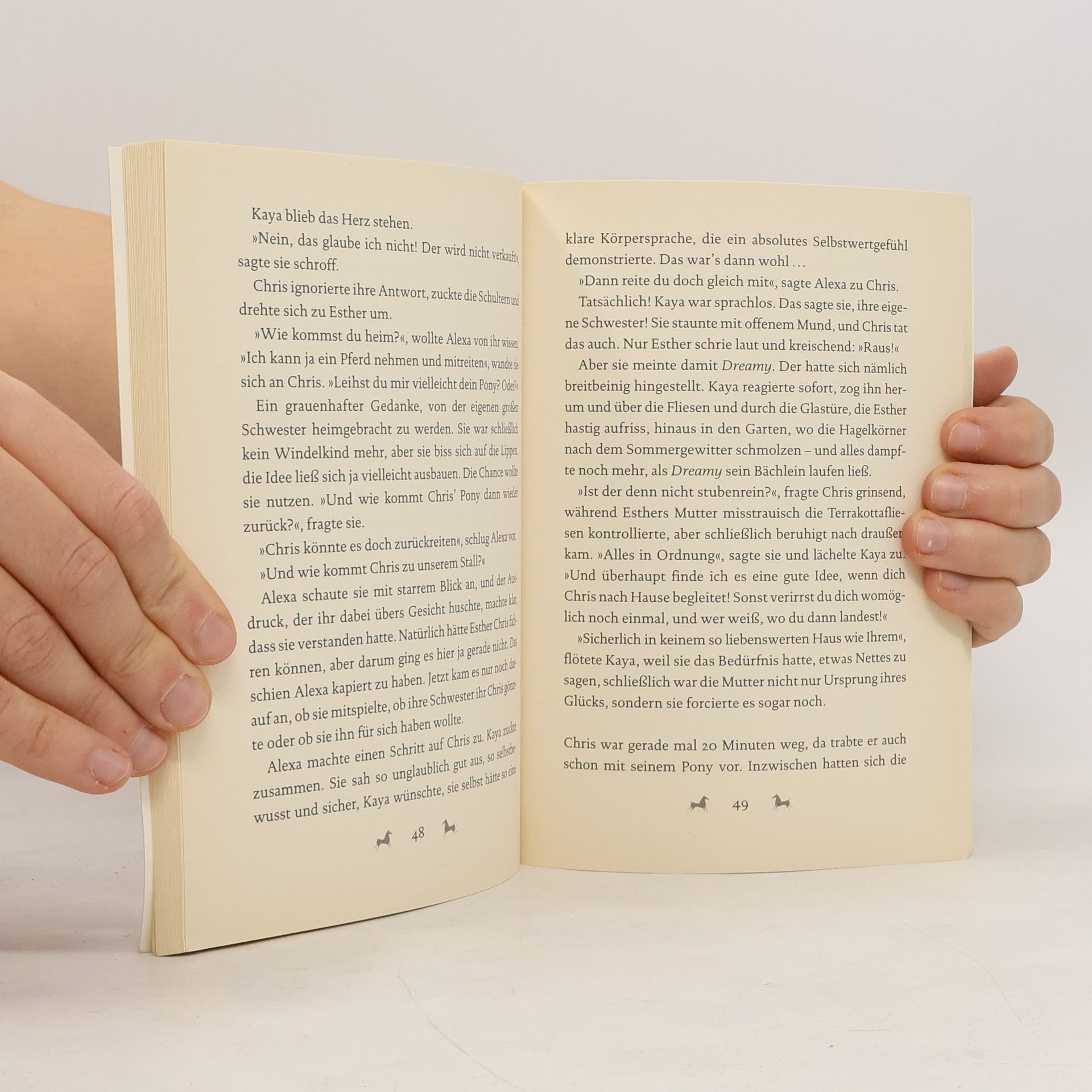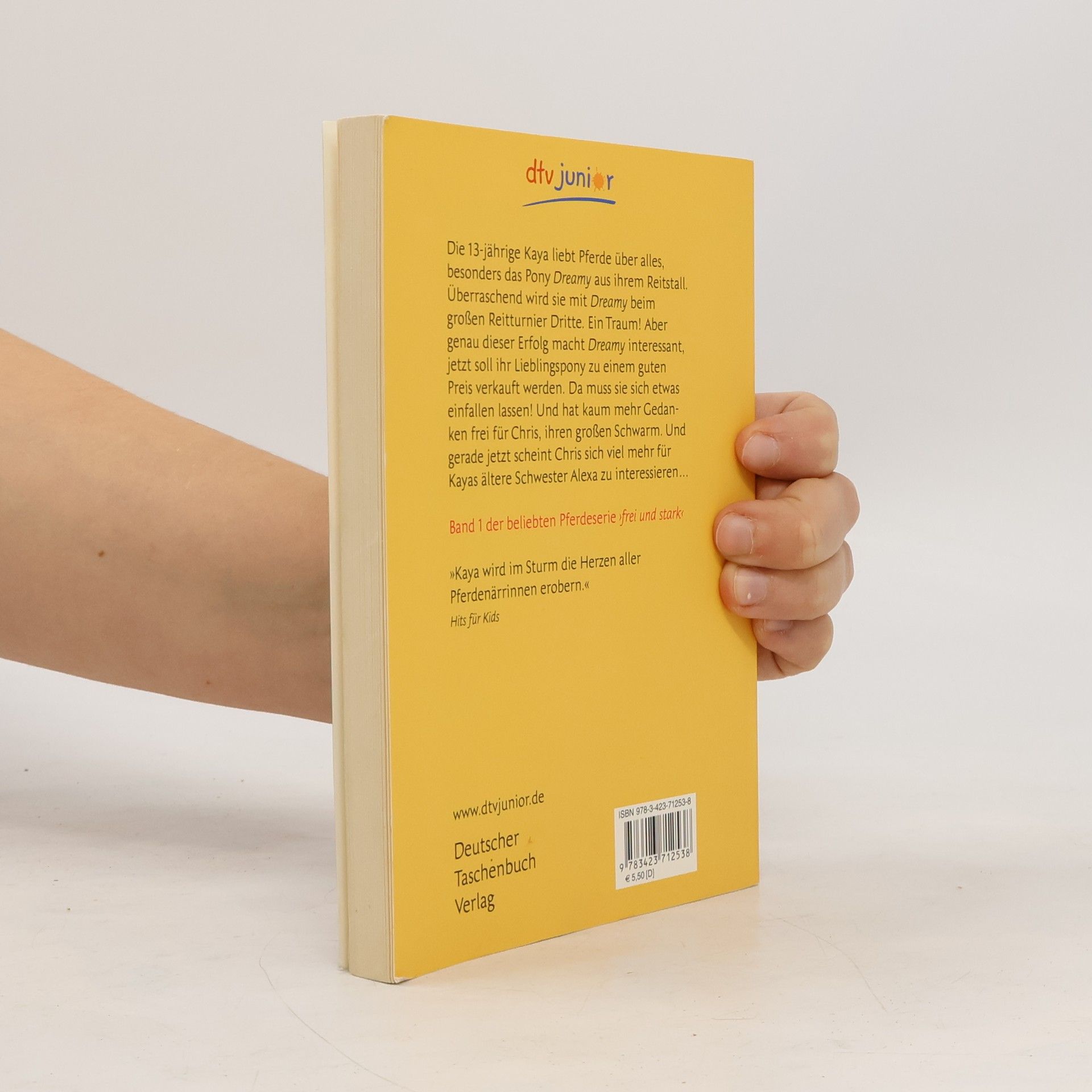 'Du machst das', flüsterte sie ihm zu. 'Und wenn wir das schaffen, kriegst du gleich vier Karotten auf einmal von mir!' Wenn nicht, dann auch, dachte sie, aber das musste er ja nicht wissen. Die 13-jährige Kaya liebt Pferde über alles, besonders das Pony Dreamy aus ihrem Reitstall. Als sie mit ihm beim großen Reitturnier überraschend Dritte wird, ist ihr Glück perfekt. Noch perfekter wird es, als sie unter den Teilnehmern auch den 15-jährigen Chris entdeckt, mit dem sie beim Weihnachtsreiten so nett gequatscht hatte. Chris sieht einfach umwerfend aus #150; das findet nicht nur Kaya. Doch Chris interessiert sich viel mehr für Kayas bereits 17-jährige Schwester Alexa. Und Dreamy soll nach dem großen Erfolg für einen guten Preis verkauft werden. Eine schreckliche Vorstellung. Kaya denkt an Entführung #150; von Dreamy, nicht von Chris. Aber für den muss sie sich auch etwas einfallen lassen.
