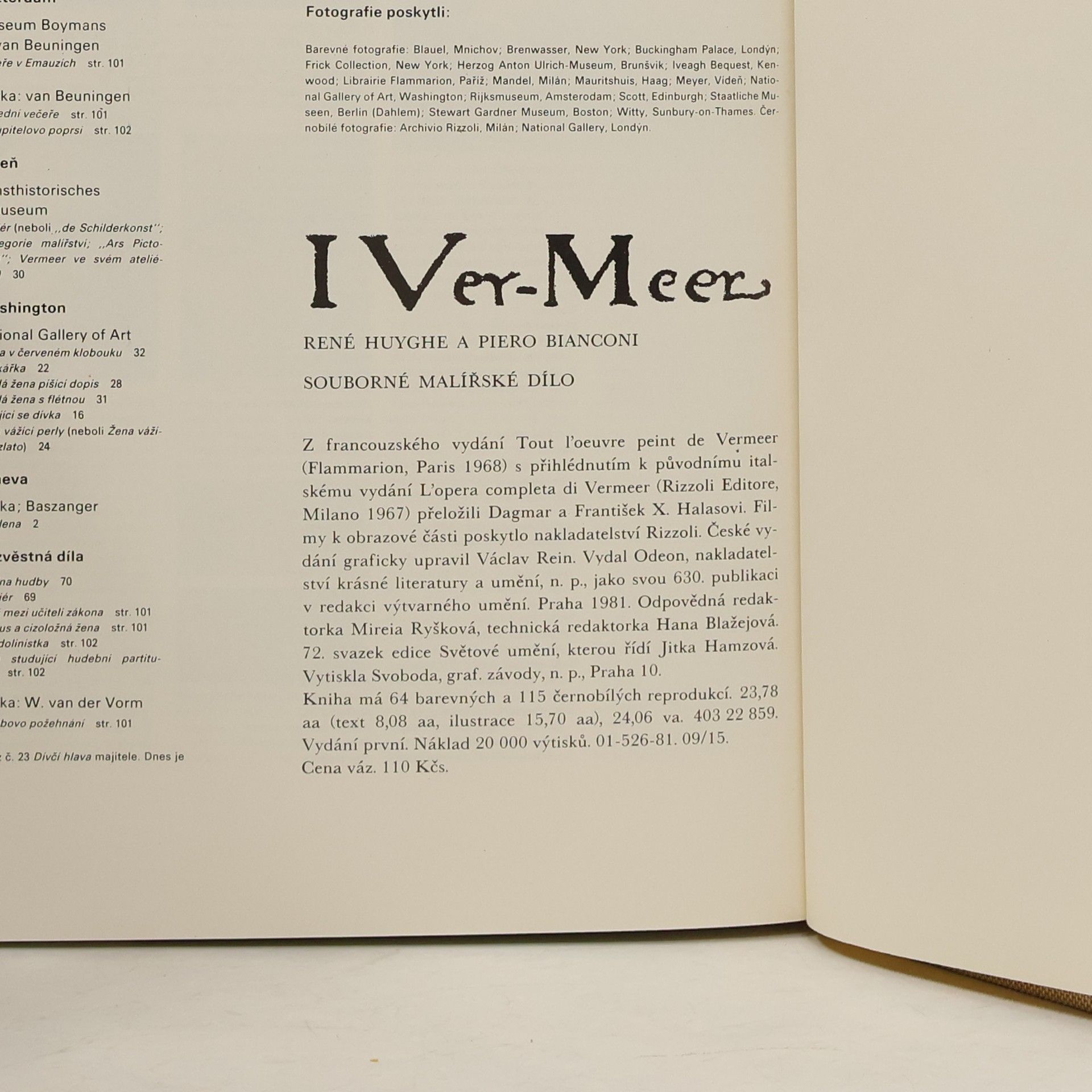Uměleckohistorická publikace přináší vedle úvodní studie, která hodnotí přenos holandského malíře 17. století Jana Vermeera van Delft i průřez kritikou jeho díla a řadu barevných reprodukcí Vermeerových obrazů. Uvádí podrobné životopisné údaje, základní bibliografii a chronologickýa ikonografický seznam všech obrazů, které Vermeer vytvořil anebo které se mu připisují.