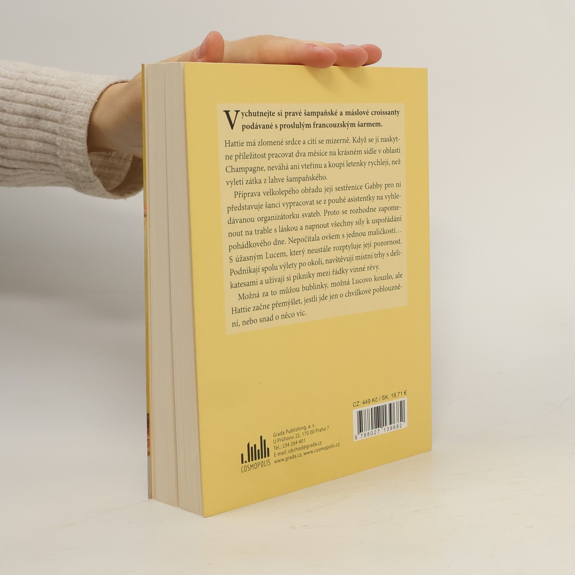 Vychutnejte si pravé šampaňské a máslové croissanty podávané s proslulým francouzským šarmemHattie má zlomené srdce a cítí se mizerně. Když se jí naskytne příležitost pracovat dva měsíce na krásném sídle v oblasti Champagne, neváhá ani vteřinu a koupí letenky rychleji, než vyletí zátka z lahve šampaňského.Příprava velkolepého obřadu její sestřenice Gabby pro ni představuje šanci vypracovat se z pouhé asistentky na vyhledávanou organizátorku svateb. Proto se rozhodne zapomenout na trable s láskou a napnout všechny síly k uspořádání pohádkového dne. Nepočítala ovšem s jednou maličkostí… S úžasným Lucem, který neustále rozptyluje její pozornost. Podnikají spolu výlety po okolí, navštěvují místní trhy s delikatesami a užívají si pikniky mezi řádky vinné révy.Možná za to můžou bublinky, možná Lucovo kouzlo, ale Hattie začne přemýšlet, jestli jde jen o chvilkové poblouznění, nebo snad o něco víc.