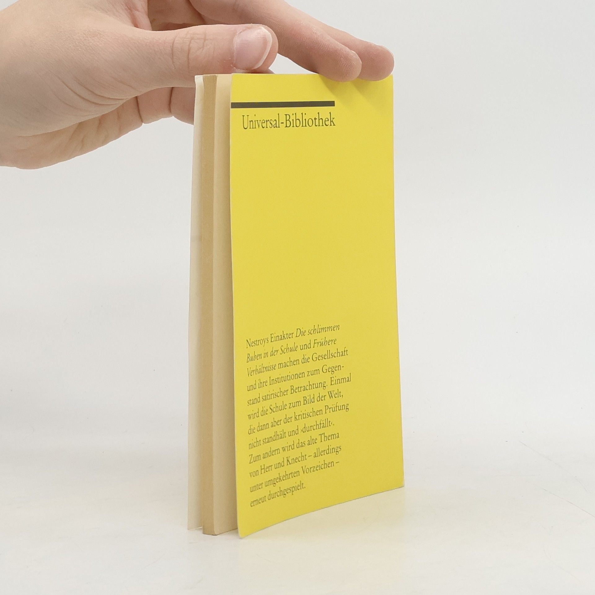 Nestroys Einakter Die schlimmen Buben in der Schule und Frühere Verhältnisse machen die Gesellschaft und ihre Institutionen zum Gegenstand satirischer Betrachtung. Einmal wird die Schule zum Bild der Welt, die dann aber der kritischen Prüfung nicht standhält und ›durchfällt‹. Zum anderen wird das alte Thema von Herr und Knecht – allerdings unter umgekehrten Vorzeichen – erneut durchgespielt.