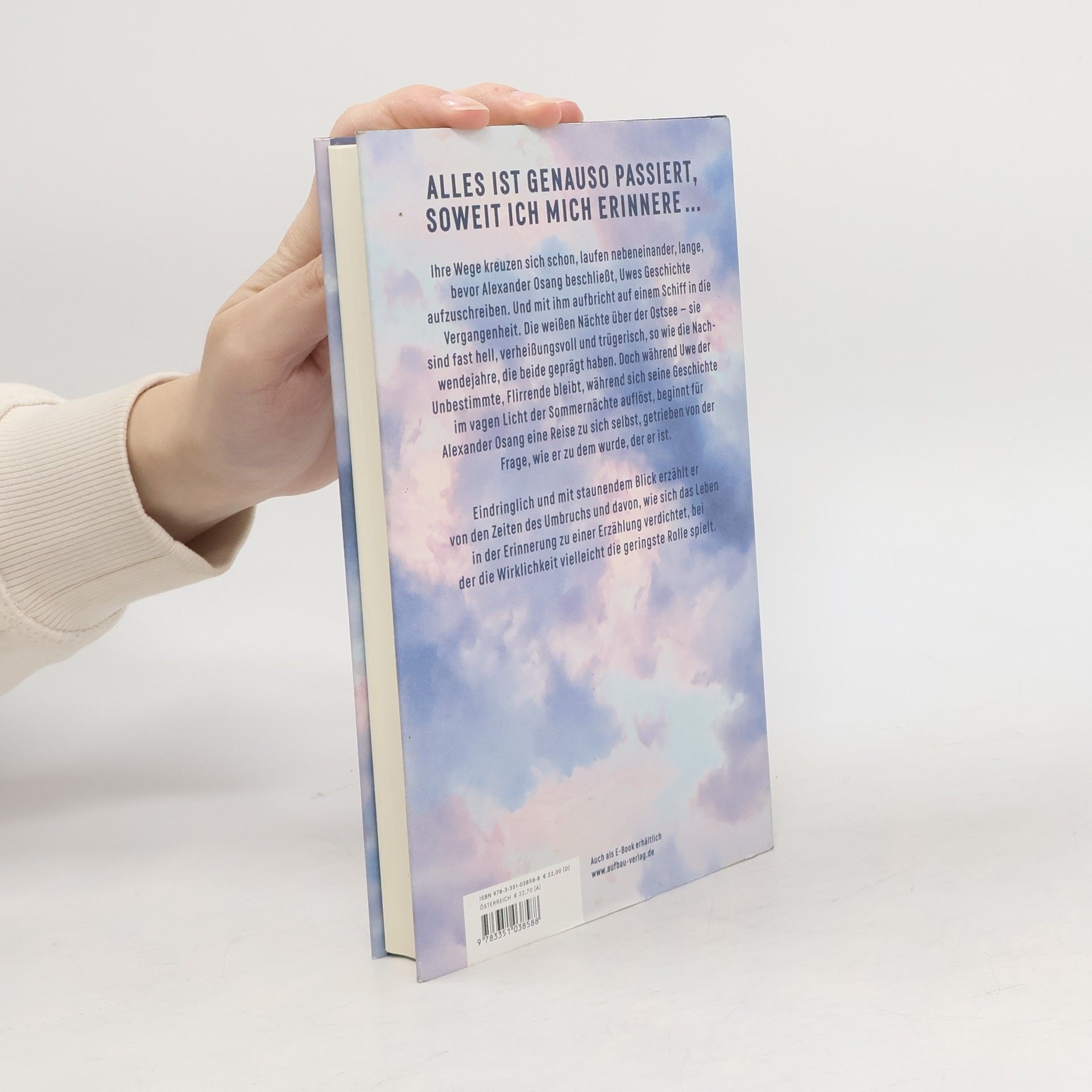 Alles ist genauso passiert, soweit ich mich erinnere … Ihre Wege kreuzen sich schon, laufen nebeneinander, lange, bevor Alexander Osang beschließt, Uwes Geschichte aufzuschreiben. Und mit ihm aufbricht auf einem Schiff in die Vergangenheit. Die weißen Nächte über der Ostsee - sie sind fast hell, verheißungsvoll und trügerisch, so wie die Nachwendejahre, die beide geprägt haben. Doch während Uwe der Unbestimmte, Flirrende bleibt, während sich seine Geschichte im vagen Licht der Sommernächte auflöst, beginnt für Alexander Osang eine Reise zu sich selbst, getrieben von der Frage, wie er zu dem wurde, der er ist. Eindringlich und mit staunendem Blick erzählt er von den Zeiten des Umbruchs und davon, wie sich das Leben in der Erinnerung zu einer Erzählung verdichtet, bei der die Wahrheit vielleicht die geringste Rolle spielt.